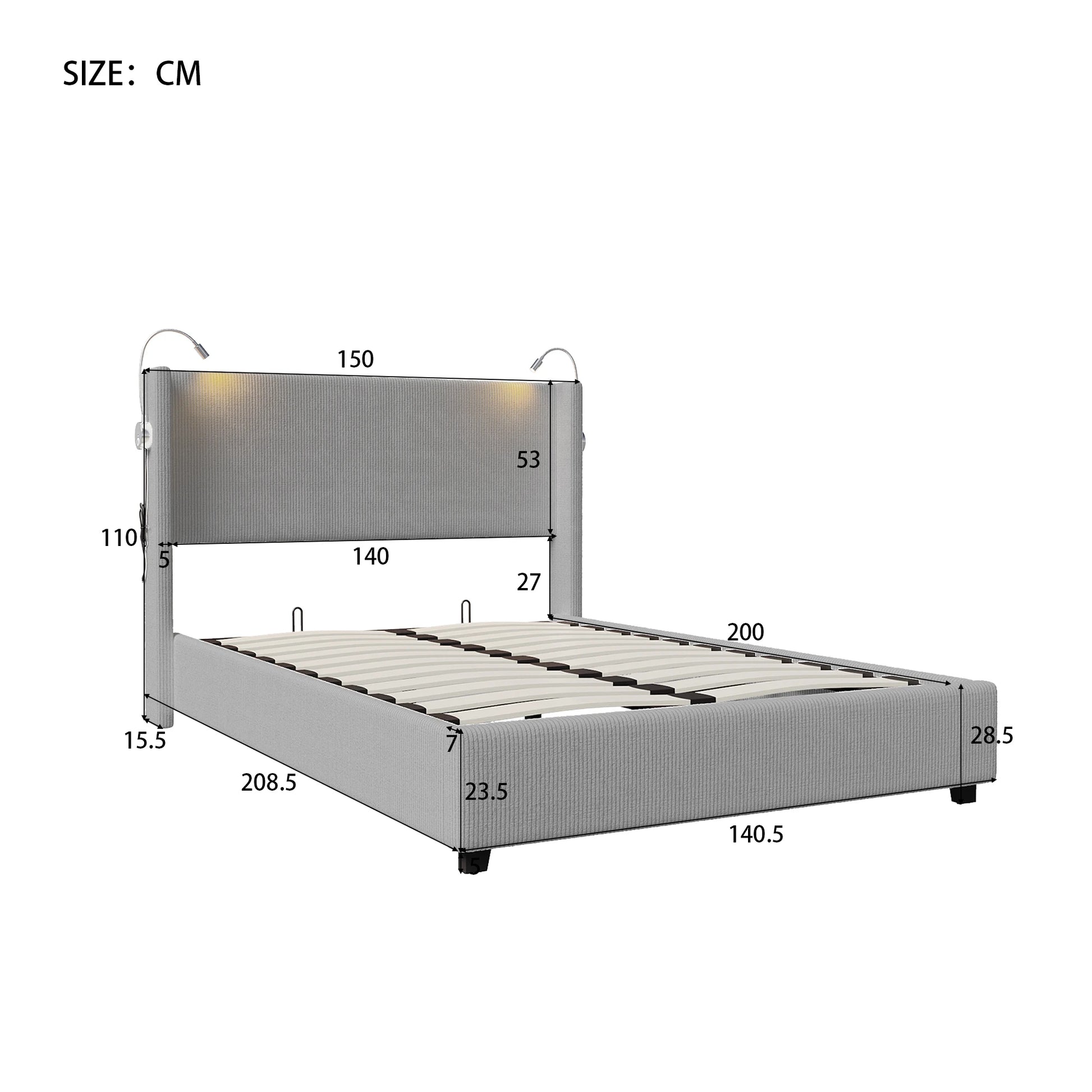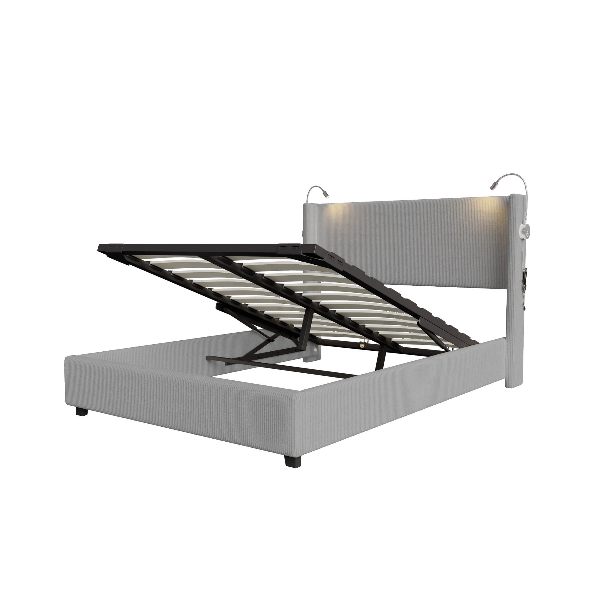 140 x 200 cm großes Cord-Doppelbett mit Stauraum, Bettkopf mit Leselicht, zwei USB-Ladeanschlüssen, ohne Matratze