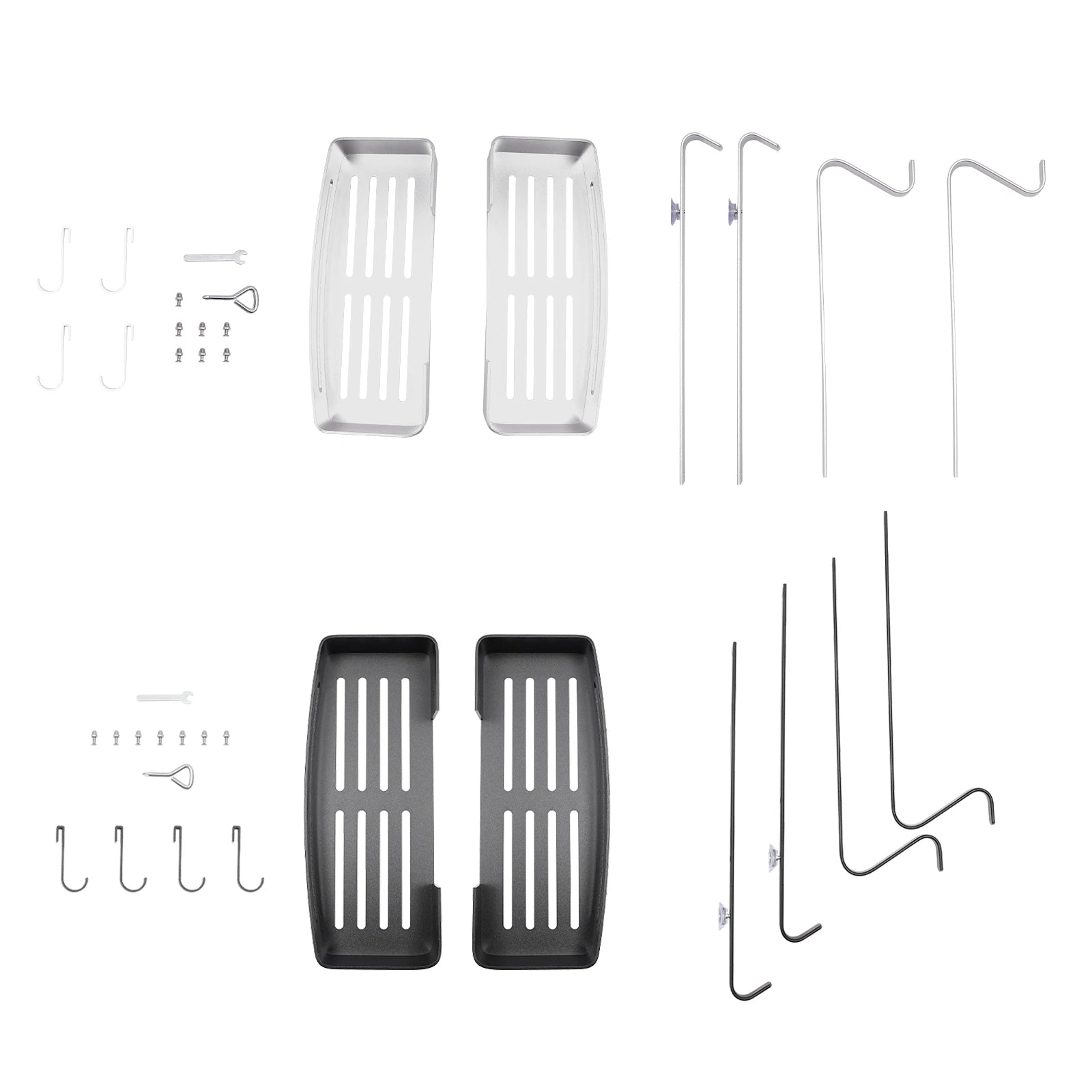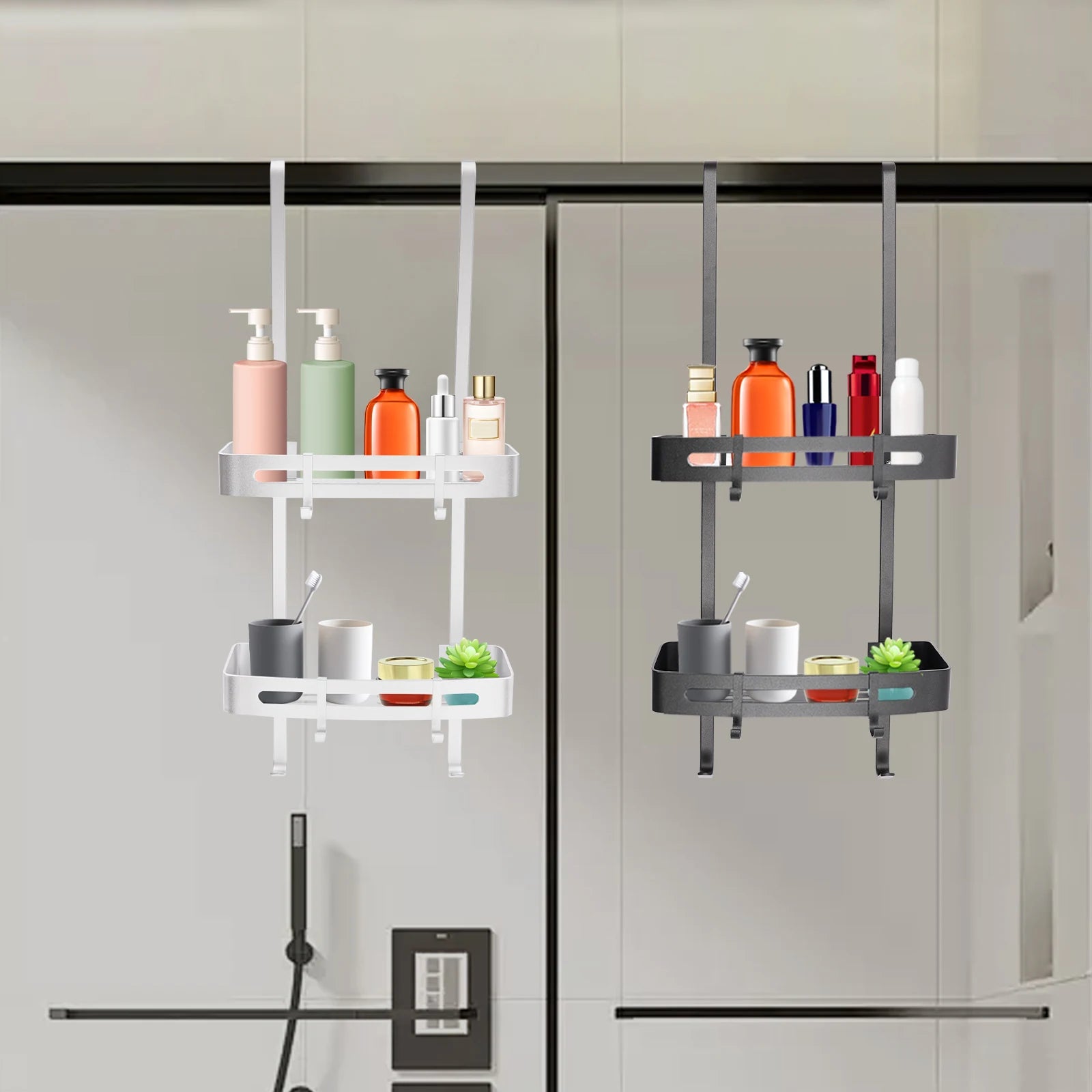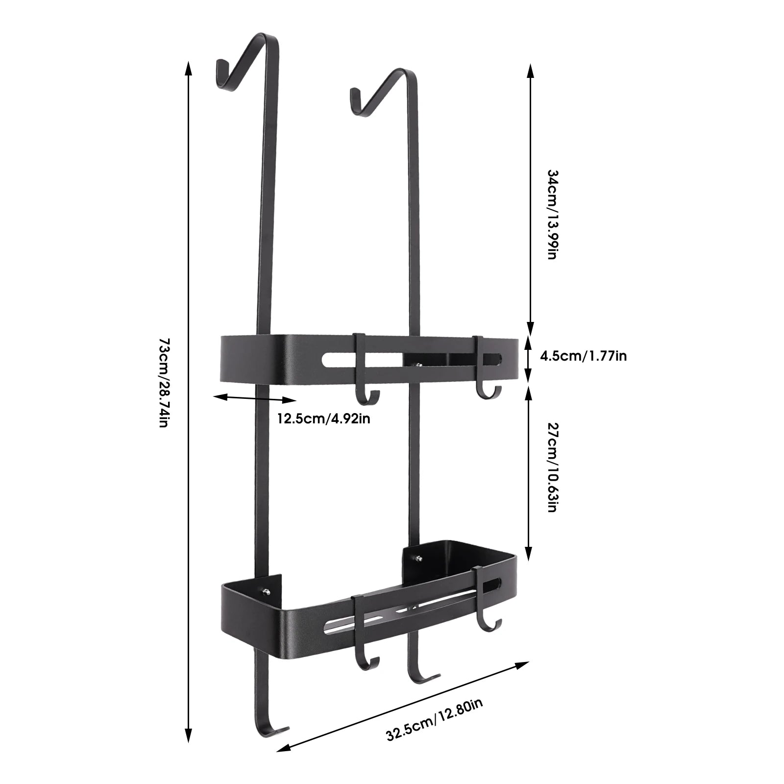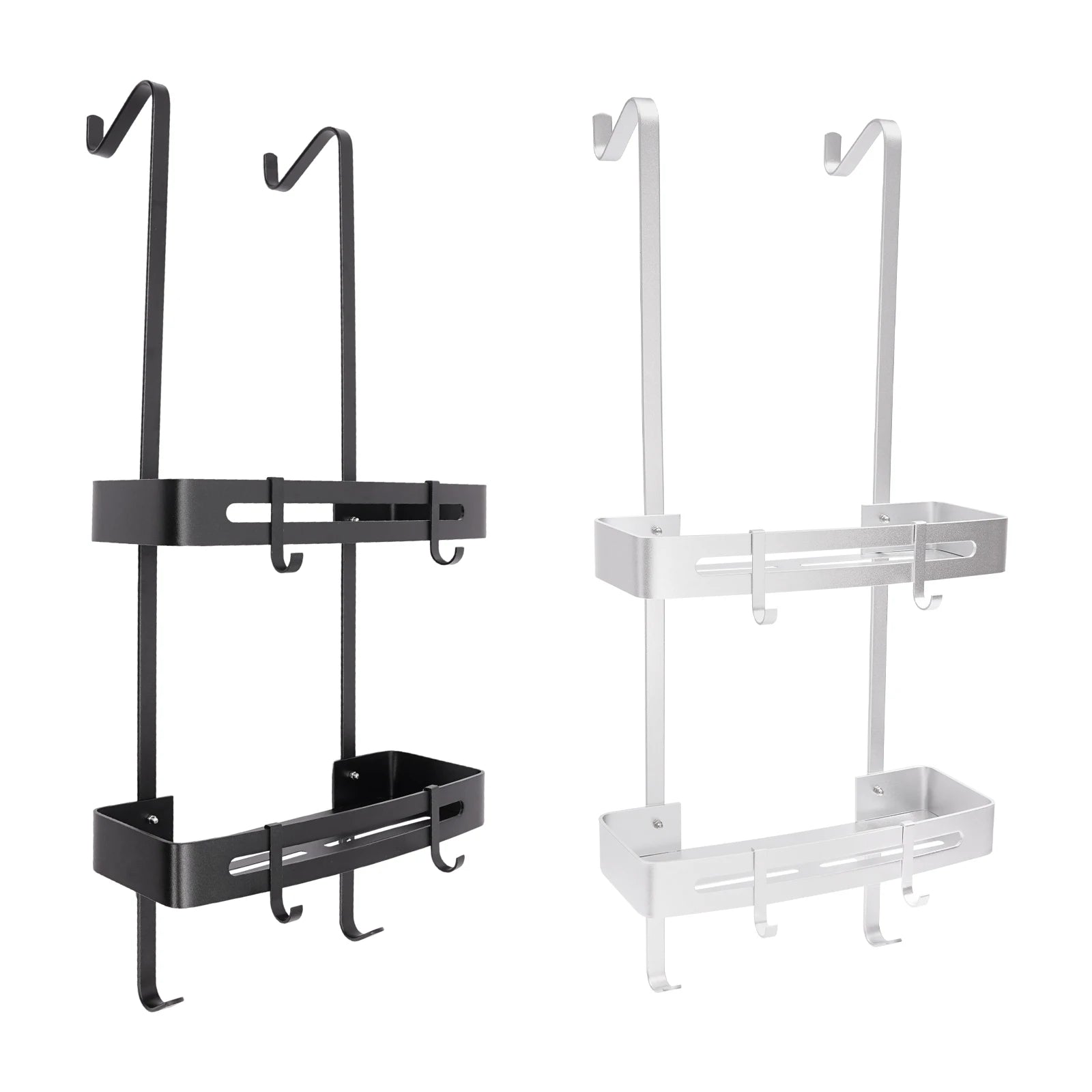 2-stufiges Badezimmerregal, hängendes Duschregal, silberfarbenes/schwarzes Regal, 6 Haken für Badezimmer, Küche, Wohnzimmer
