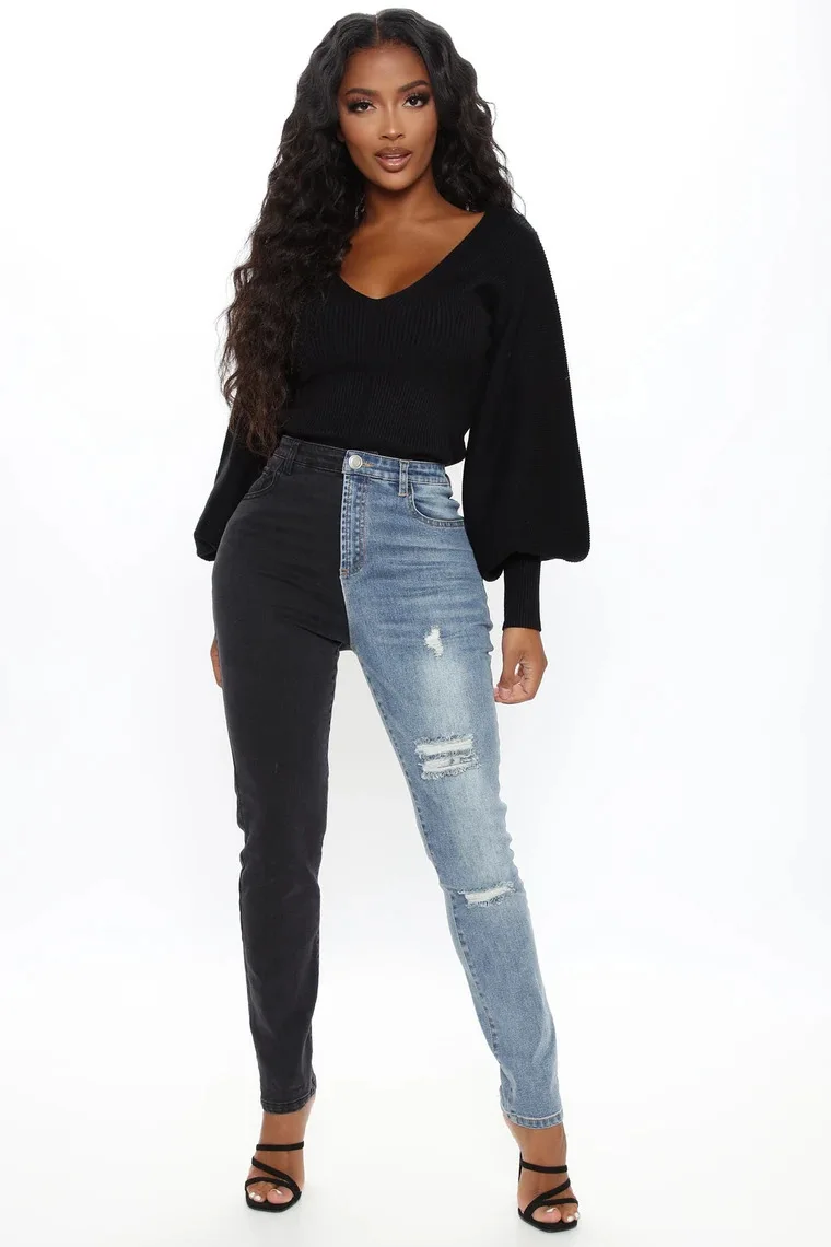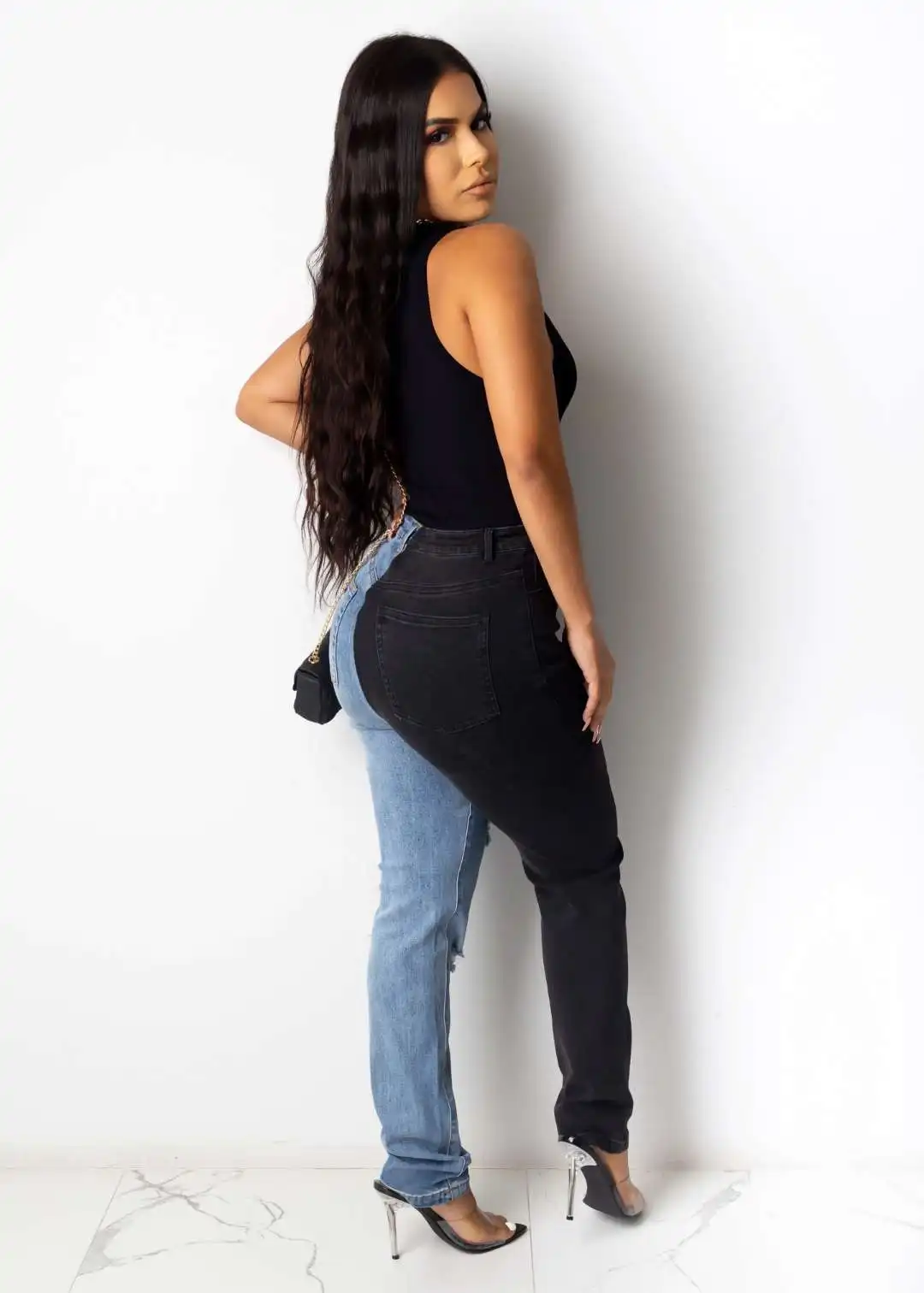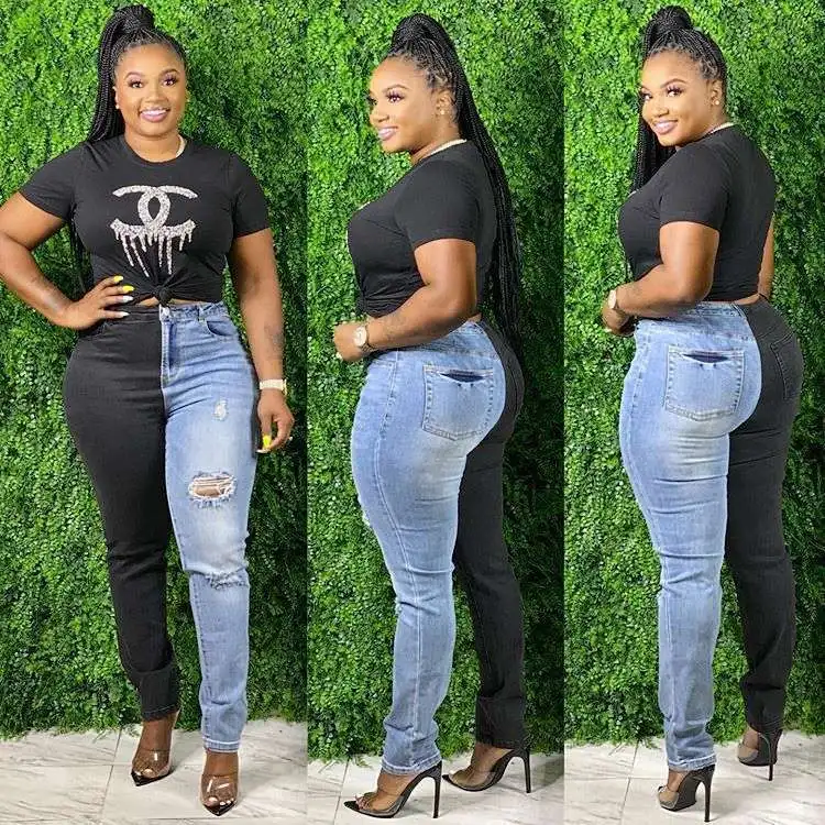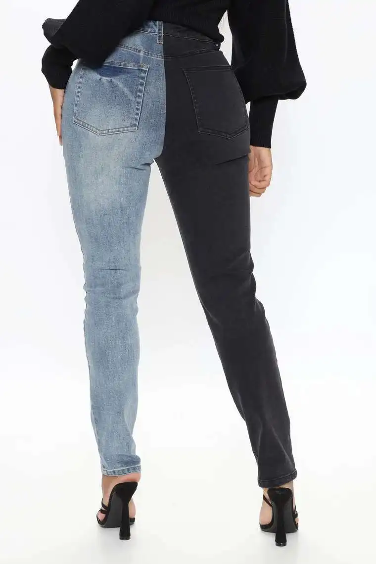 2021 Hot Sale Black Blue Contrast Color High Waist Jeans for Women Fashion Hole Stretch Denim Pencil Pants Hipster Trousers