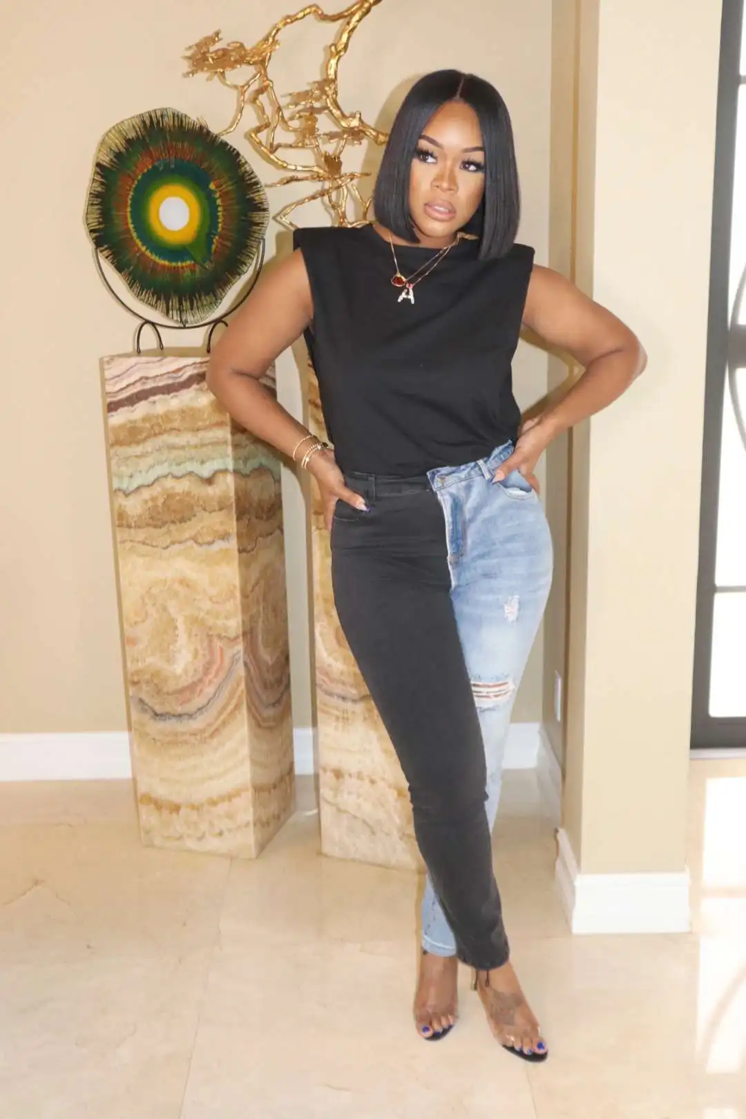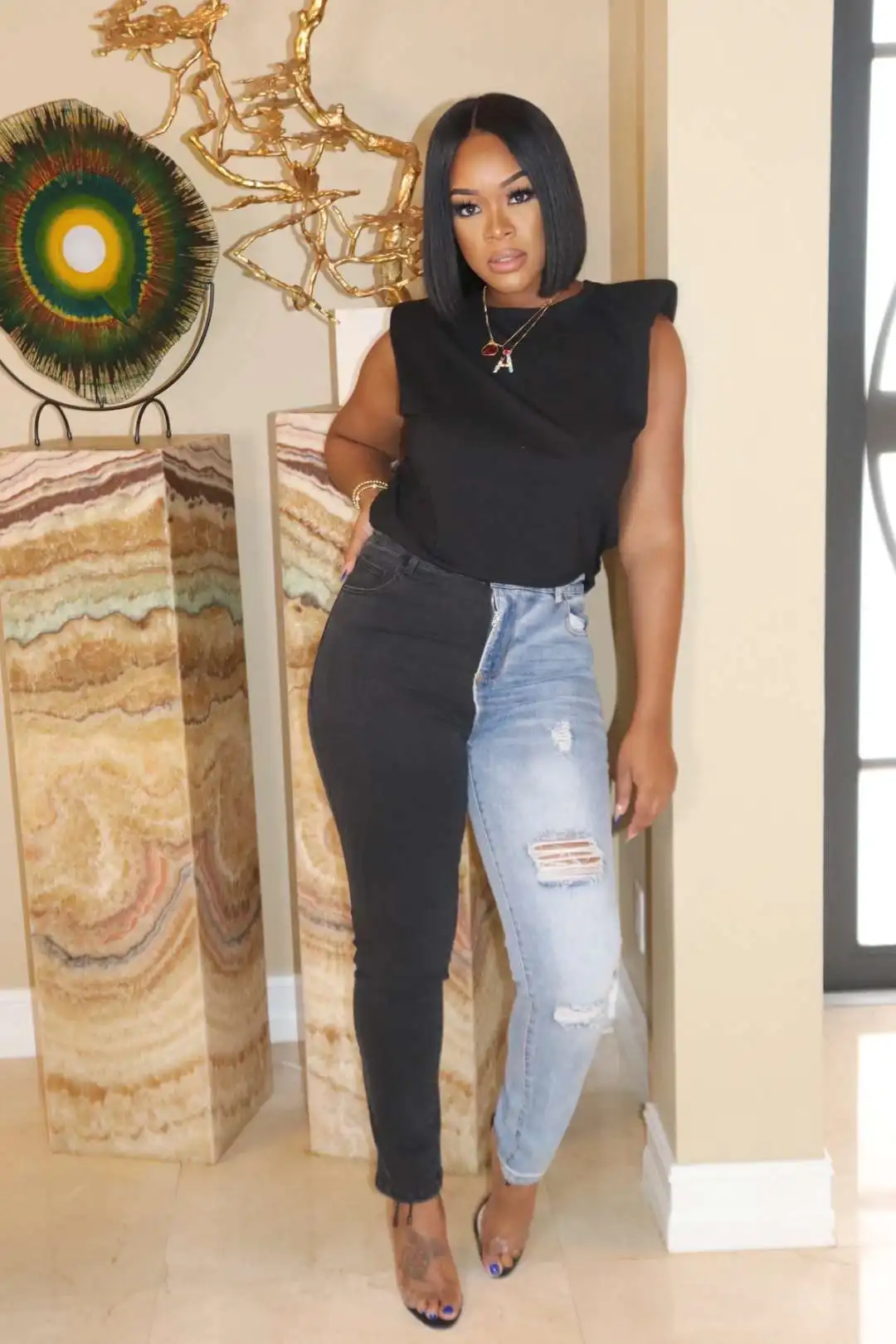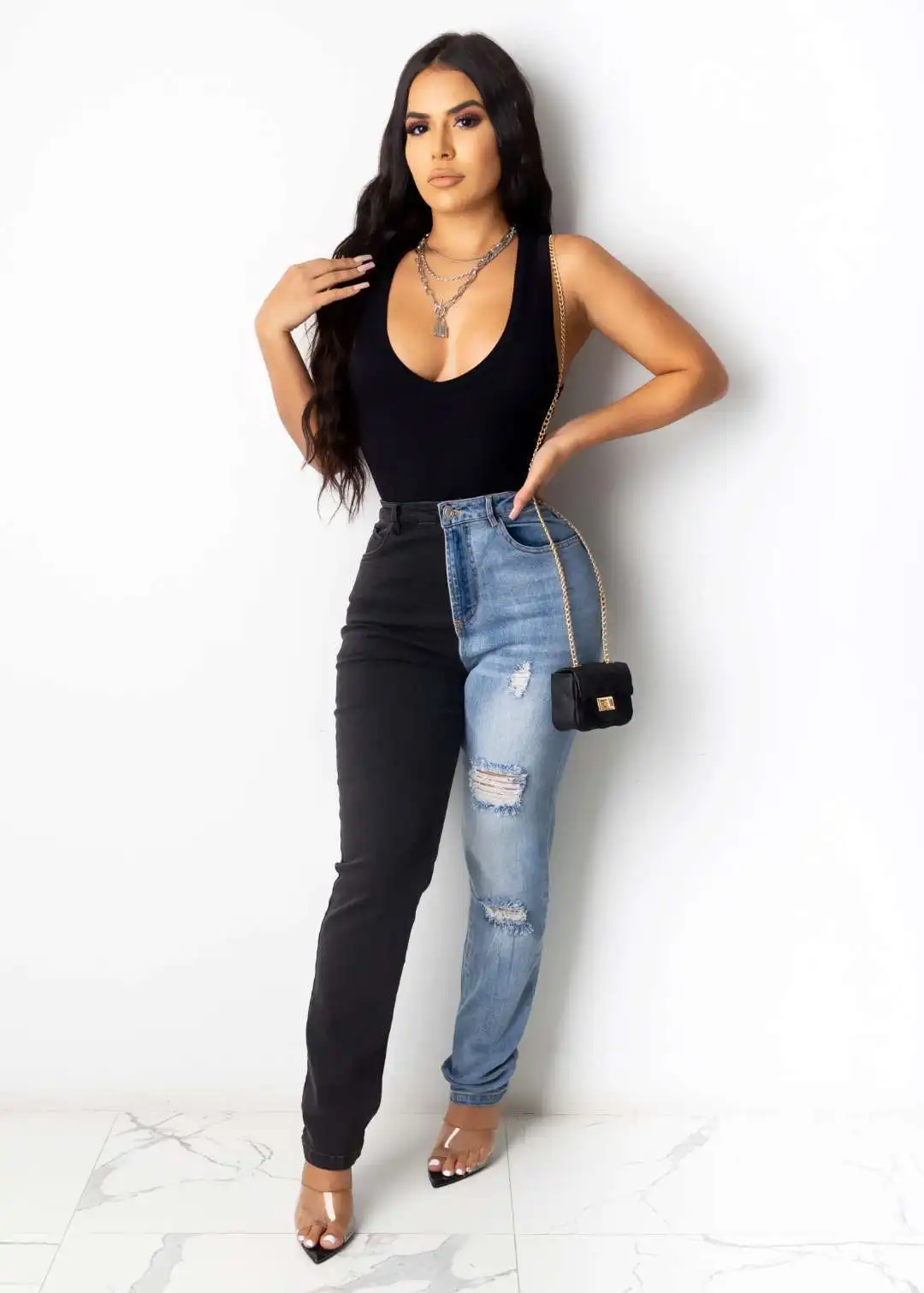 2021 Hot Sale Black Blue Contrast Color High Waist Jeans for Women Fashion Hole Stretch Denim Pencil Pants Hipster Trousers