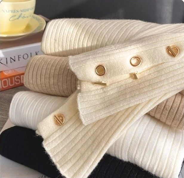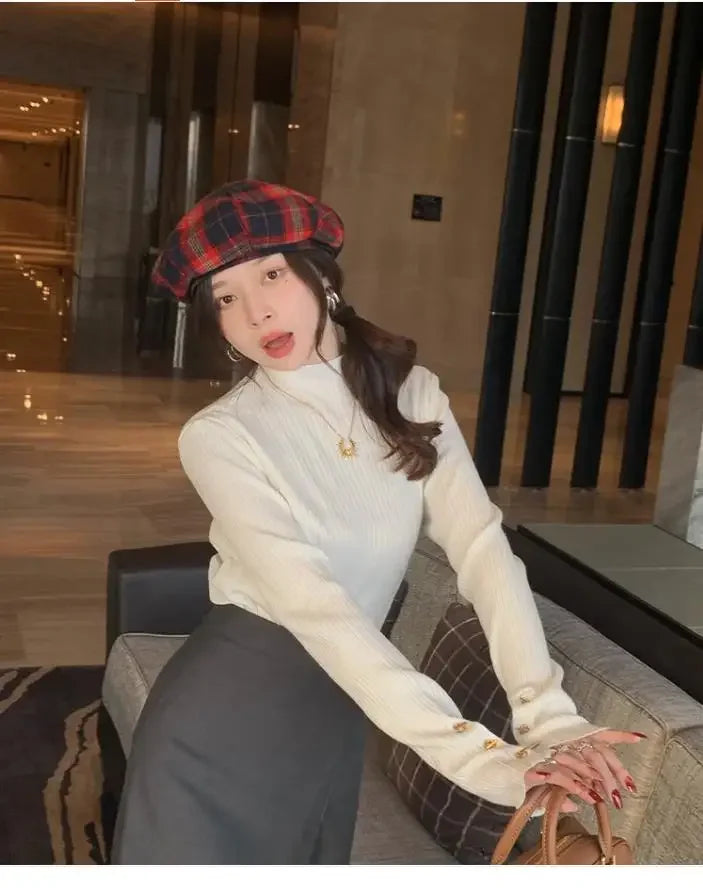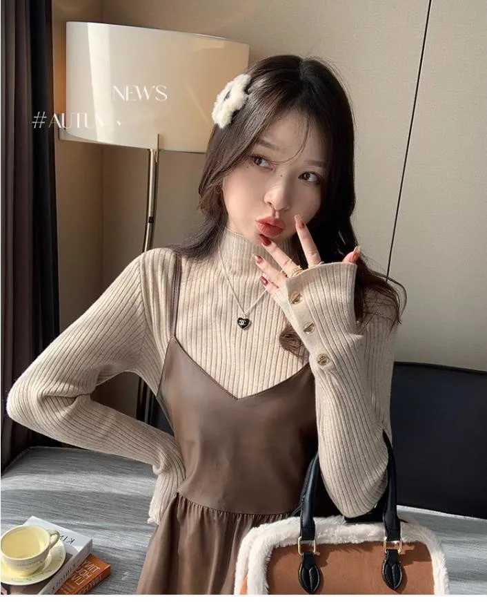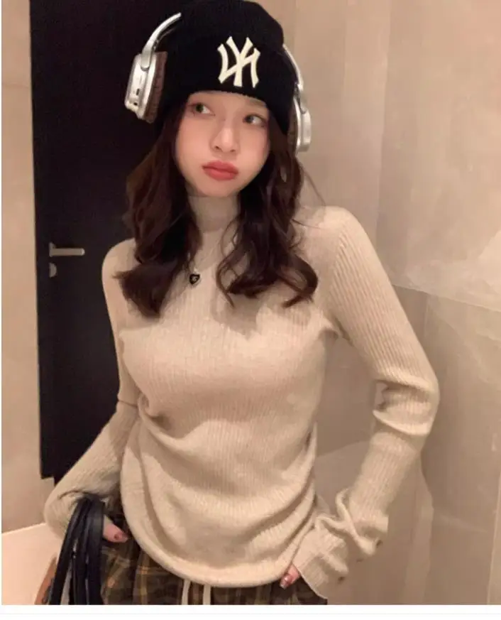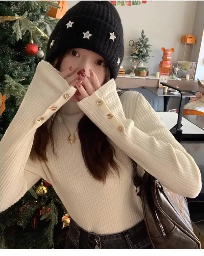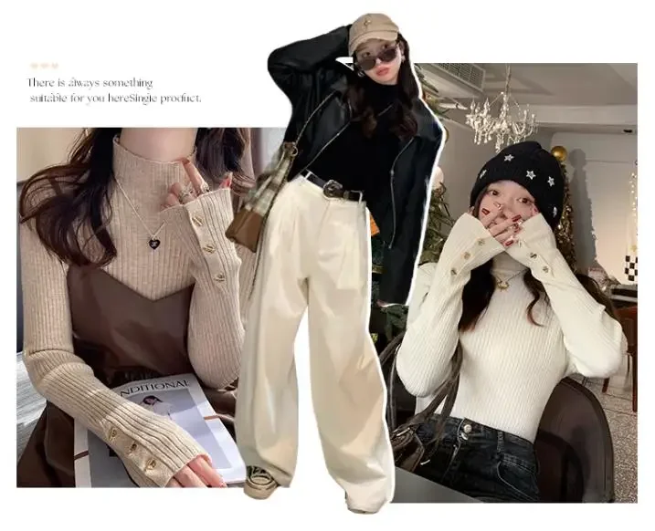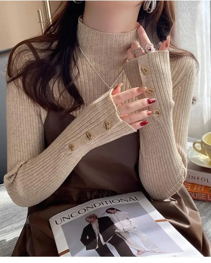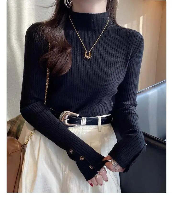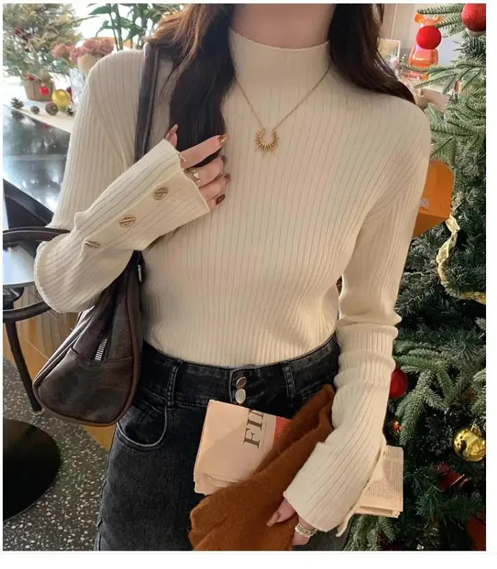 2025, weibliche Casual Tops Pullover Frauen Herbst Winter Gestrickte Dünne Pullover Feste Taste Volle Hülse Halb Hohen Kragen Pullover