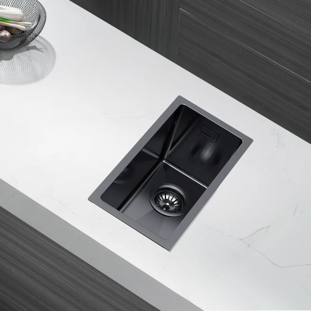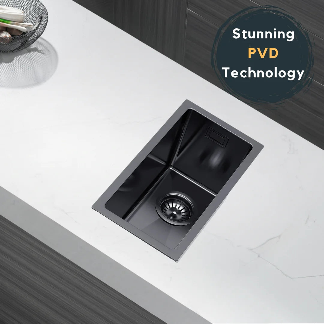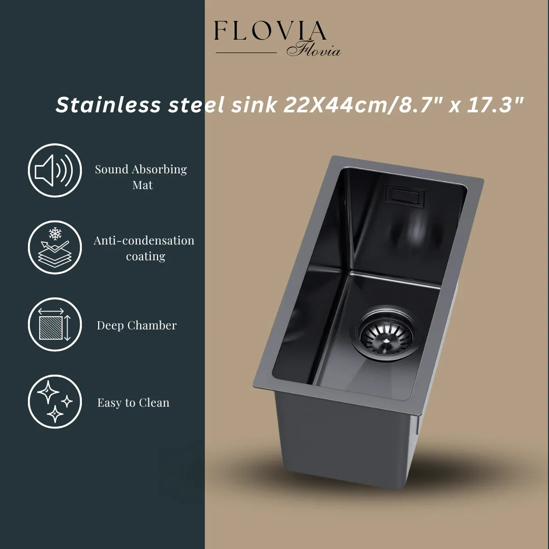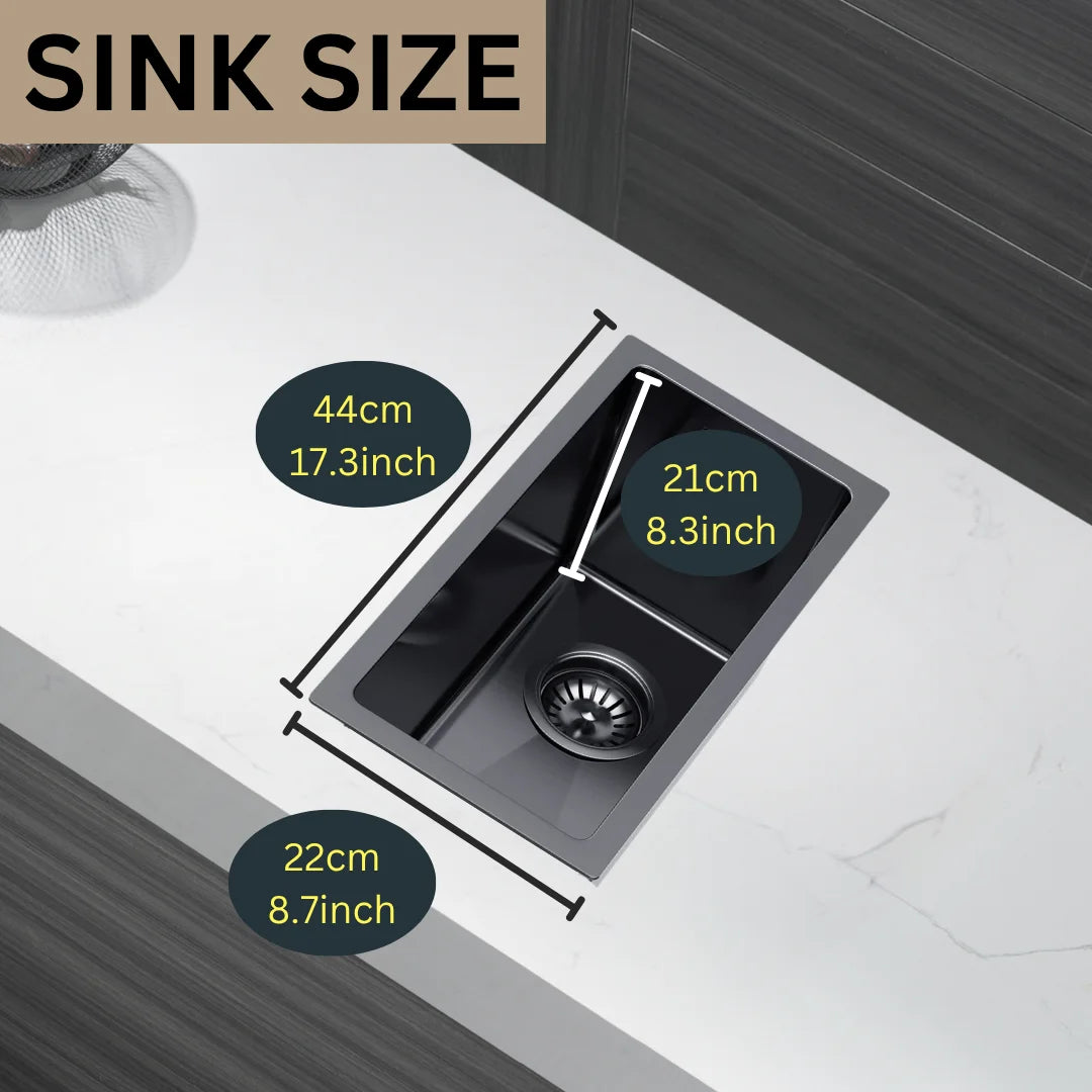 22 x 44 cm große Graphit-Edelstahl-Küchenspüle – kein Wasserhahnloch, PVD-beschichtet, oben/unter/unten/untersetzbar, mit Überlauf- und Abflussset