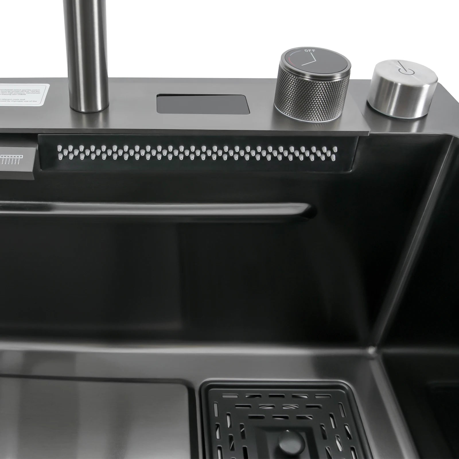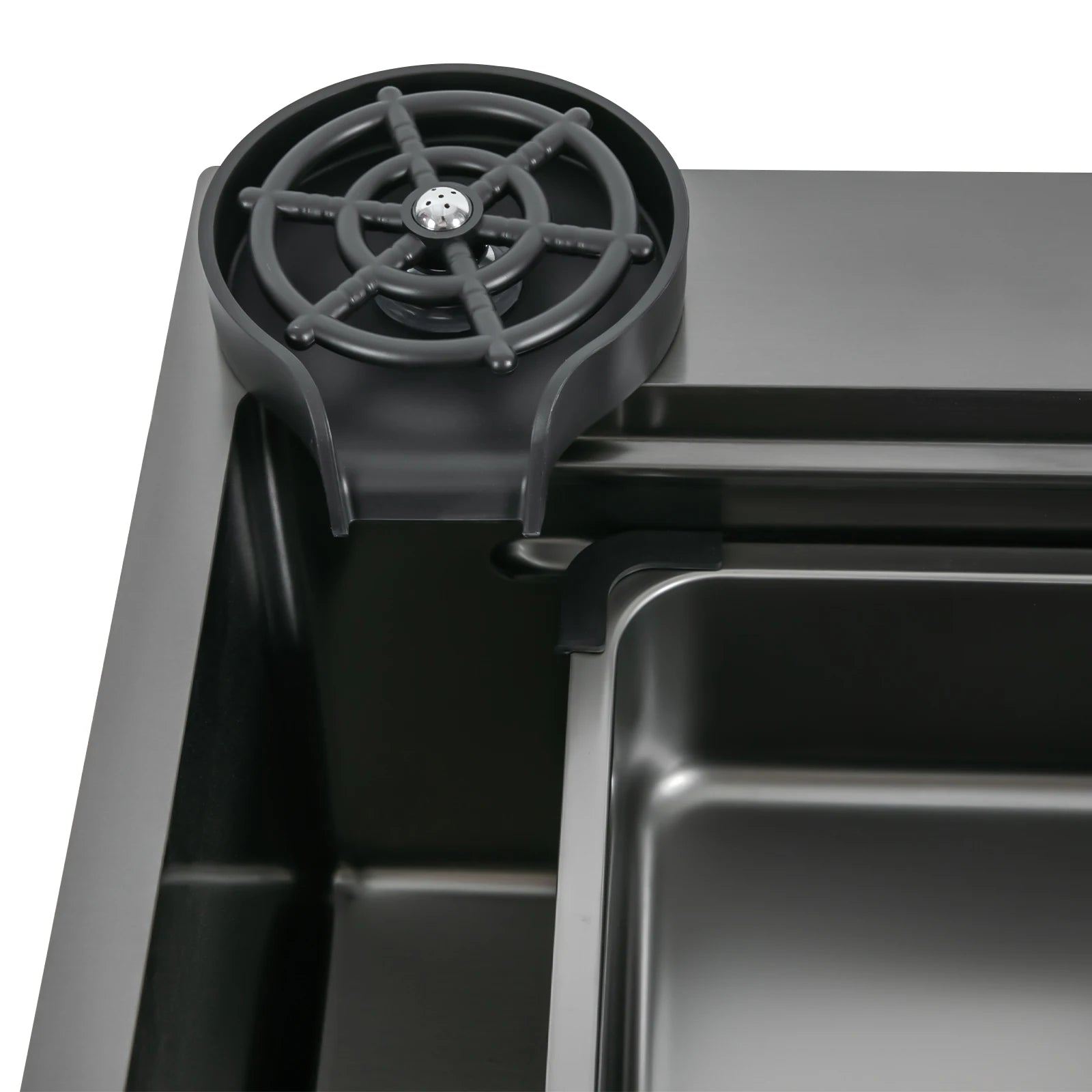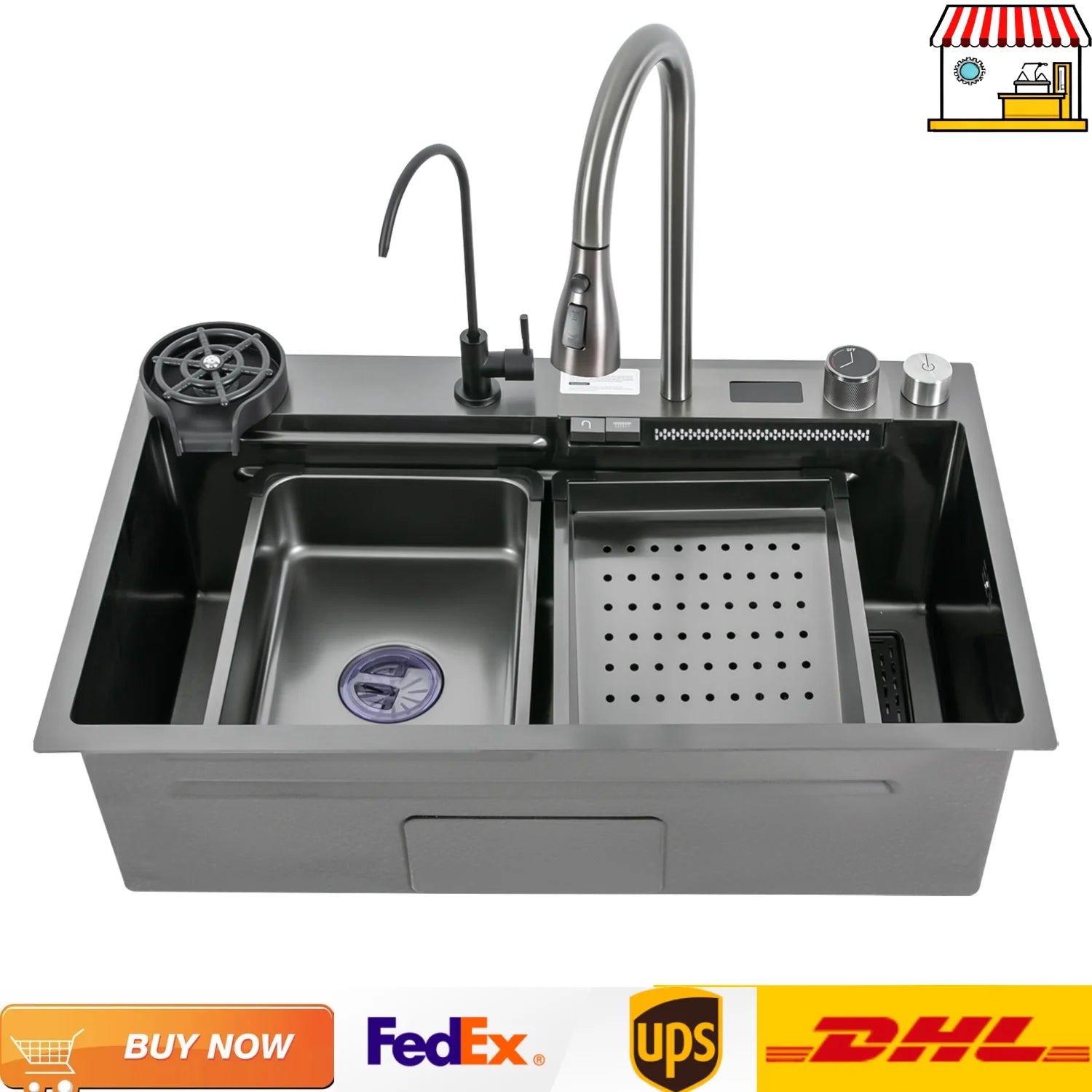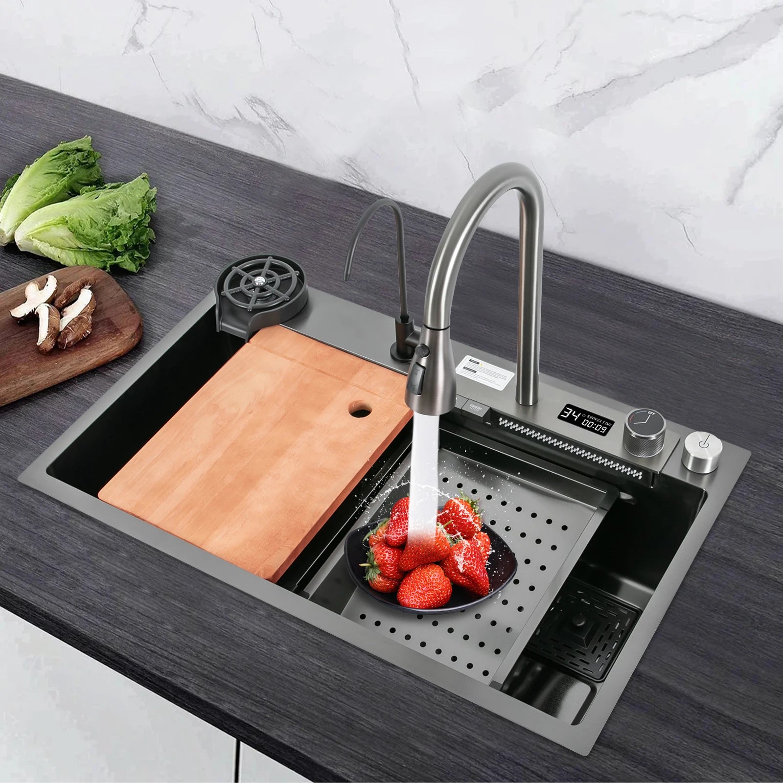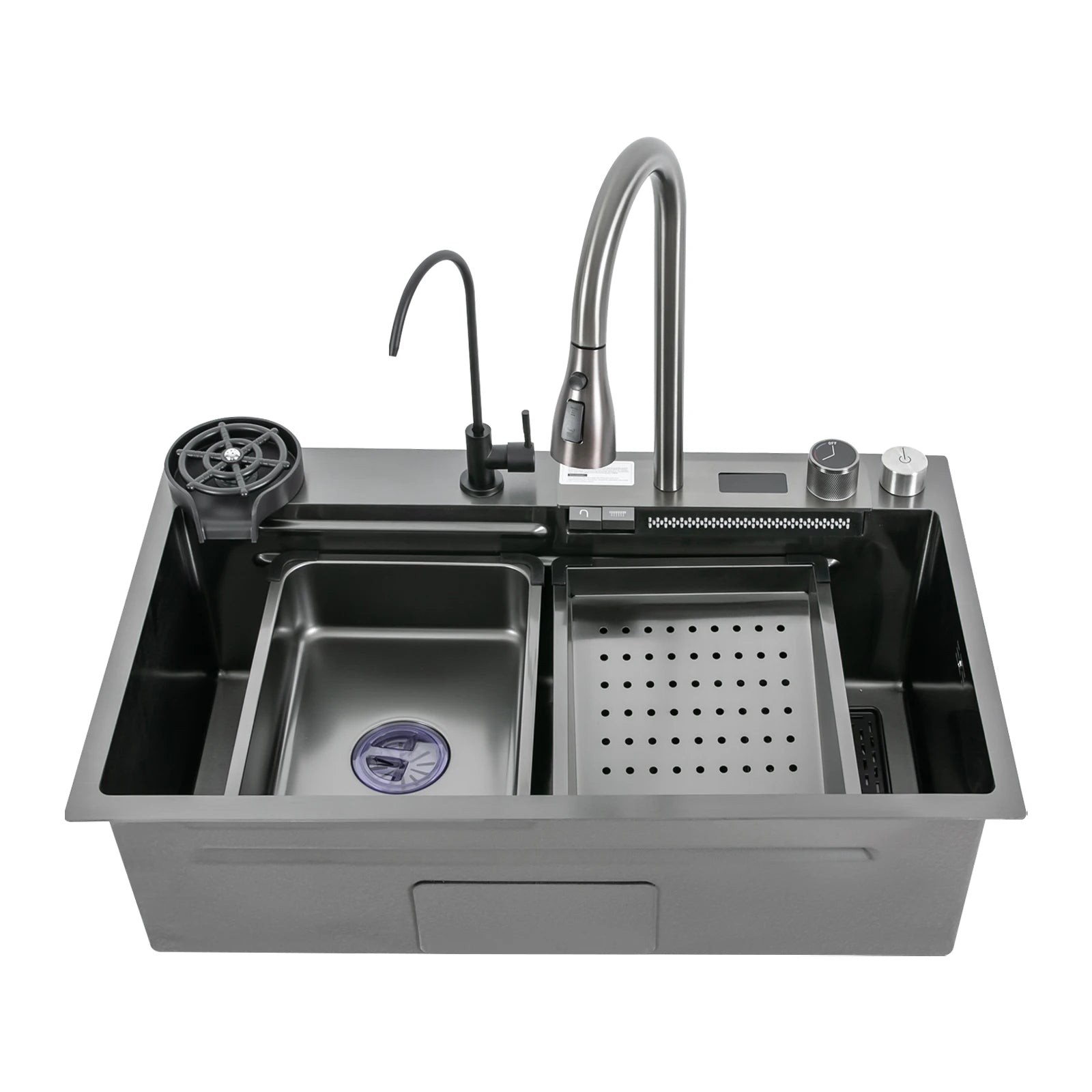 75 * 46 cm Edelstahl-Wasserfall-Küchenspüle mit ausziehbarem Wasserhahn, Seifenspender, Tassenwascher