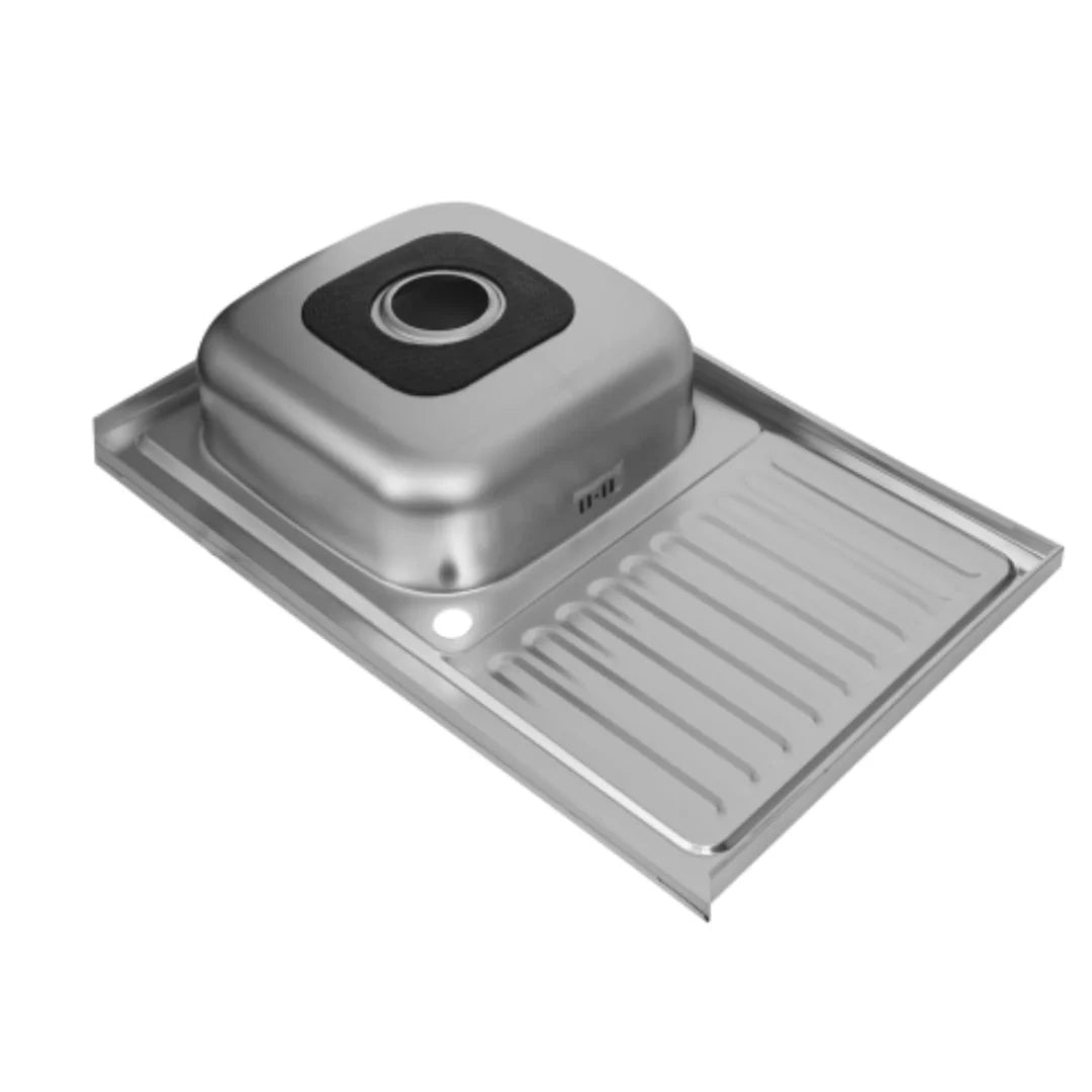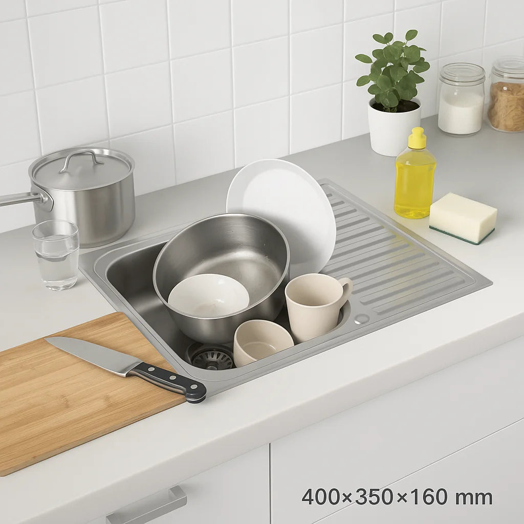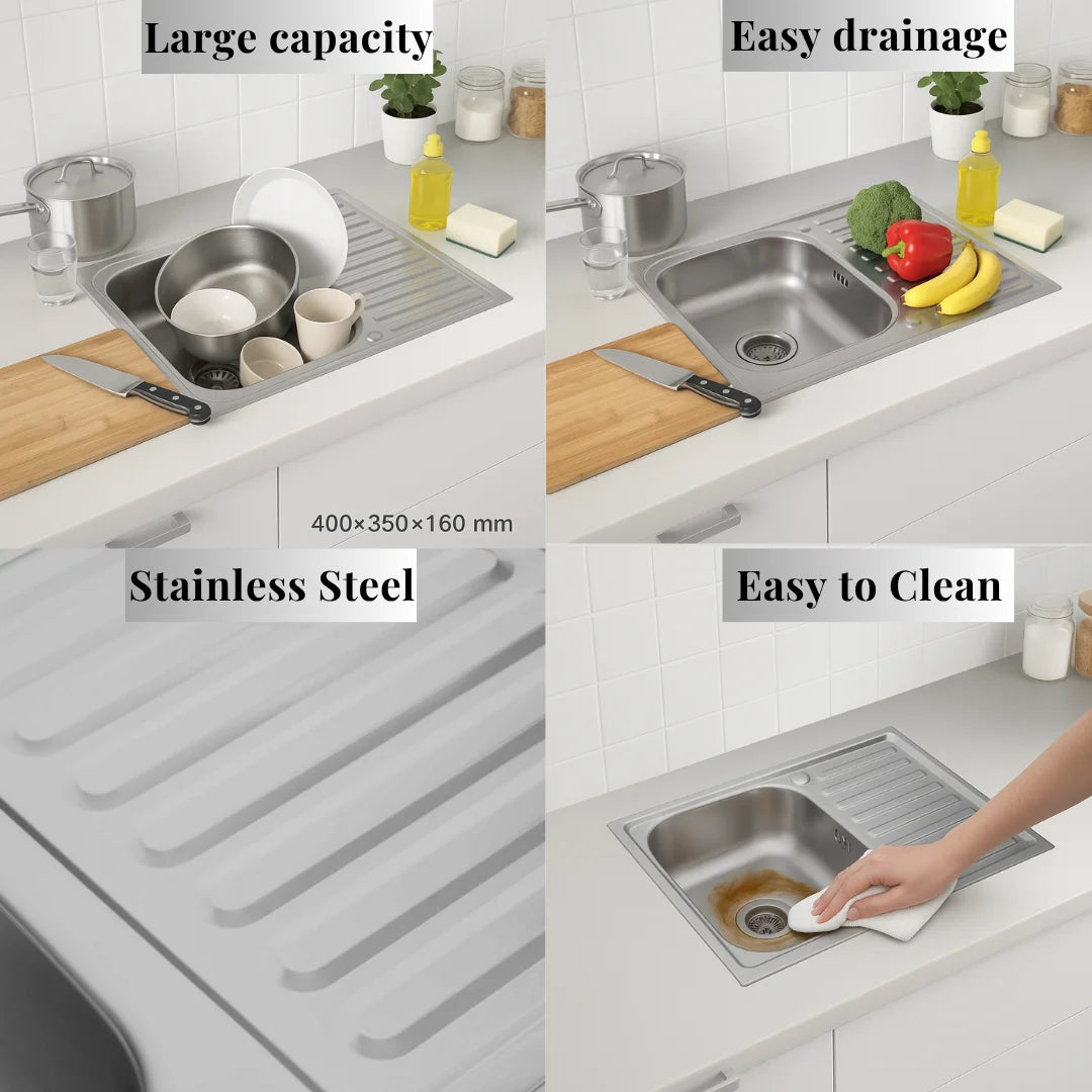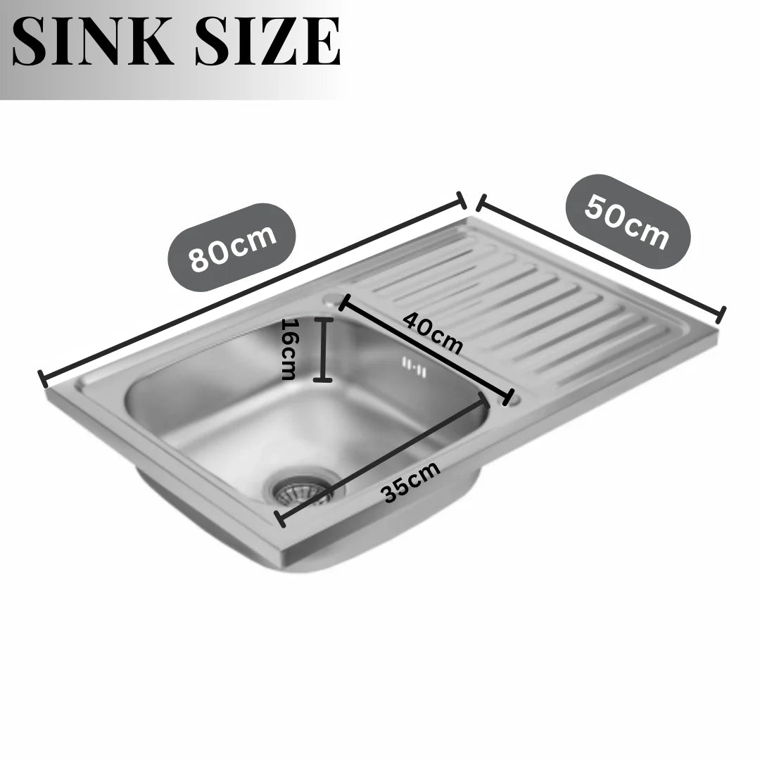 80 x 50 cm große Küchenspüle aus Edelstahl, Einzelschüssel mit Wasserhahnloch und Abtropffläche, Silber, linke/rechte Option