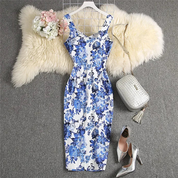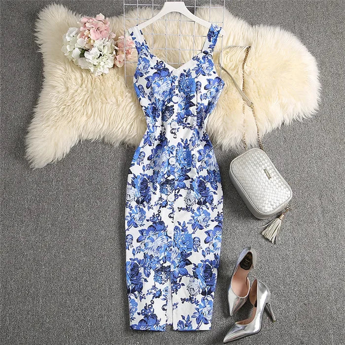 ALPHALMODA-Stretchy Tank-Kleid für Damen, schmales Baumwollkleid, einreihig, Blumendruck, elegant, Sommer, neu