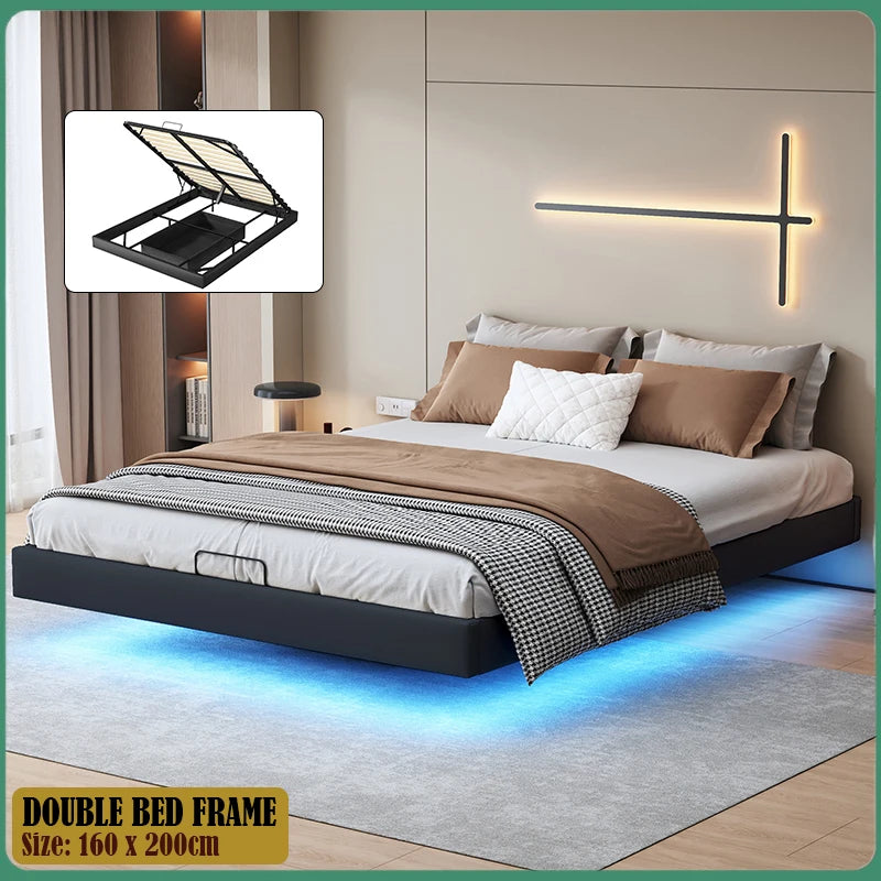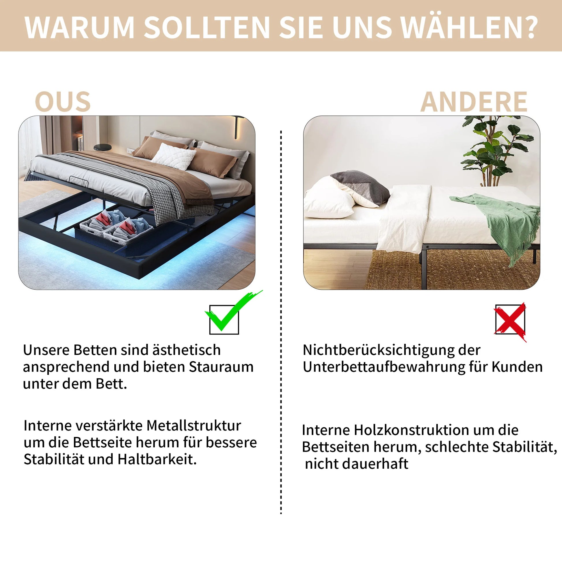 Anajqaqia Hängebettrahmen, 160 x 200 cm, schwarz, mit LED-Lichtleiste und Aufbewahrung der Gasdruckstange