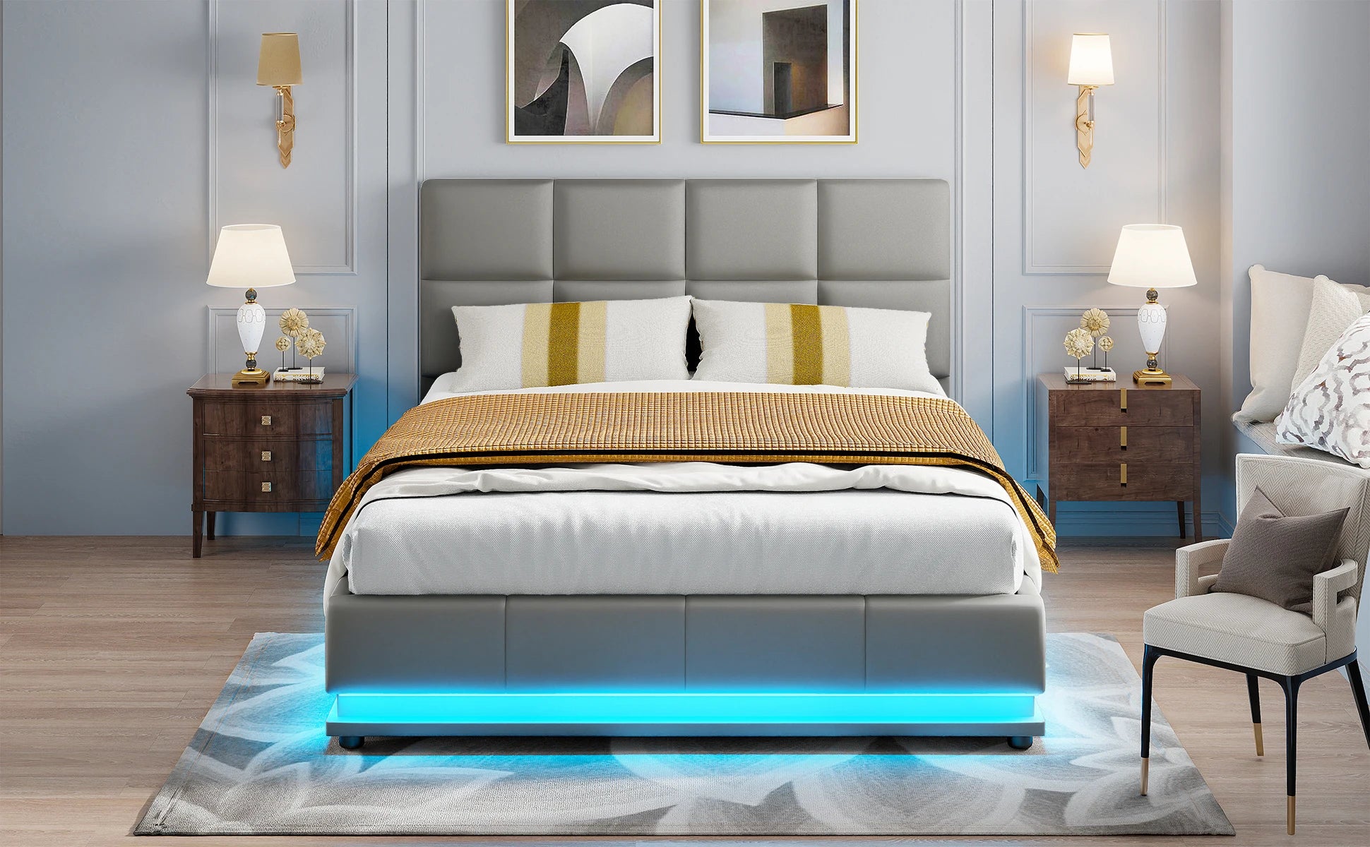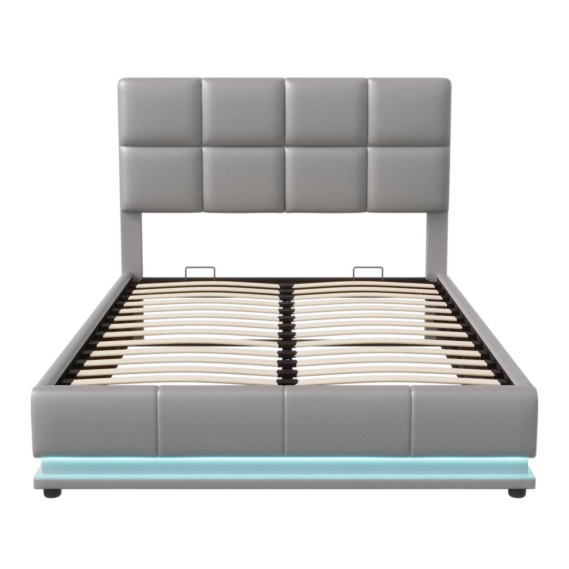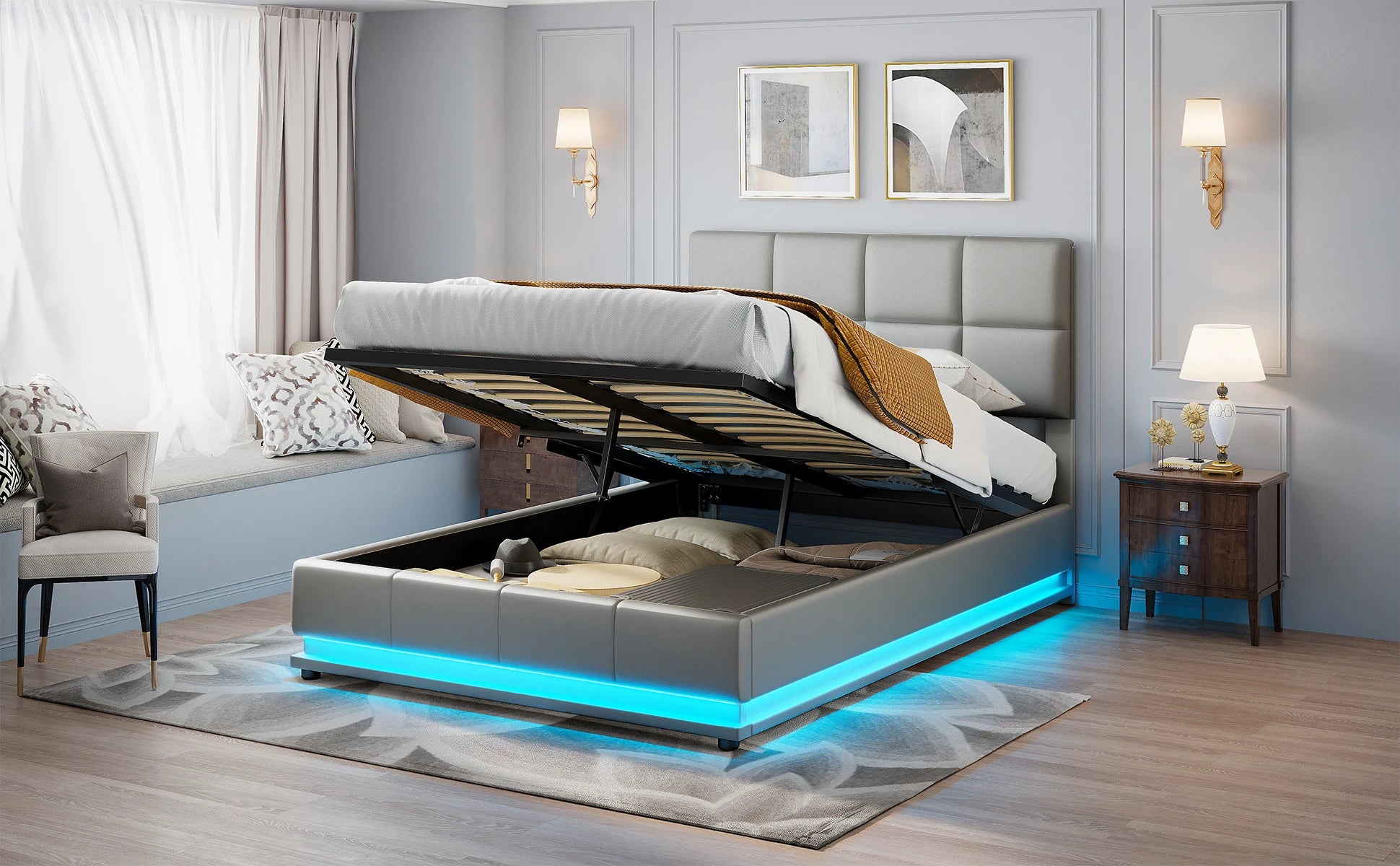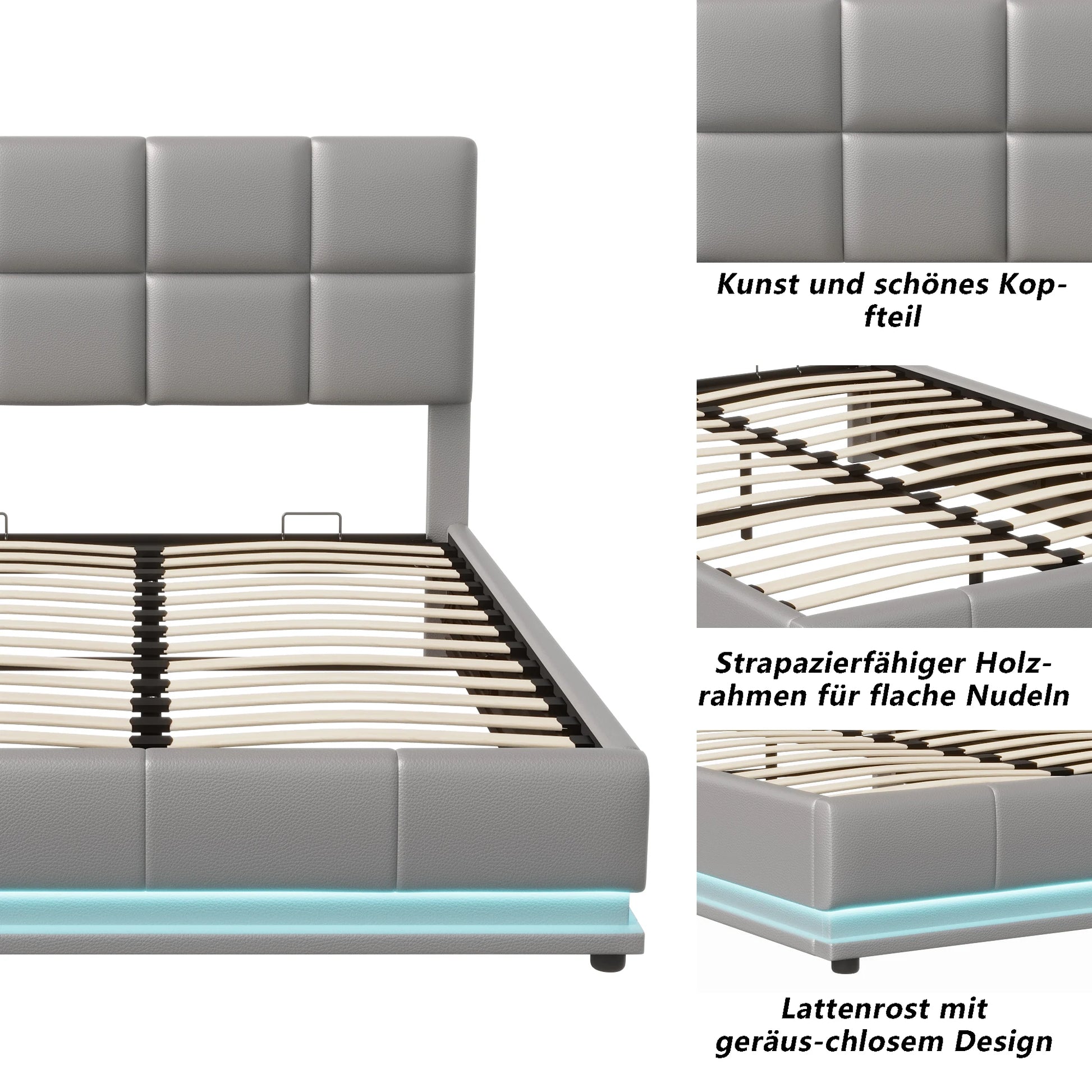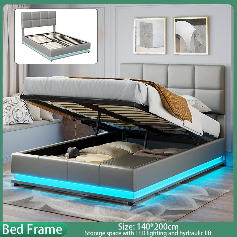 Anajqaqia Polsterbettgestell mit LED-Beleuchtung, 140 x 200 cm, mit hydraulischem Stauraum, Grau