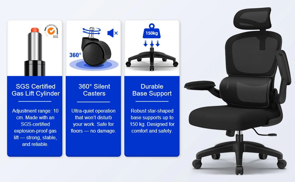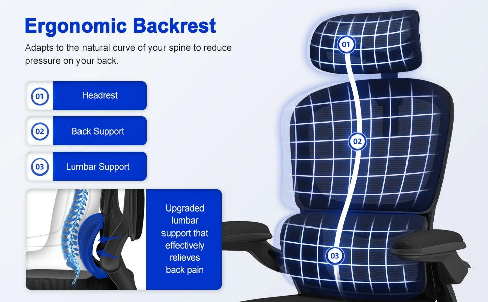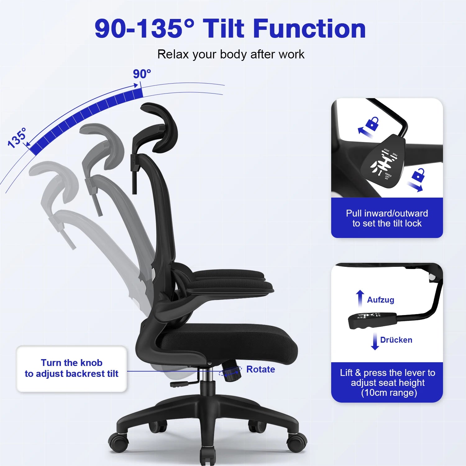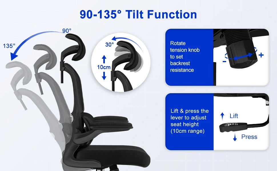 AUTHMIC Ergonomischer Bürostuhl -135 ° Liege- und höhenverstellbarer Sitz, klappbare Armlehnen, verstellbare Kopfstütze, Heimbürostuhl