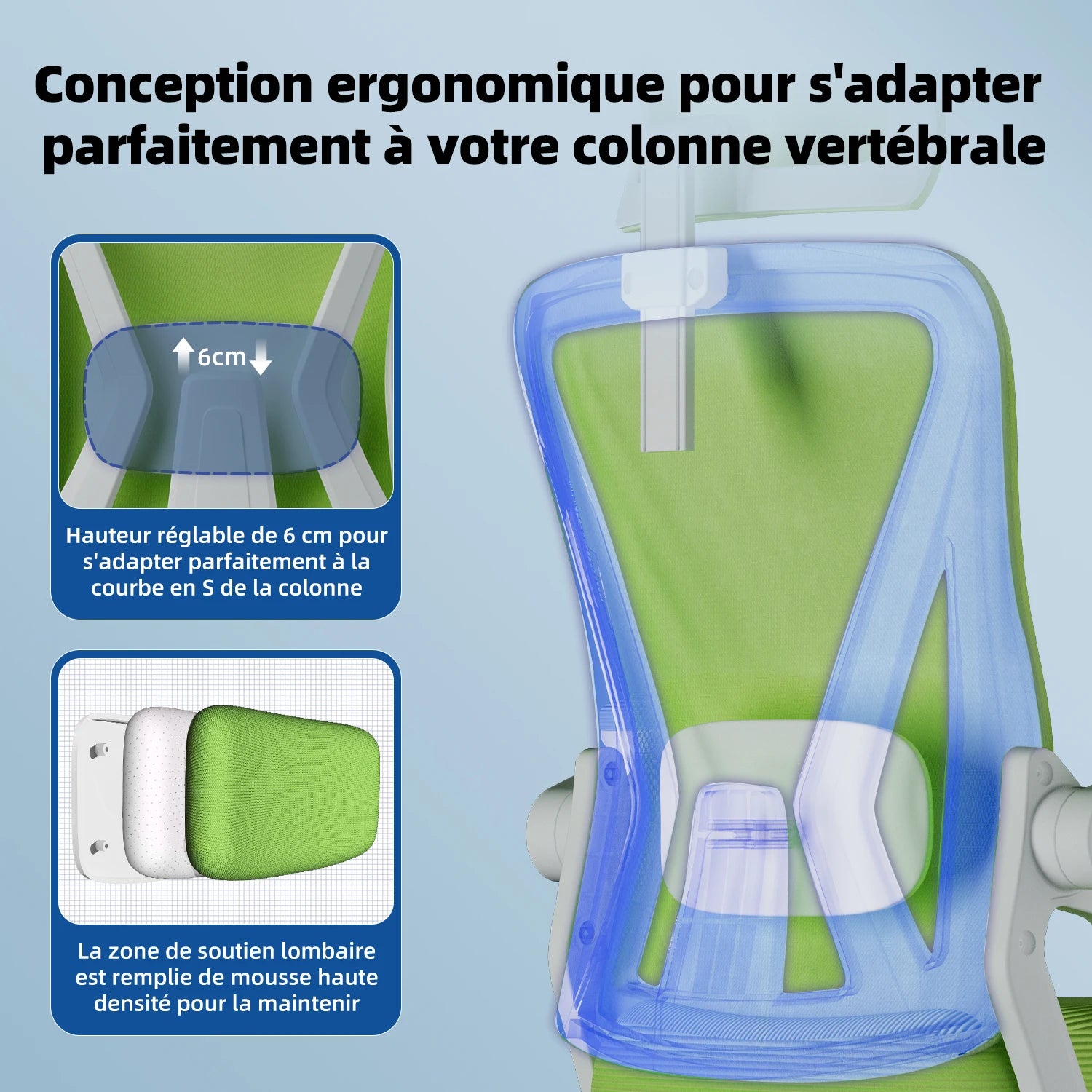 AUTHMIC Ergonomischer Bürostuhl (grün), verstellbare Kopfstütze, Lordosenstütze, drehbarer Schreibtischstuhl mit klappbaren Armlehnen