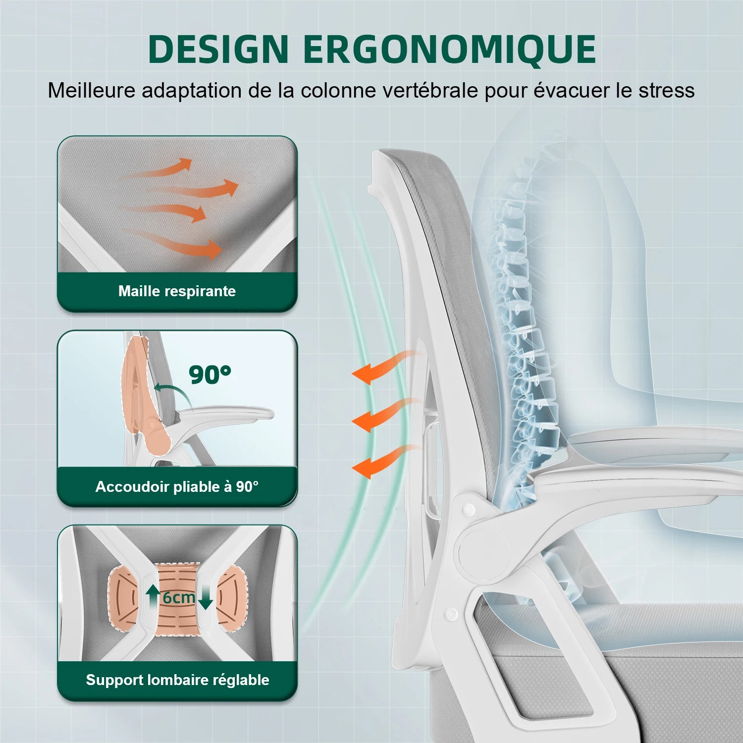 AUTHMIC Ergonomischer Netz-Bürostuhl mit Lordosenstütze, hochklappbaren Armlehnen, verstellbarer und höhenverstellbar für den Schreibtisch zu Hause – Grau