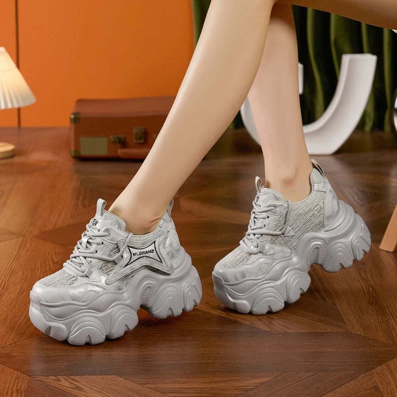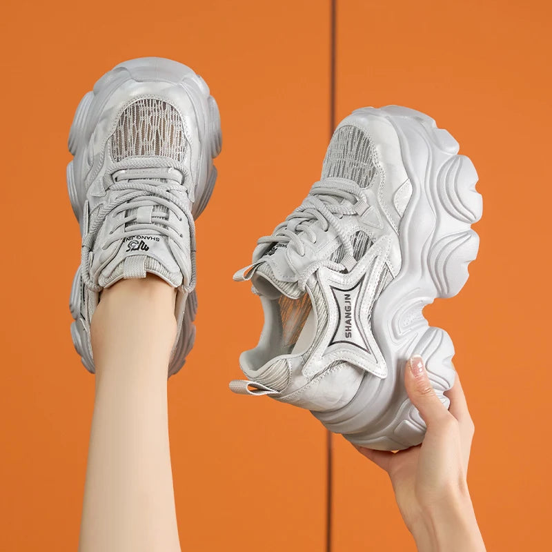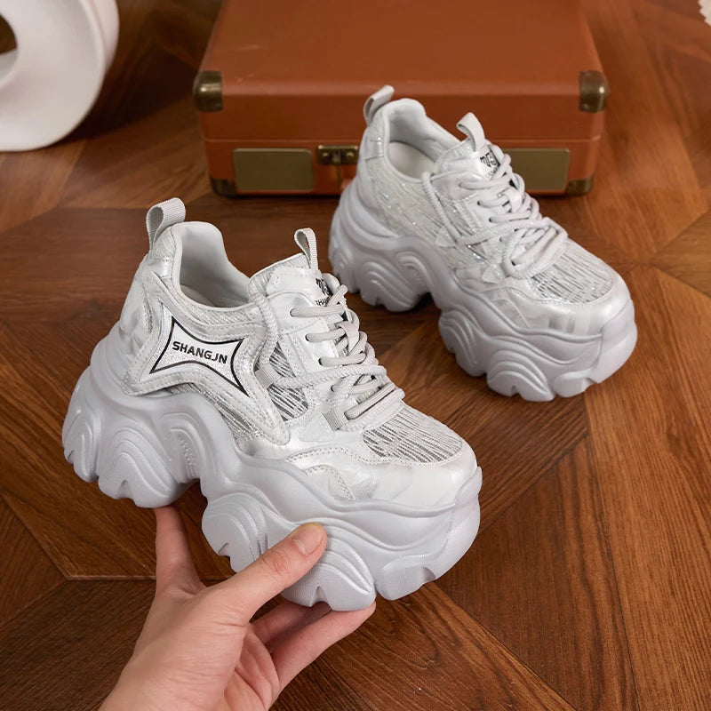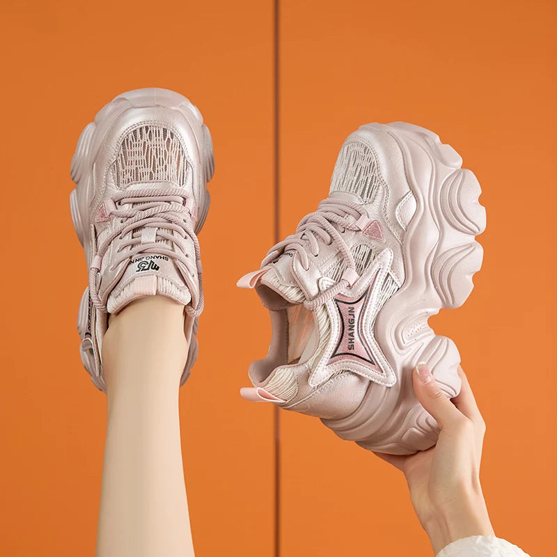 AUTUSPIN 10cm Pink Thick Soled Shoes for Summer Women Breathable Lace-up Ladies Sneakers Outdoor Casual Fashion Platform Shoes
