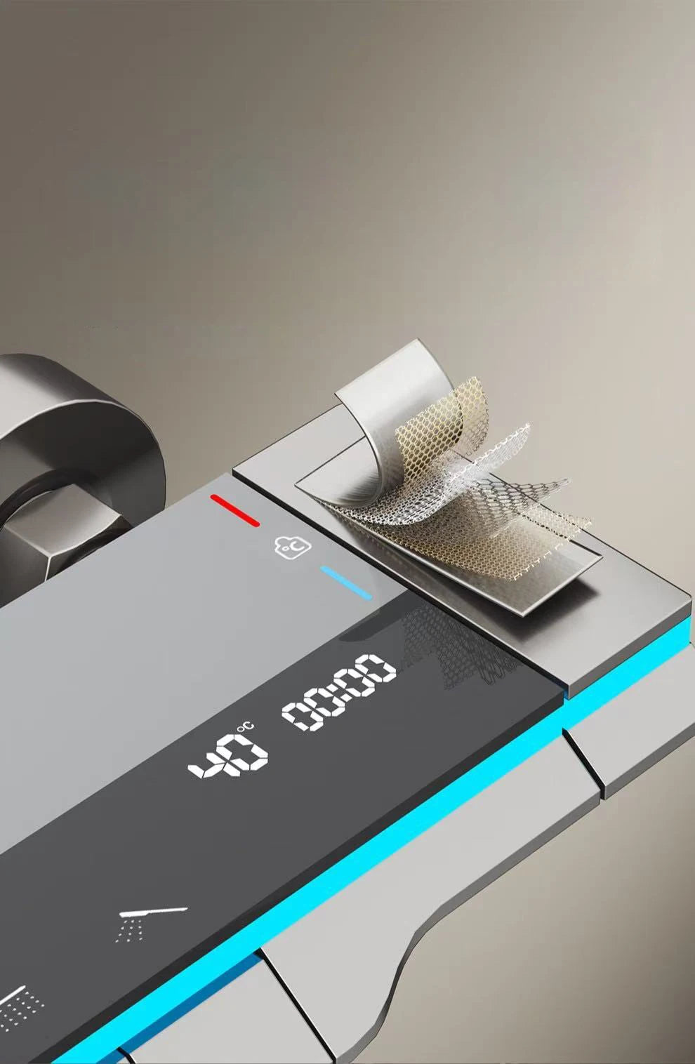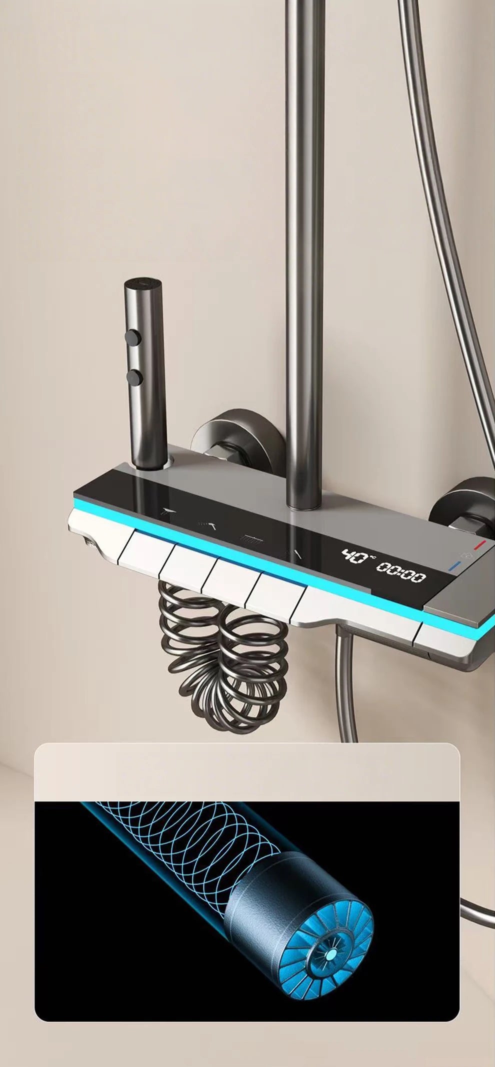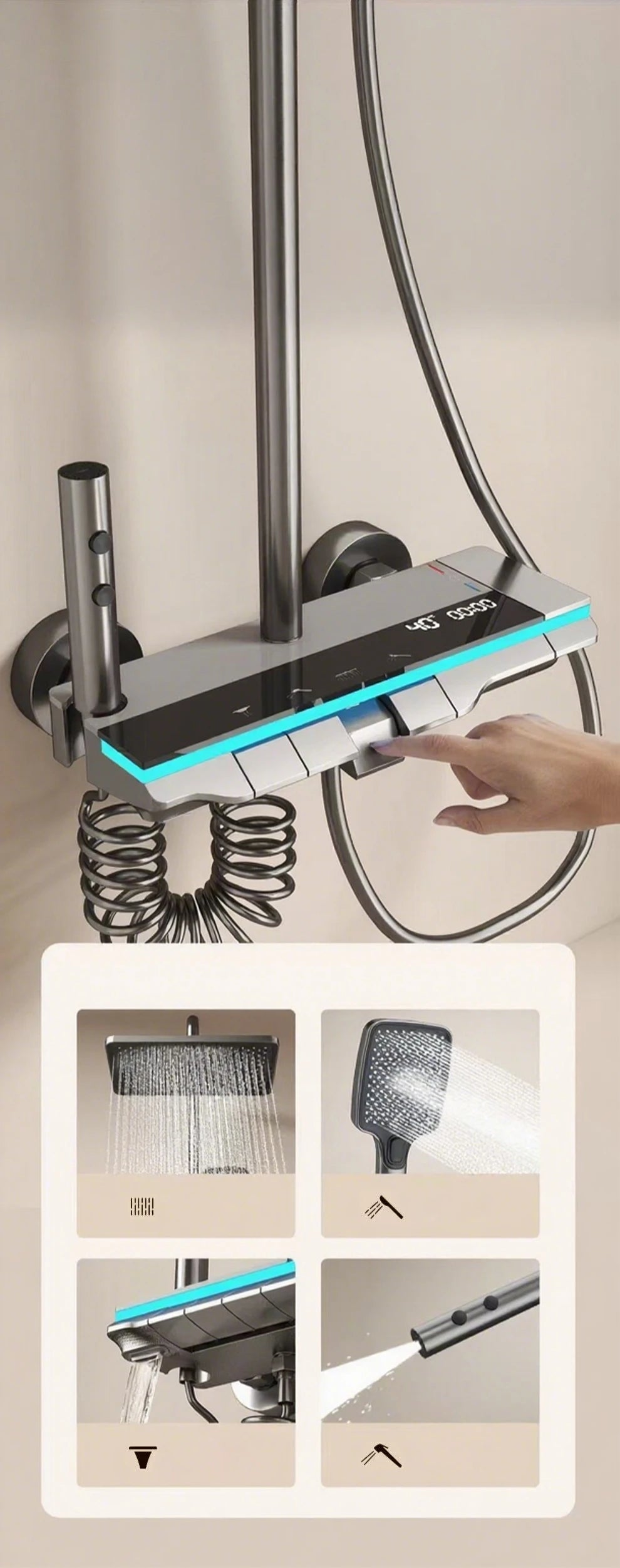 Bathroom Shower System Brass Mirror Surface Temperature-Controlled for Bathtub Faucet with Digital Display, LED Strip