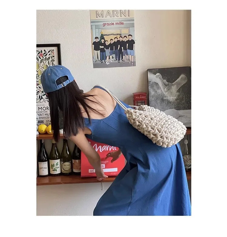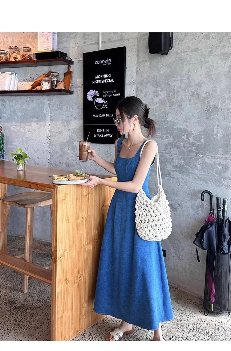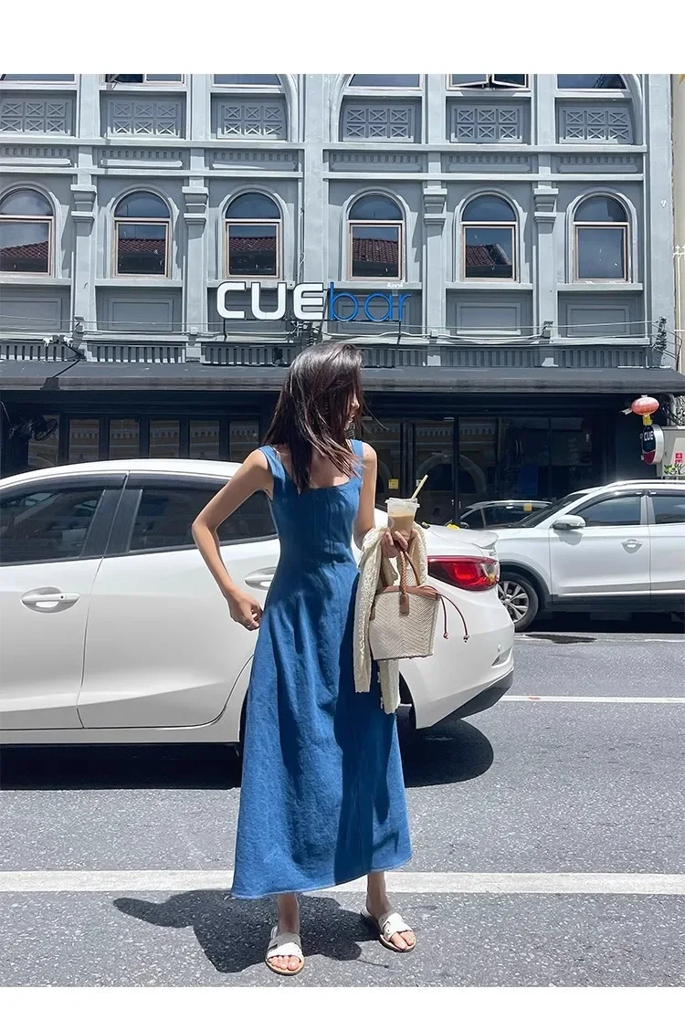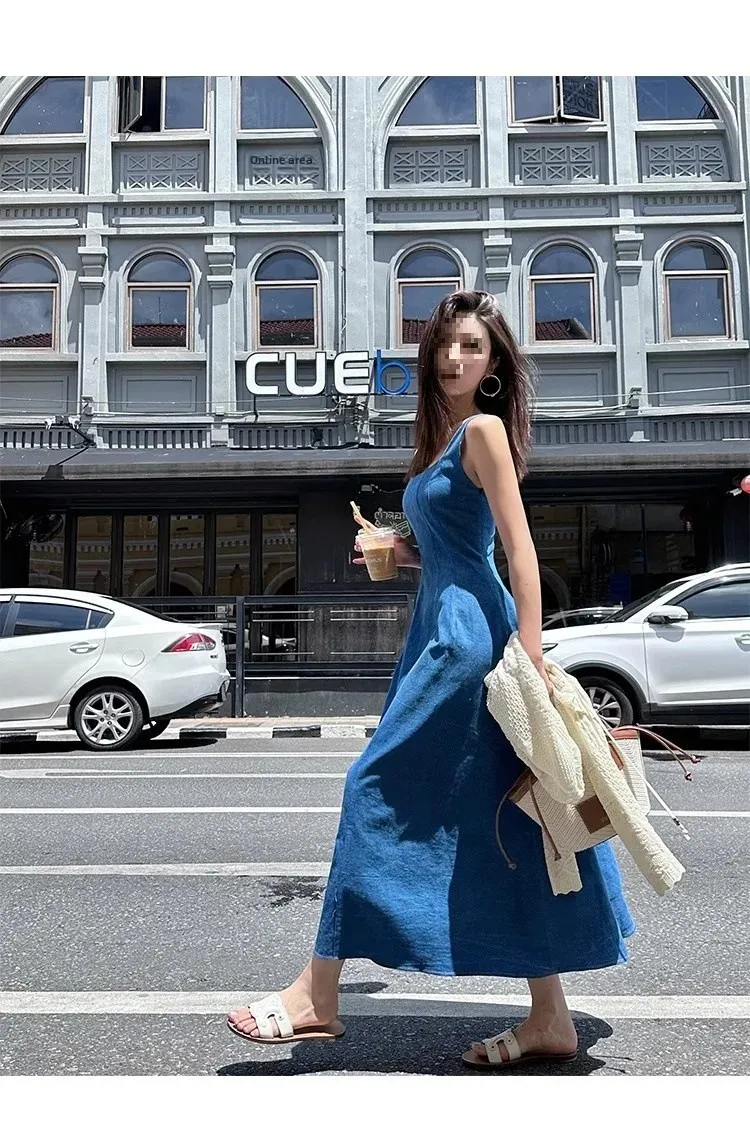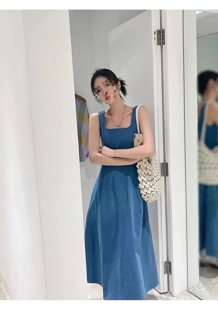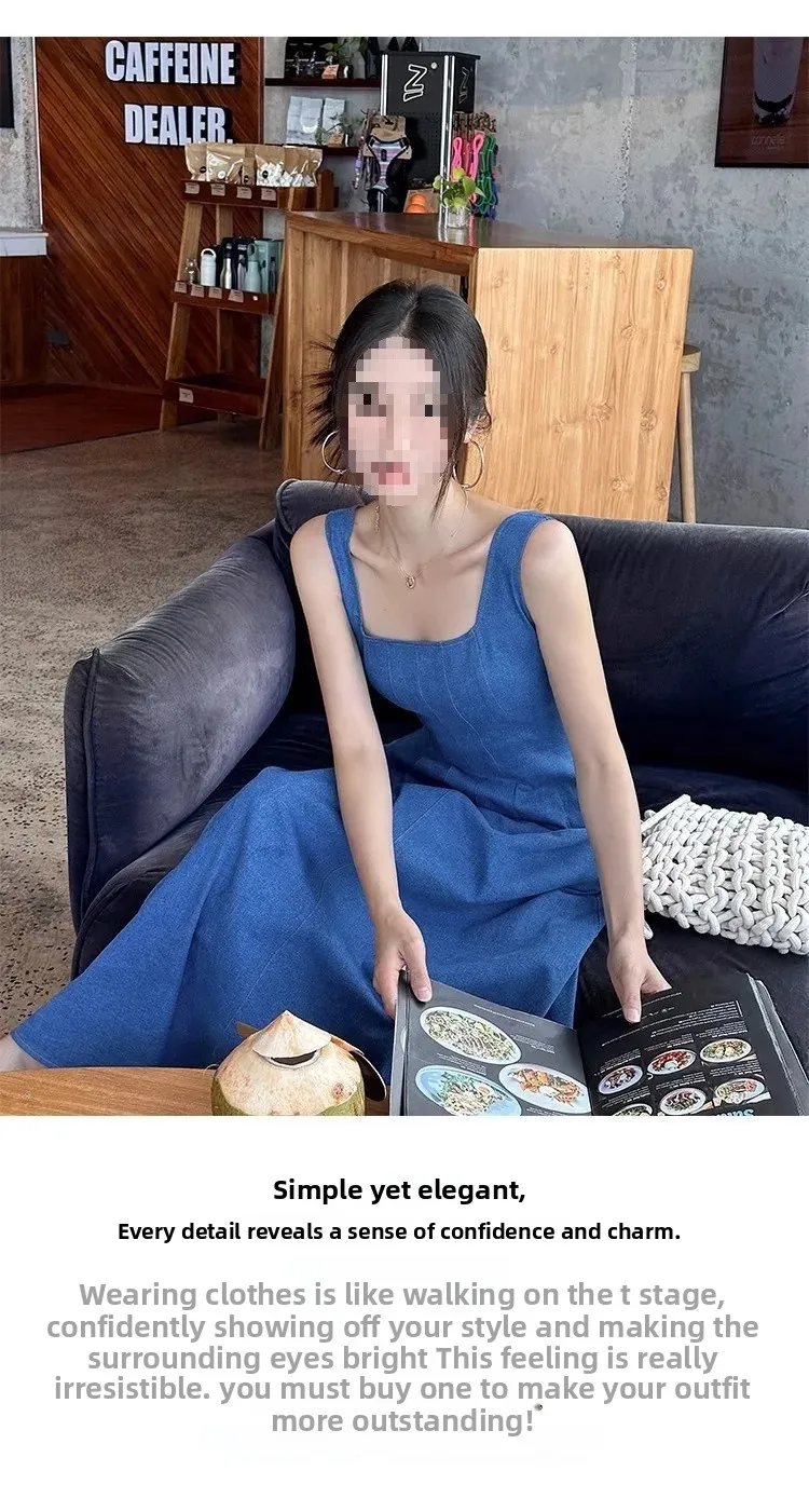 Blue Mist Love Französisches Jeanskleid für Damen, Sommer, einzigartiges Design, Taille, Cinching-Riemen, langes Kleid, elegante blaue Polyesterfaser