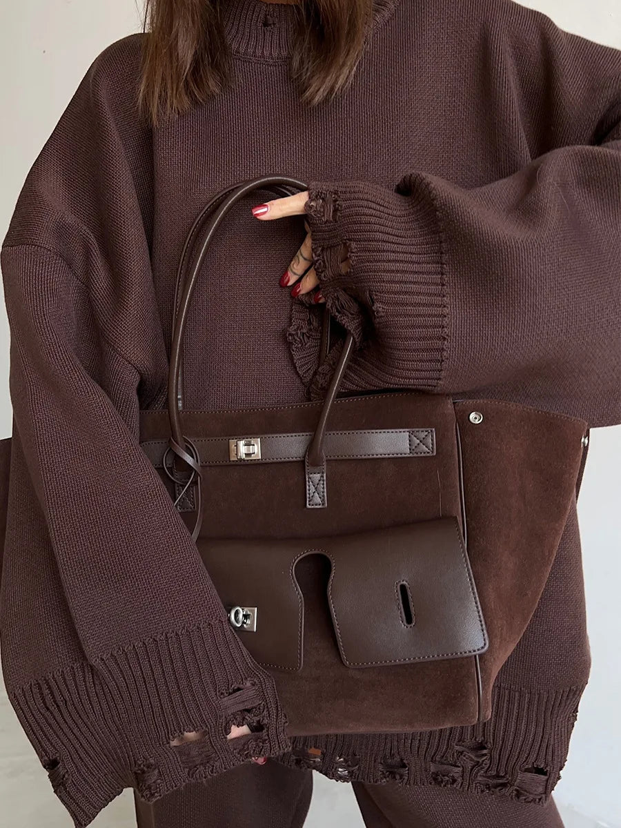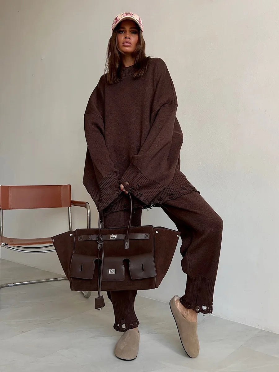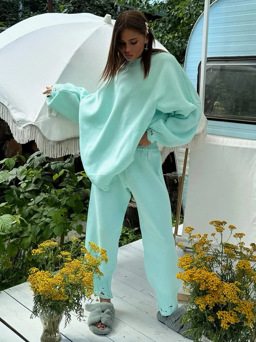 Bornladies Autumn Winter Women's New Turtleneck Knit Sweater Skinny Knit Pants Set Soft Oversized Ripped Hem Fashion Pullover