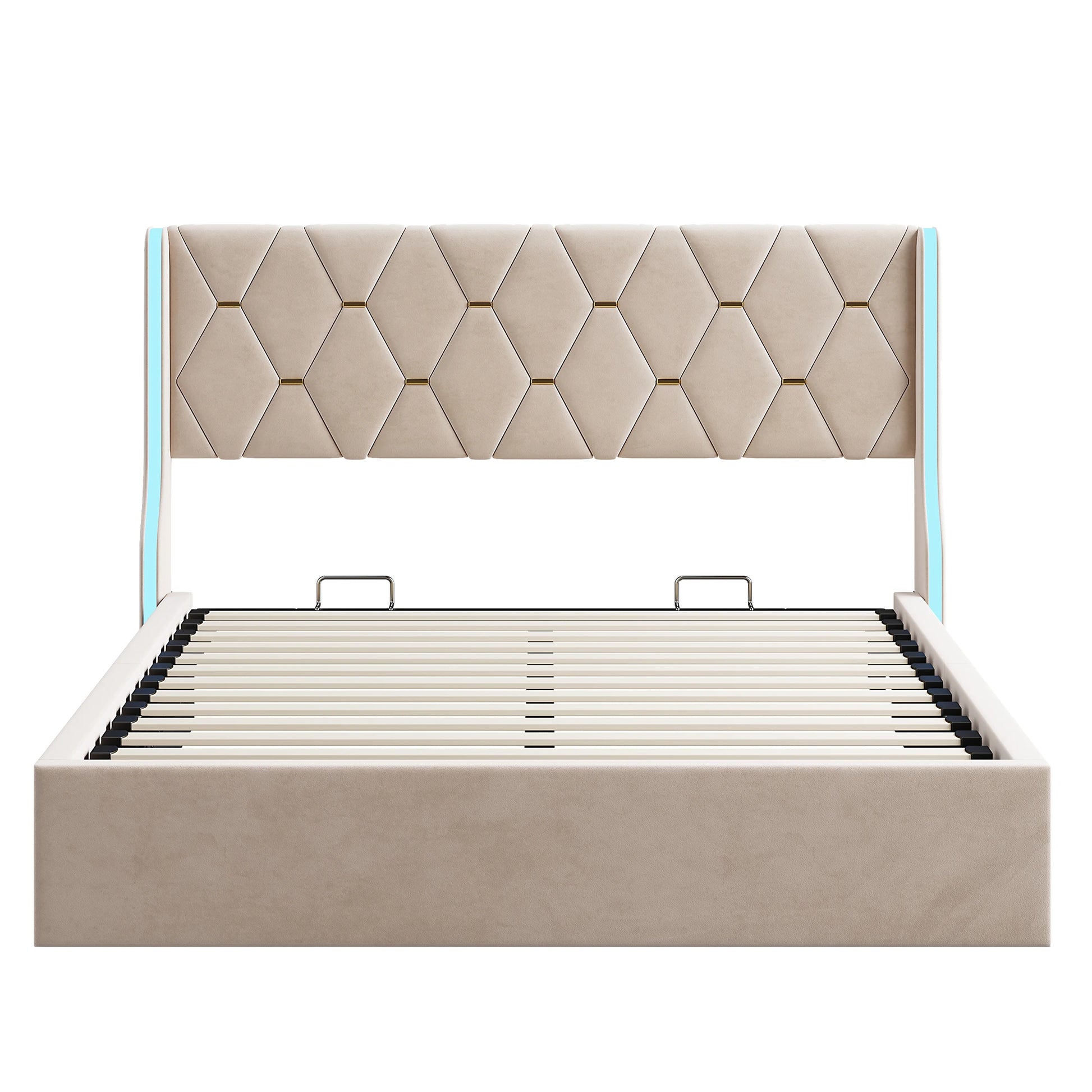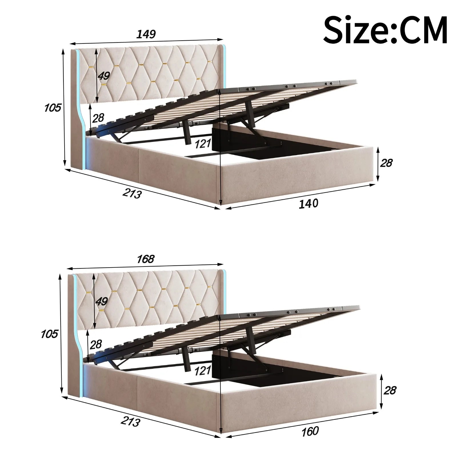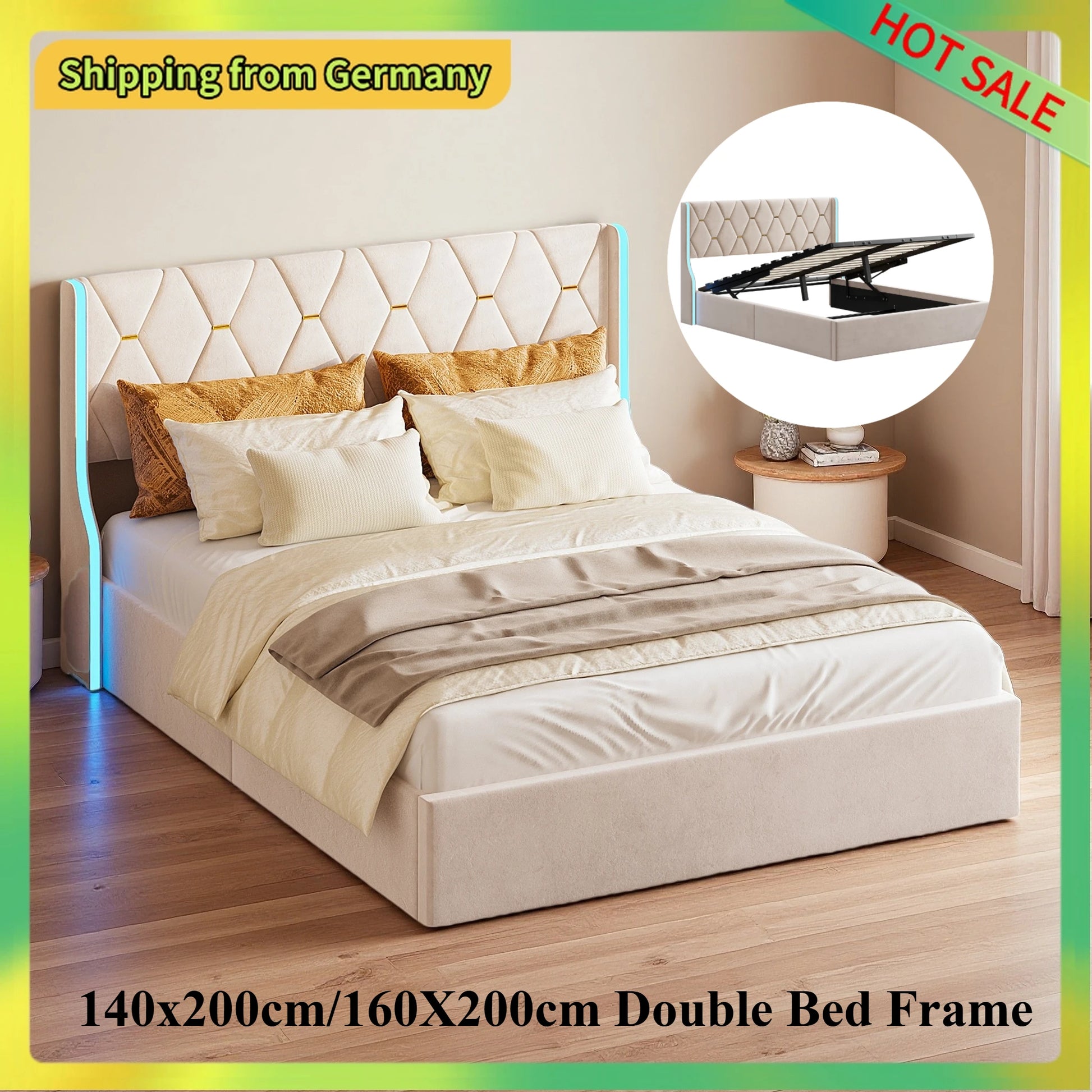 Comanlai 140 x 200 cm/160 x 200 cm hydraulisches Bett mit Stauraum, gepolstertes Bett mit Kopfteil, Kopfteil mit LED-Leuchten, Doppelbett, Flanell
