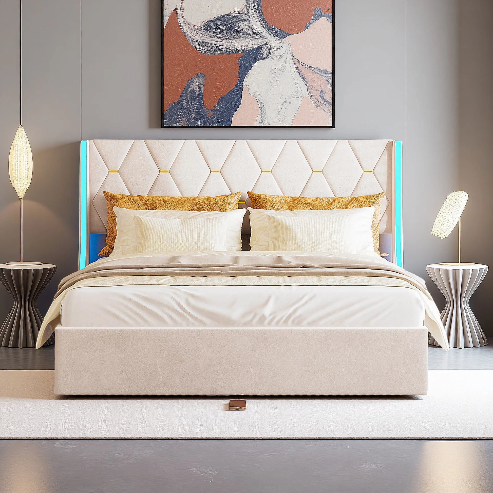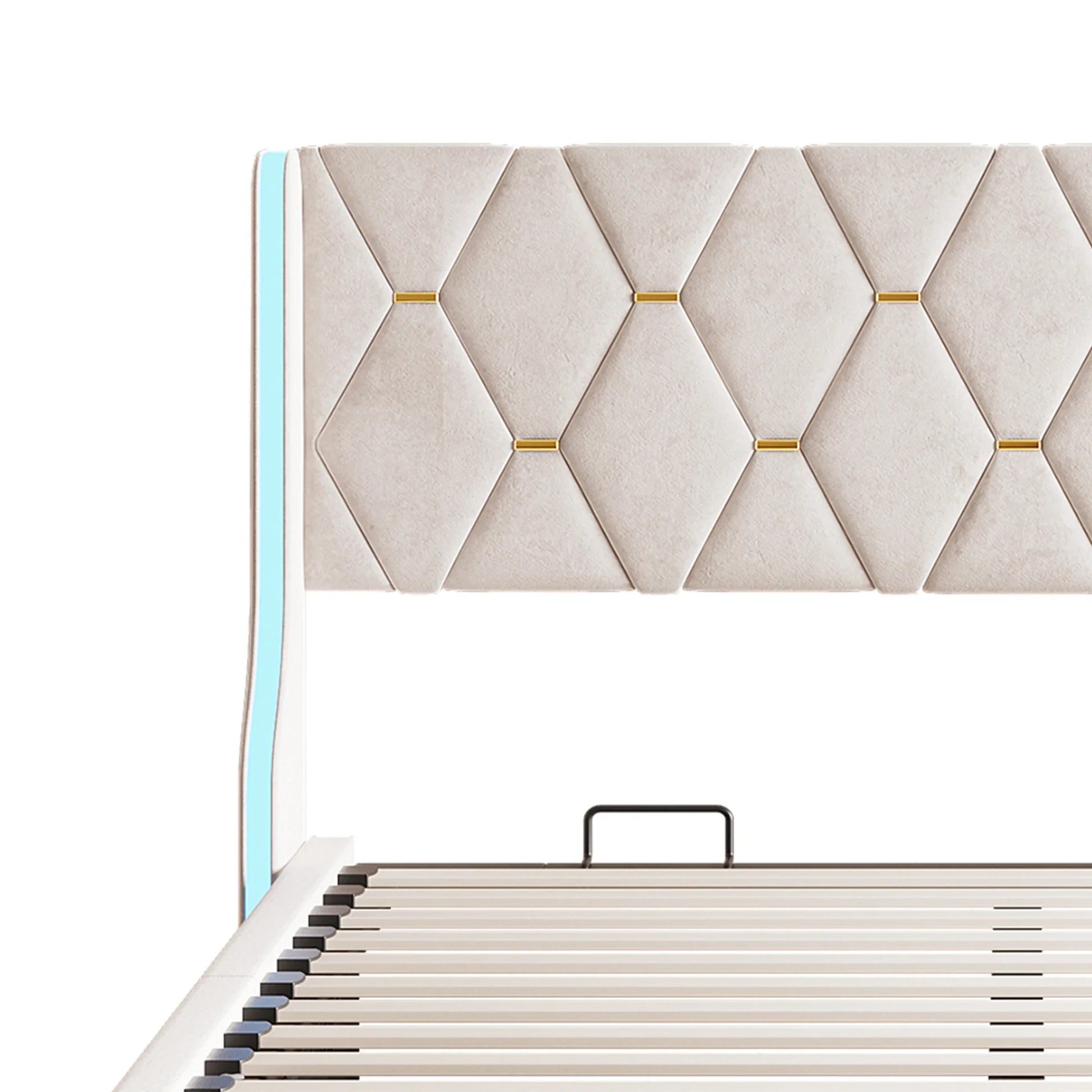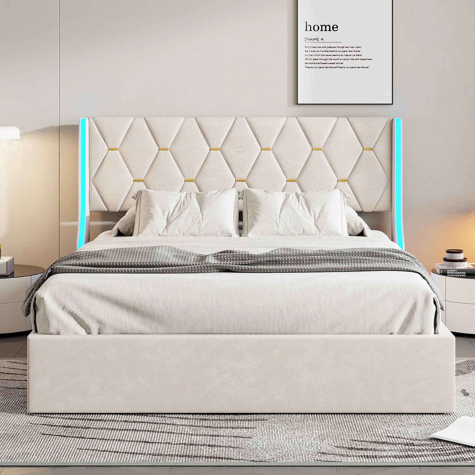 Comanlai 140 x 200 cm/160 x 200 cm hydraulisches Bett mit Stauraum, gepolstertes Bett mit Kopfteil, Kopfteil mit LED-Leuchten, Doppelbett, Flanell