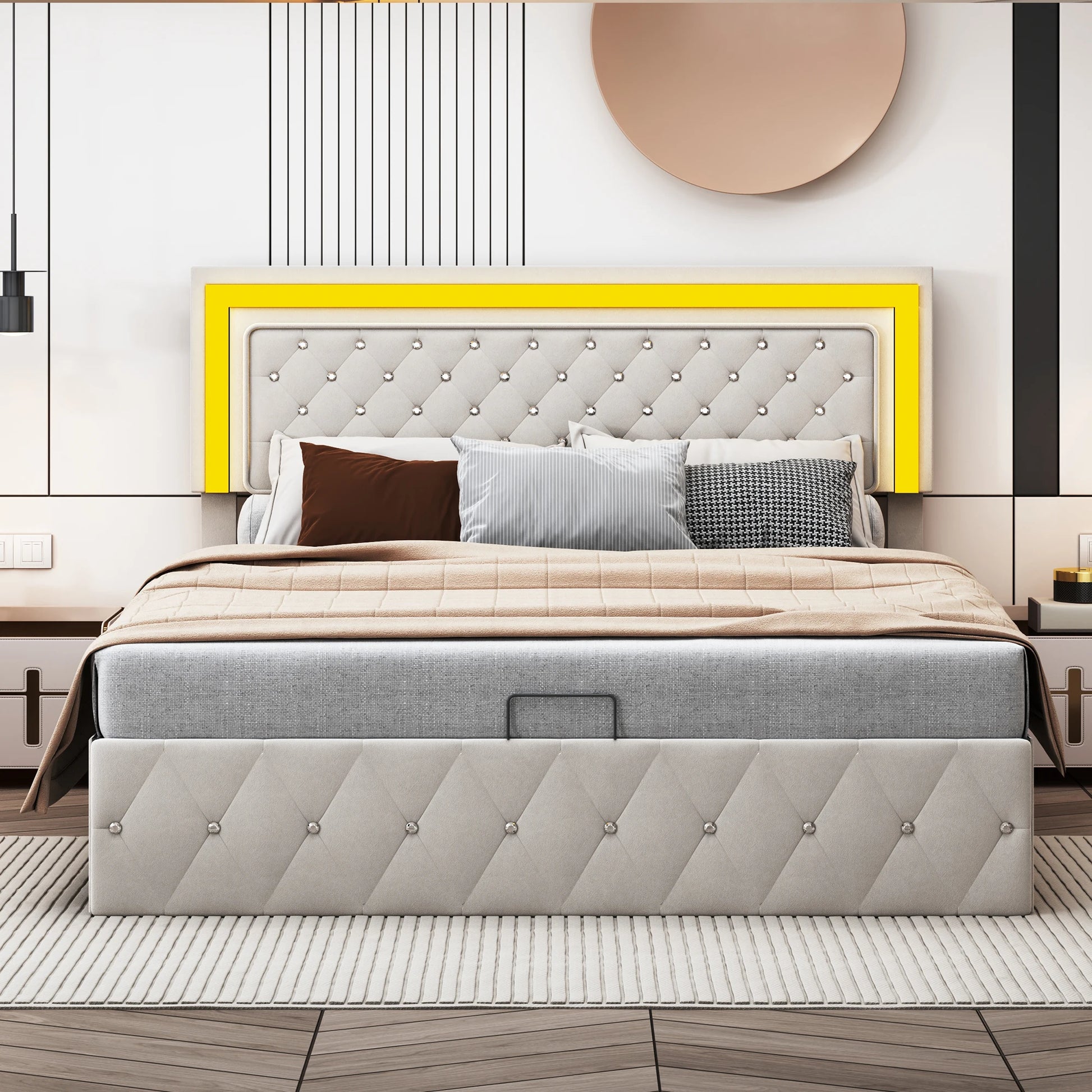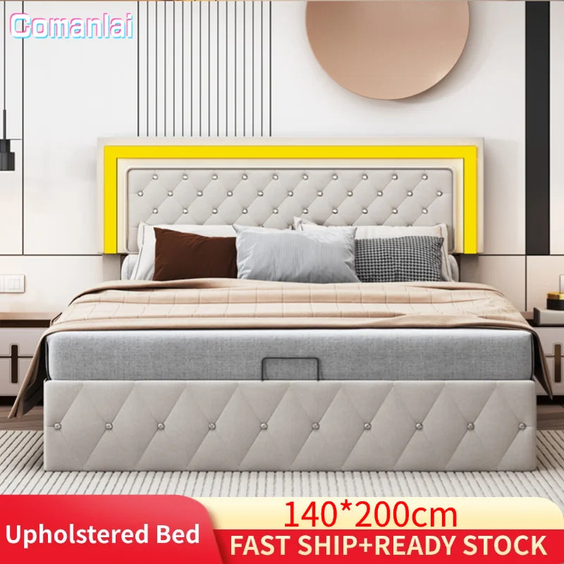 Comanlai 140 x 200 cm Polsterbett, hydraulisches Bett mit Stauraum, LED-Doppelbett mit Stauraum und Lattenrost, Samt, Beige