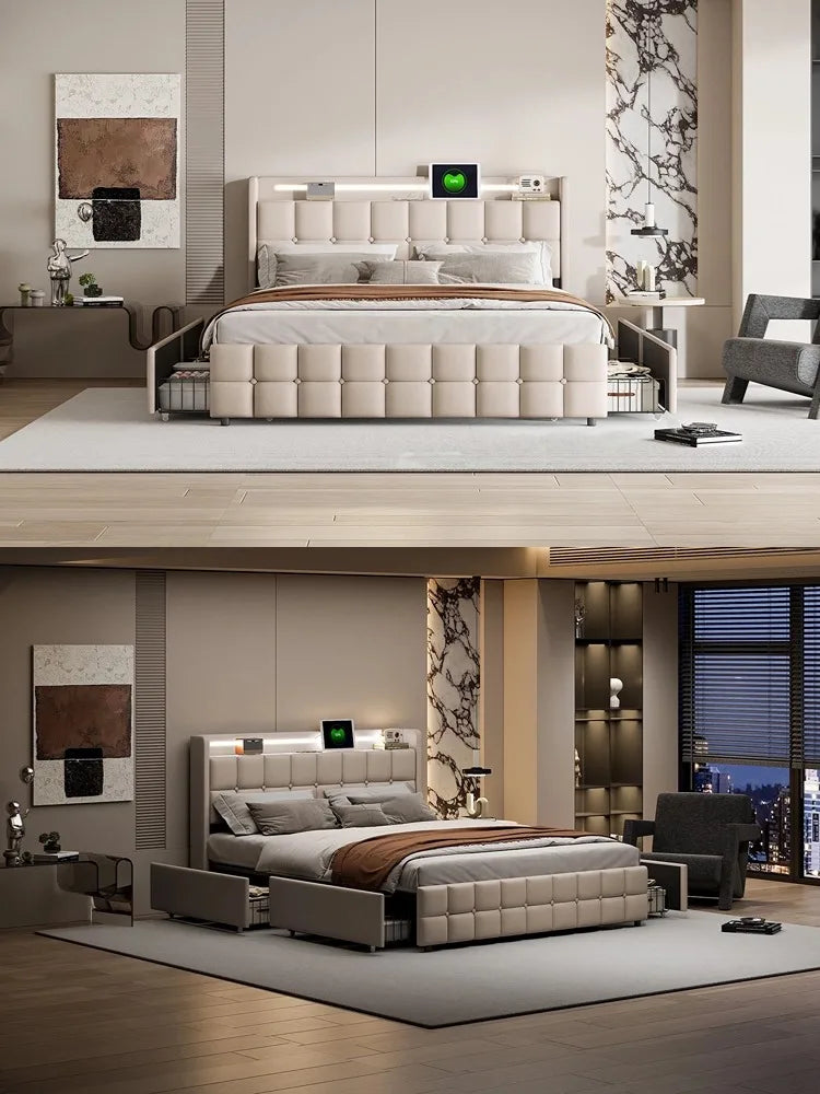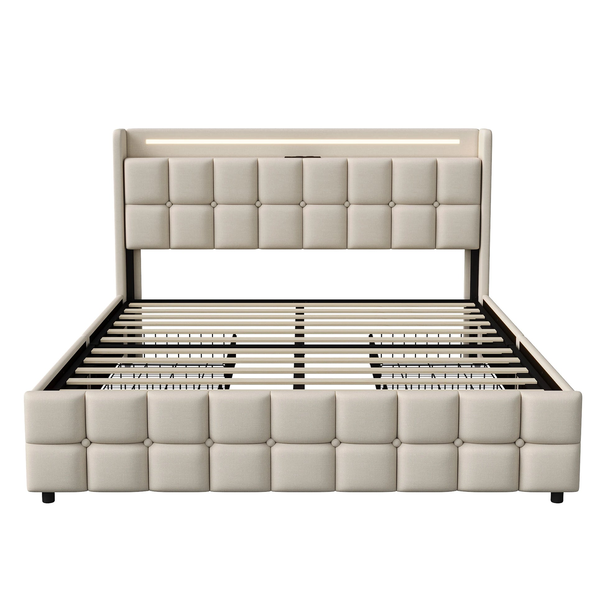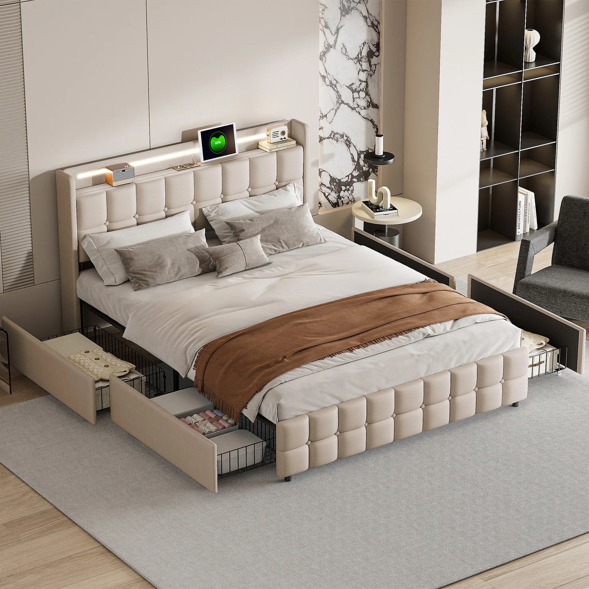Creahappy Polsterbett – Doppelbettgestell mit wiederaufladbarem USB-Kopfteil, LED-Beleuchtung und 4 Schubladen – Beige