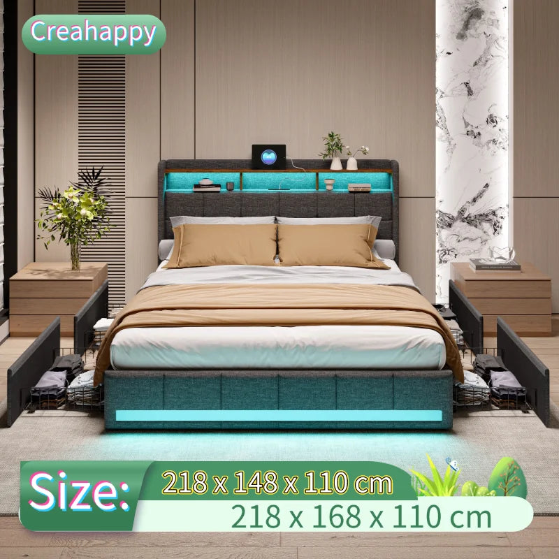 Creahappy Twin-Bettgestell – Polsterbett in Grau – mit USB-Ladeanschluss – mit LED-Beleuchtung – Aufbewahrungsschubladen auf beiden Seiten