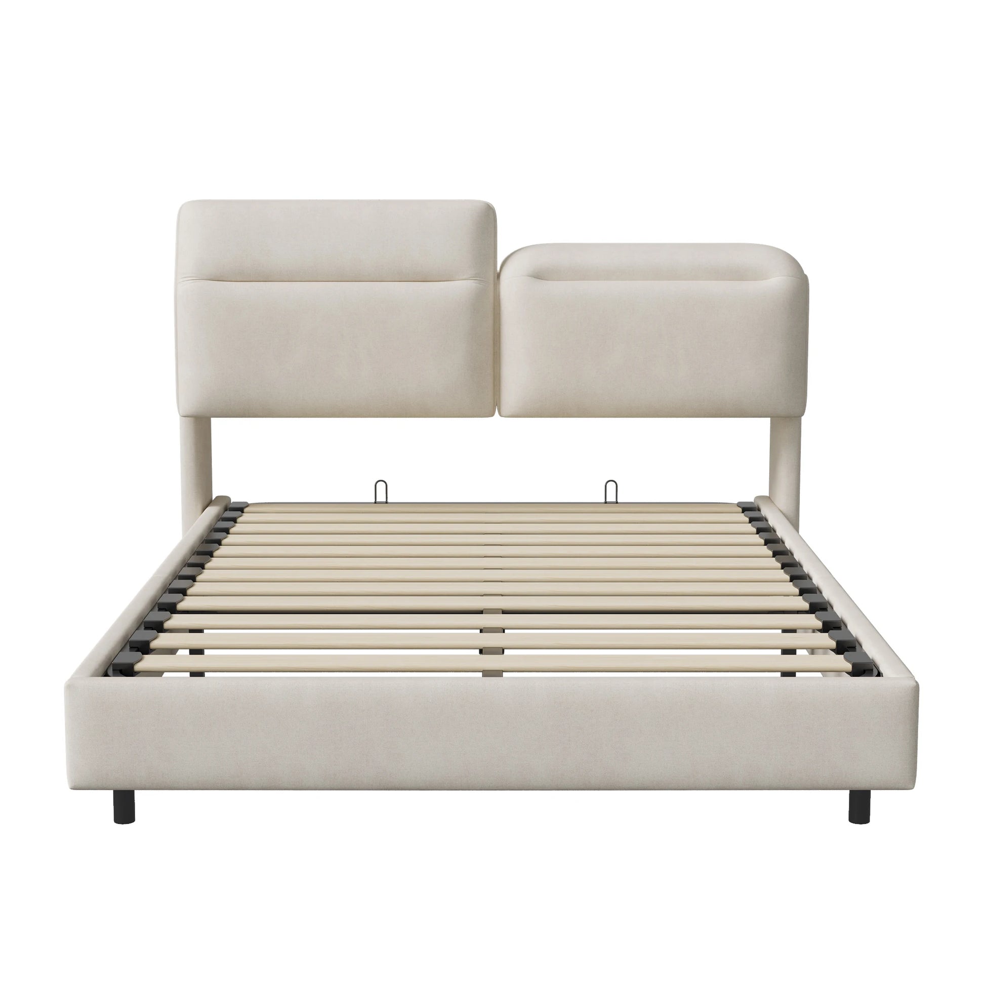 Creahappy – Weich gepolstertes Doppelbett – mit faltbarem, verstellbarem Kopfteil – hydraulischer Stangenbettrahmen – LED-Streifenbeleuchtung unter dem Bett