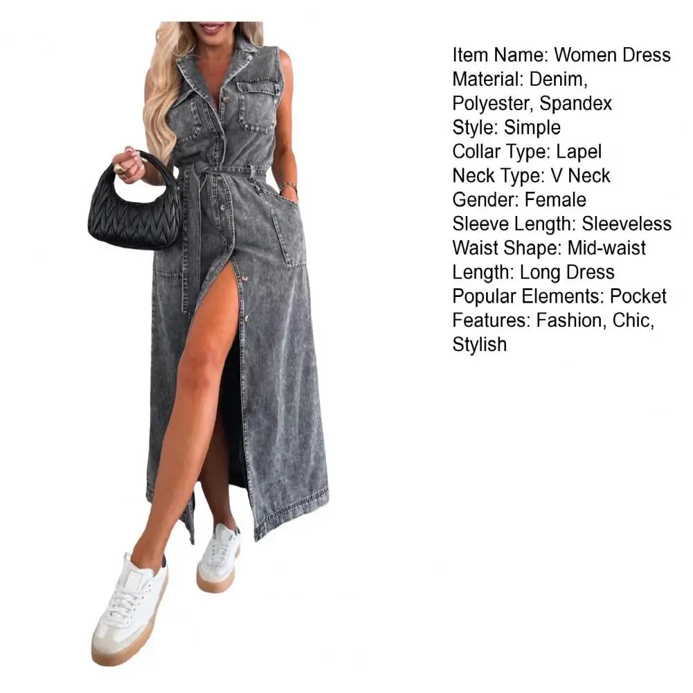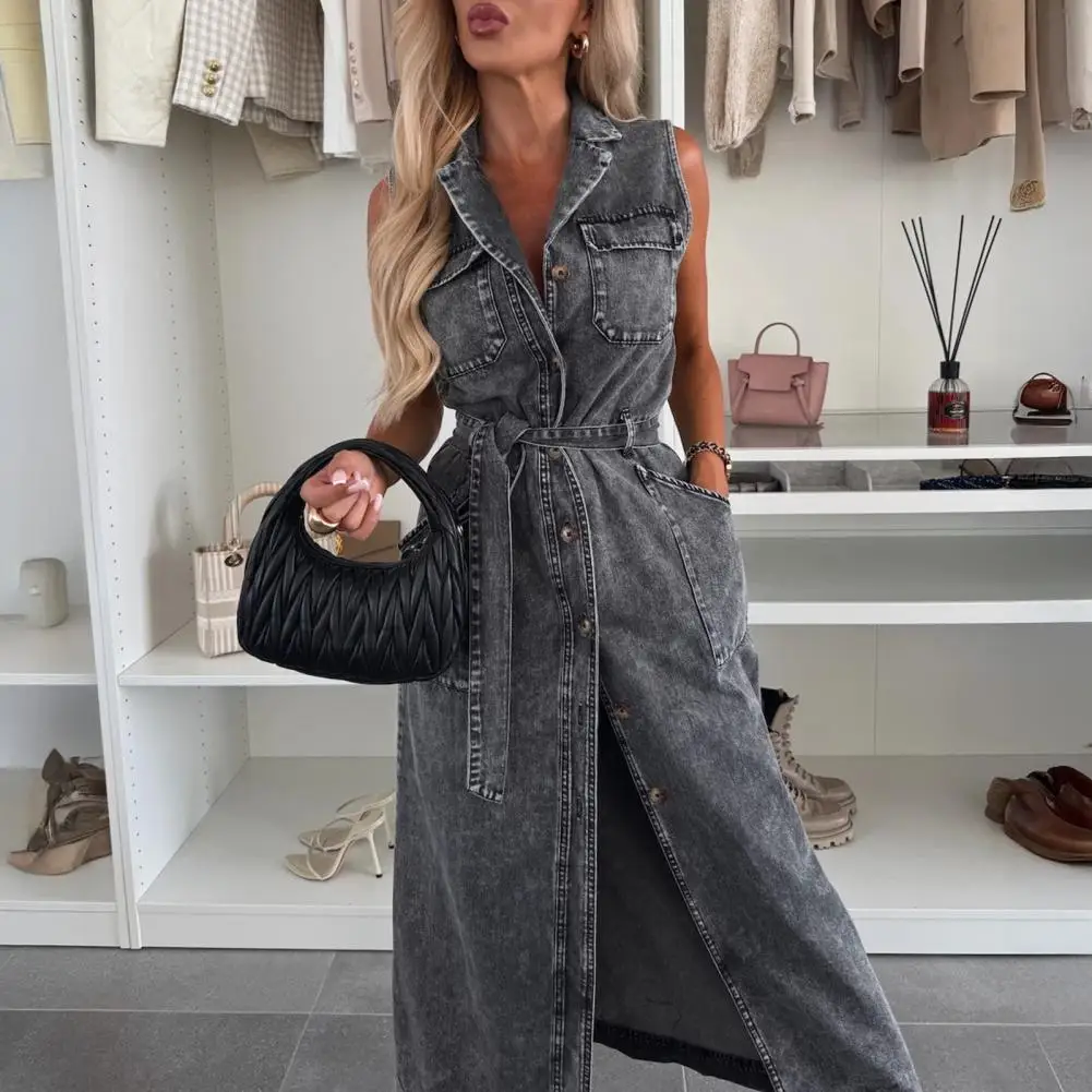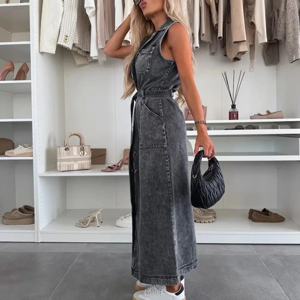 Damen-Jeanshemdkleid, Sommer, ärmellos, Knopfleiste, Maxikleid mit Gürtel, Revers, V-Ausschnitt, langes Jeanskleid mit Taschen