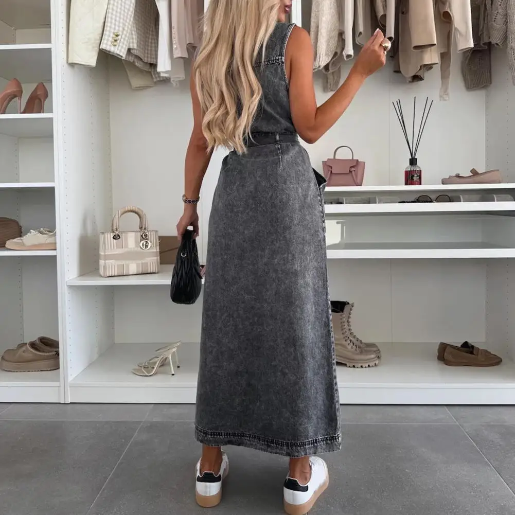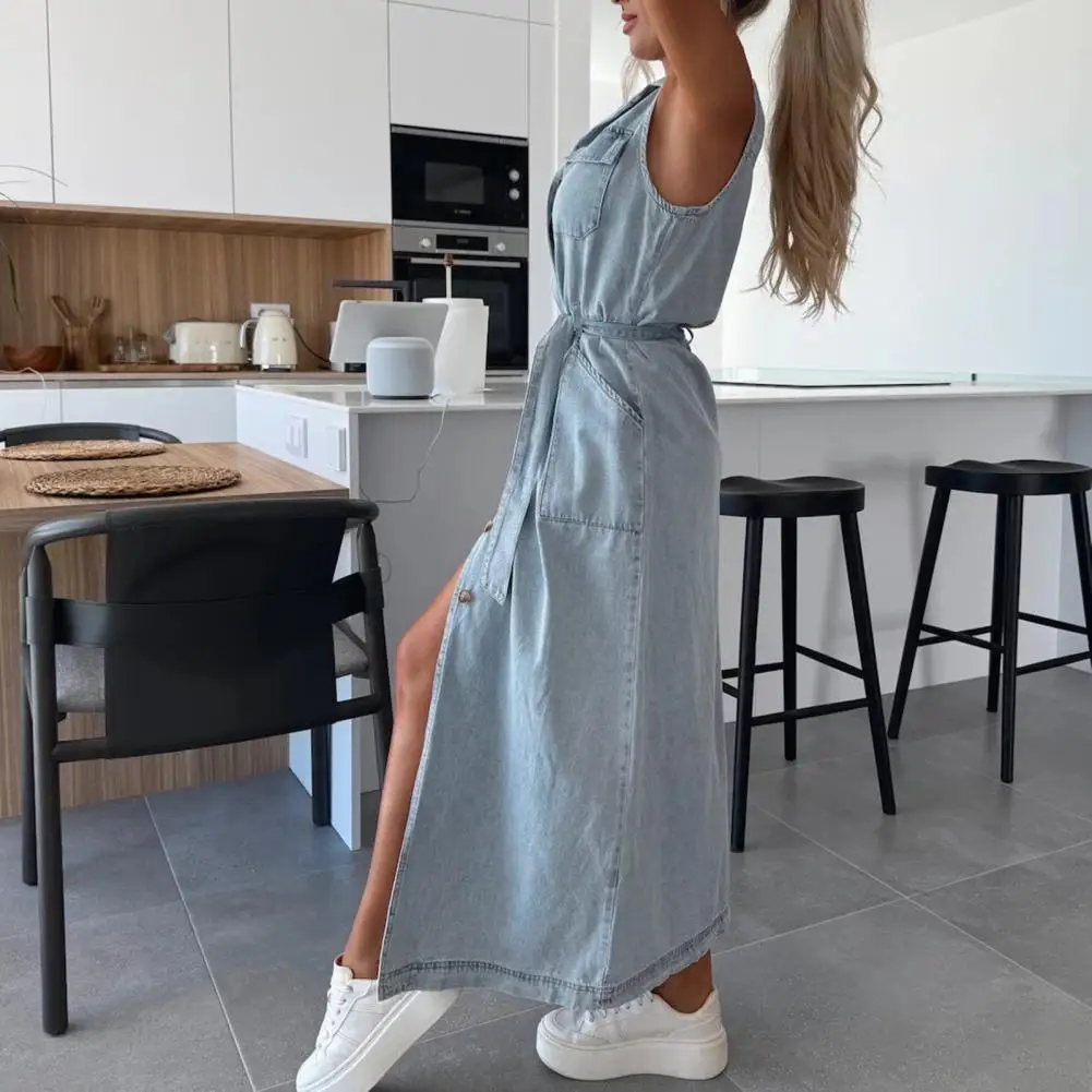 Damen-Jeanshemdkleid, Sommer, ärmellos, Button-Down-Maxikleid mit Gürtel, Revers, V-Ausschnitt, langes Jean-Kleid mit Taschen