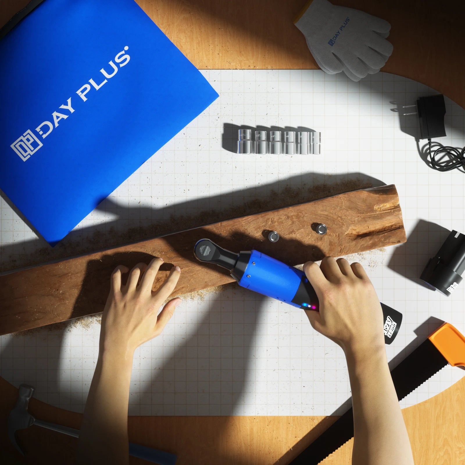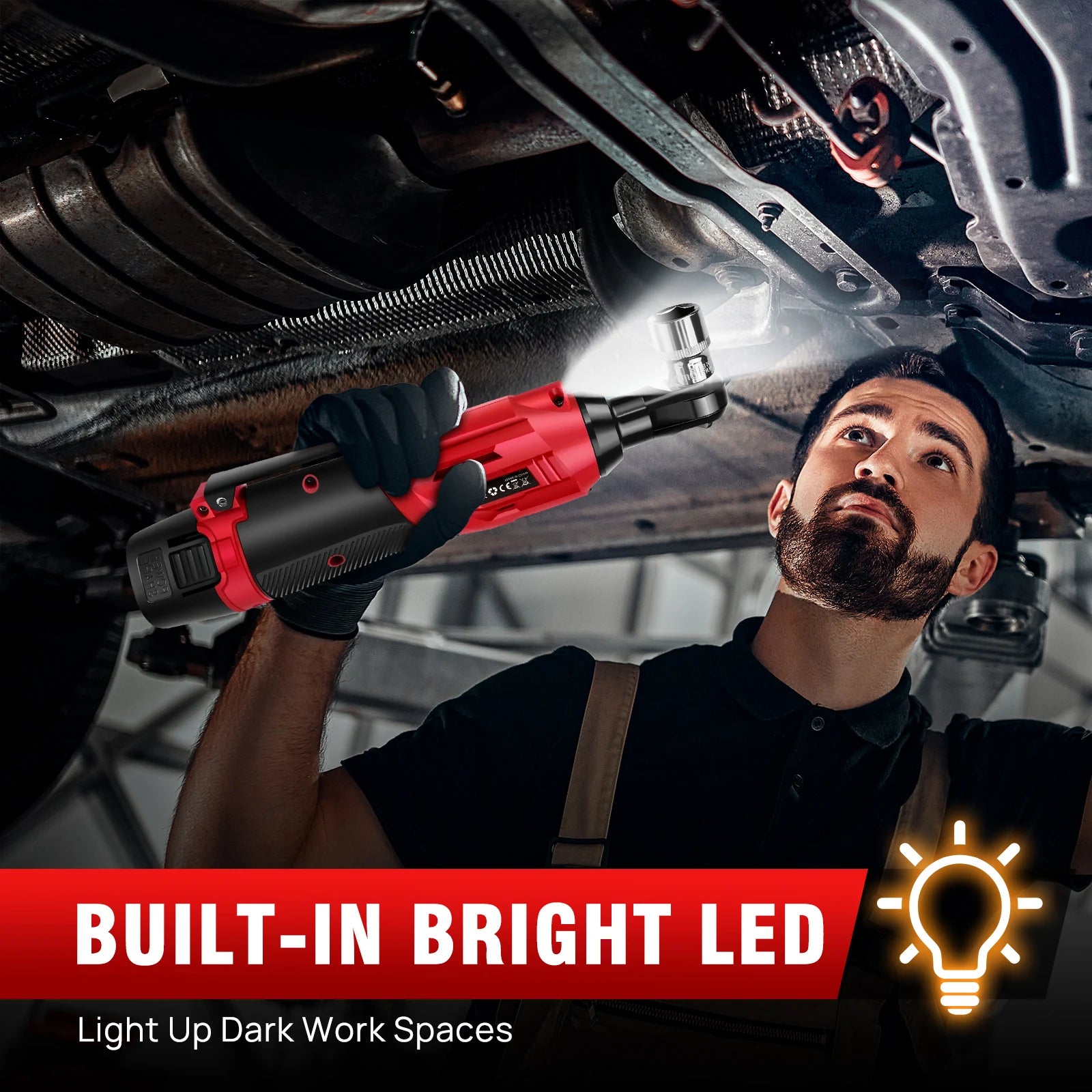 DayPlus 3/8 Zoll kabelloser elektrischer Ratschenschlüssel, 12 V Power-Ratschengerät 200 NM mit 2 x 1500 mAh-Batterien 90 ° Winkelschlüssel, 7 Steckdosen