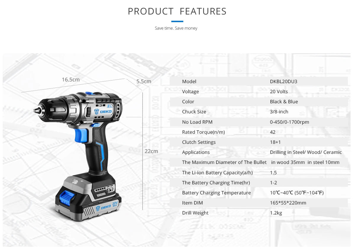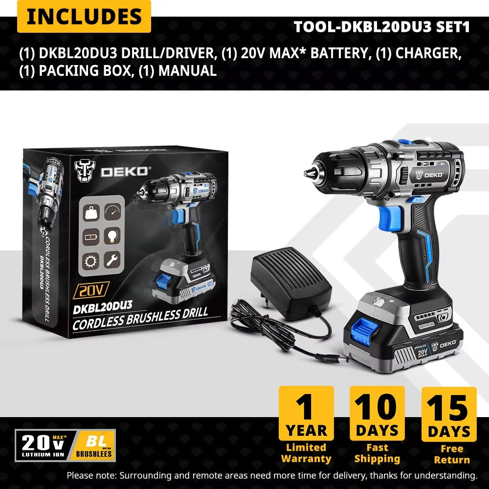 DEKO 20 V DKBL20DU3 Bürstenloser Akku-Bohrschrauber Combo Kit Mini-Elektroschrauber 2-Gang-Elektrowerkzeuge für die Holzbearbeitung