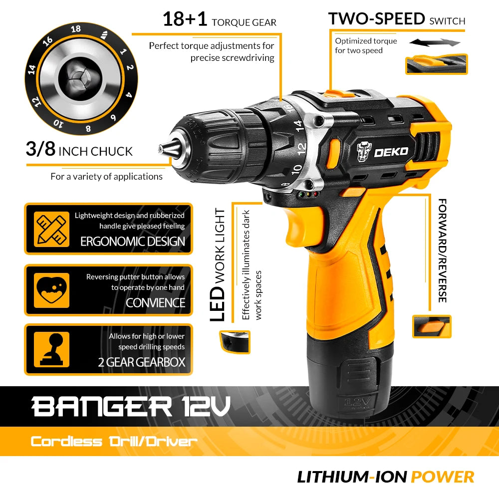 DEKO Akku-Bohrschrauber, 12 V, 16 V, 20 V, Mini-Wireless-Elektrowerkzeuge, DC-Lithium-Ionen-Akku, Elektroschrauber, Heim-DIY-Bohrmaschine