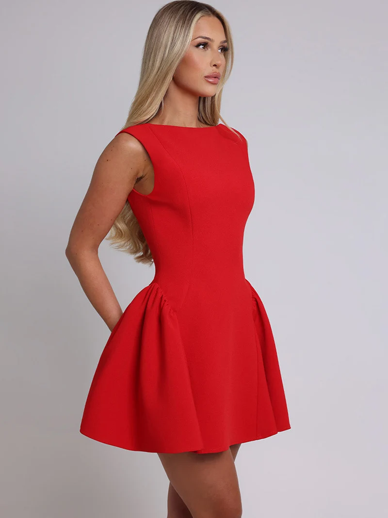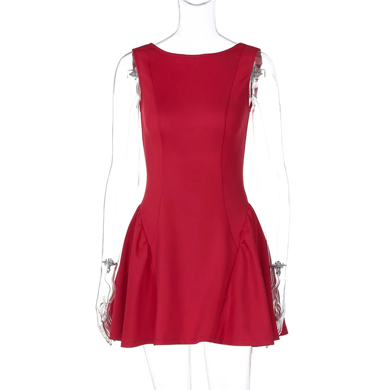 DGLUKE Elegantes rotes Minikleid für Damen, U-Boot-Ausschnitt, ärmellos, hohe Taille, A-Linien-Kleid, rückenfrei, plissiert, kurze Abschlussball-Party-Kleider