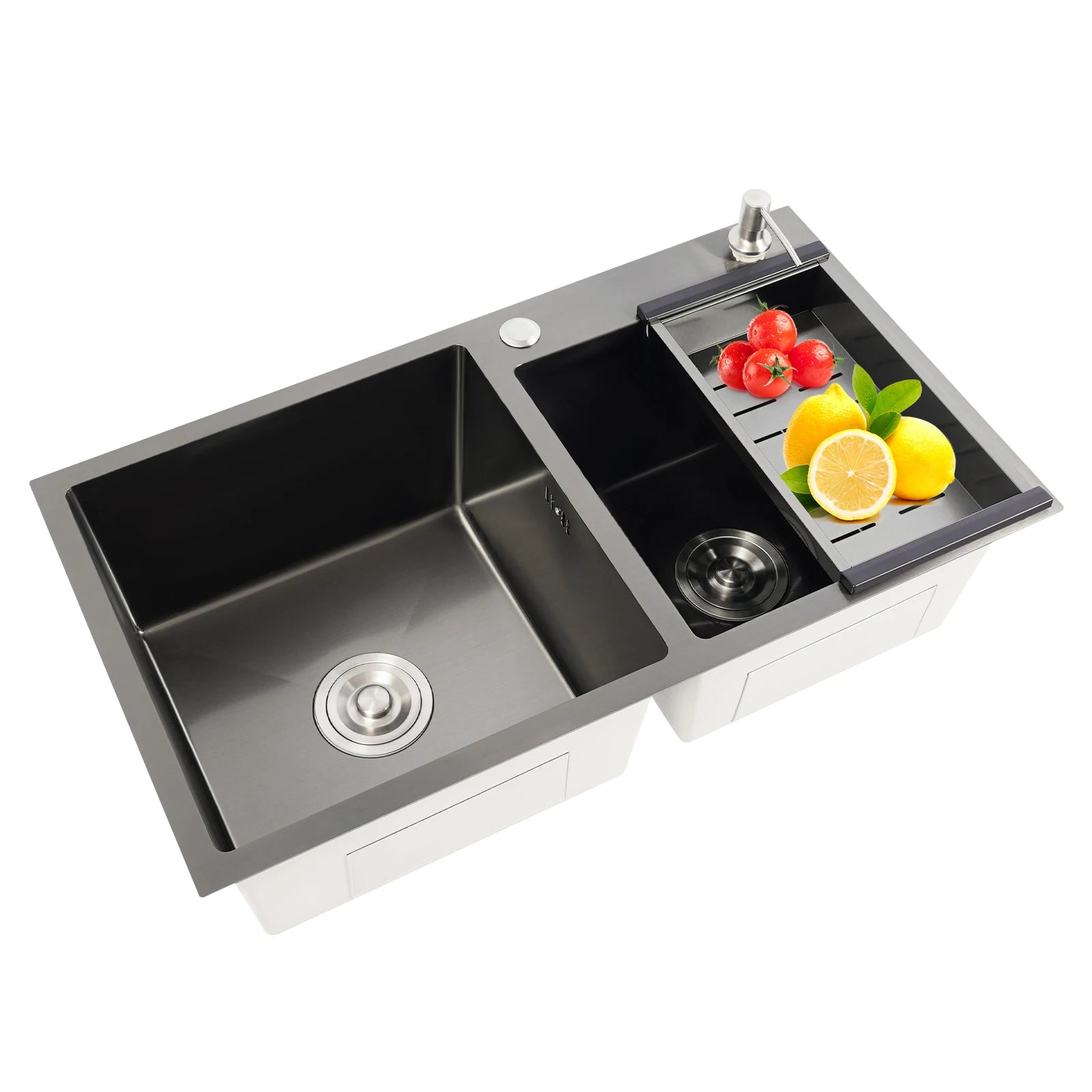 Doppelschüssel-Küchenspüle mit Seifenspender, Abflusskorb, Rohre, Edelstahl 304, 78 x 43 x 22 cm, zusätzliche Aufbewahrung für Restaurants