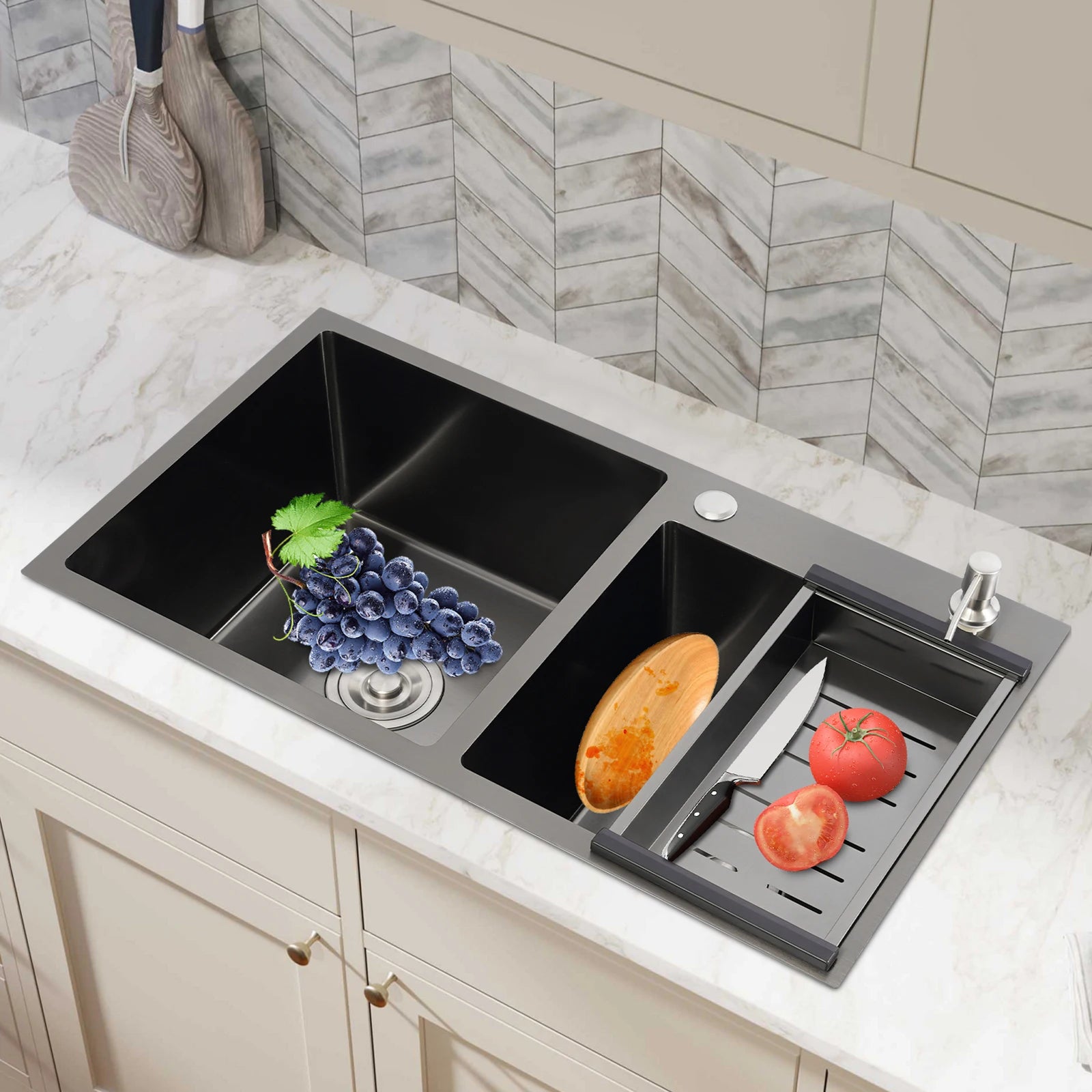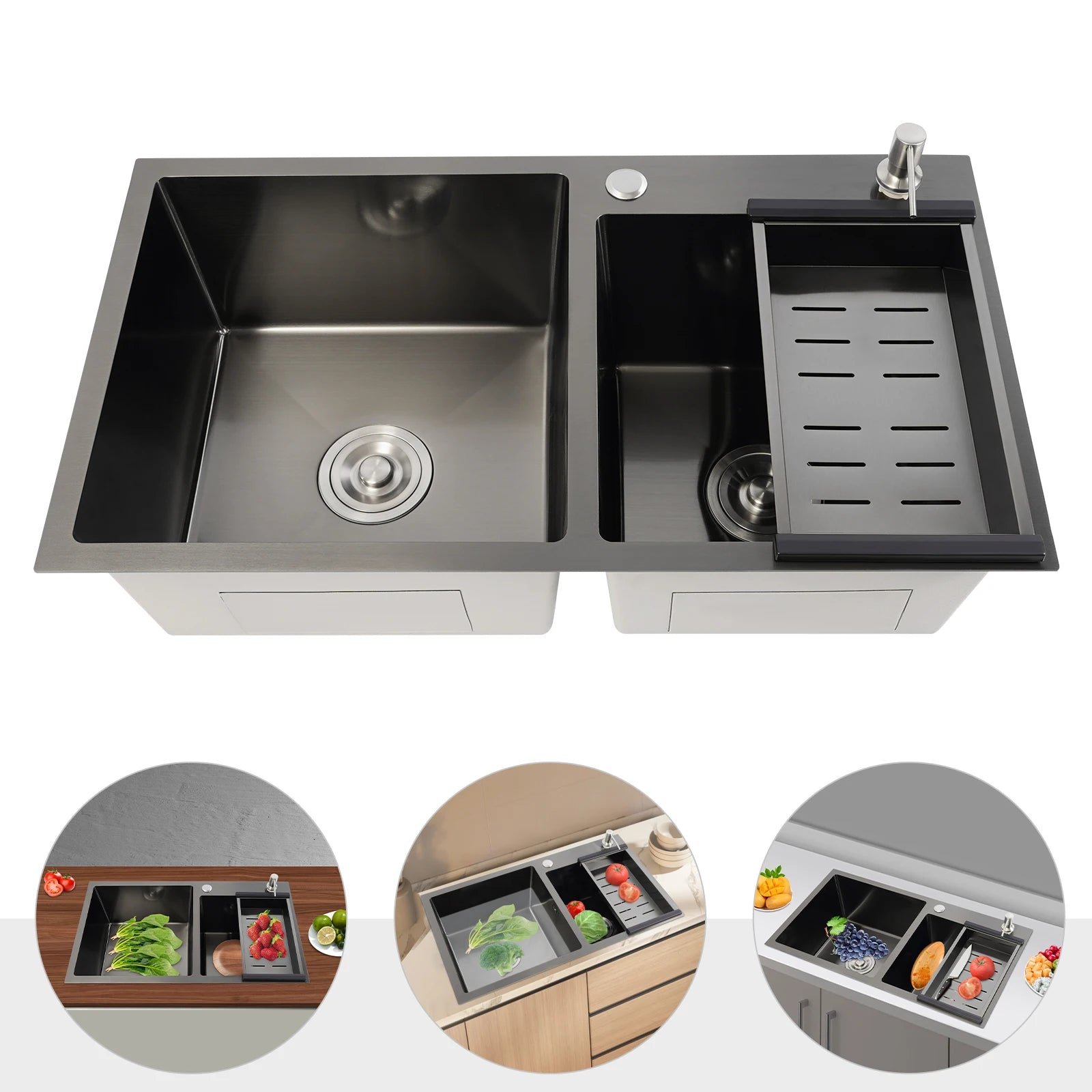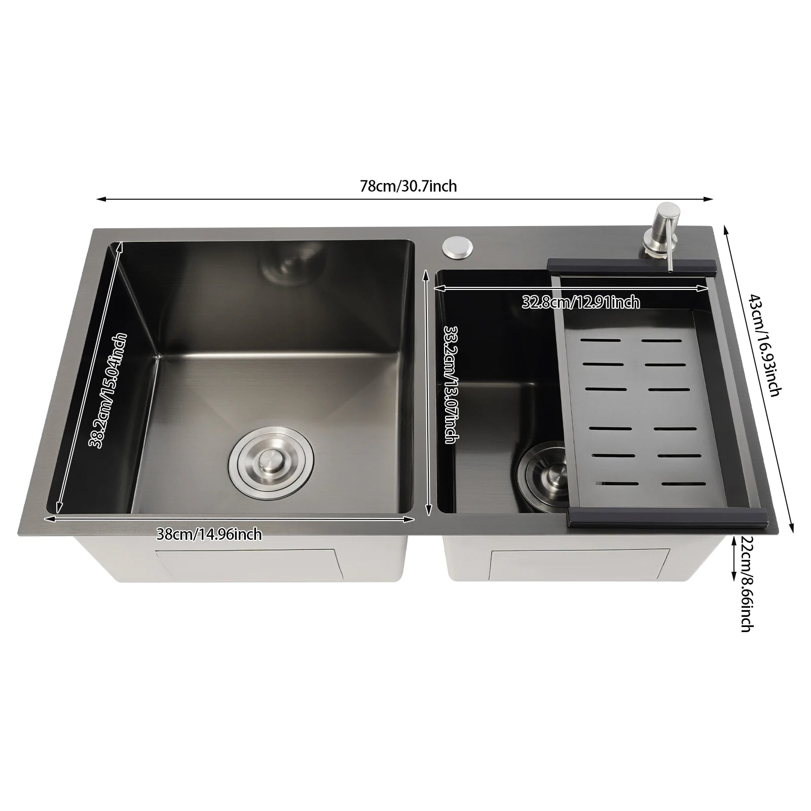 Doppelschüssel-Spüle, Küchenspüle aus Edelstahl, modernes Küchenspülen-Set (Drainpipes + Siebgefäße + Abflusskorb + Seifenspender)