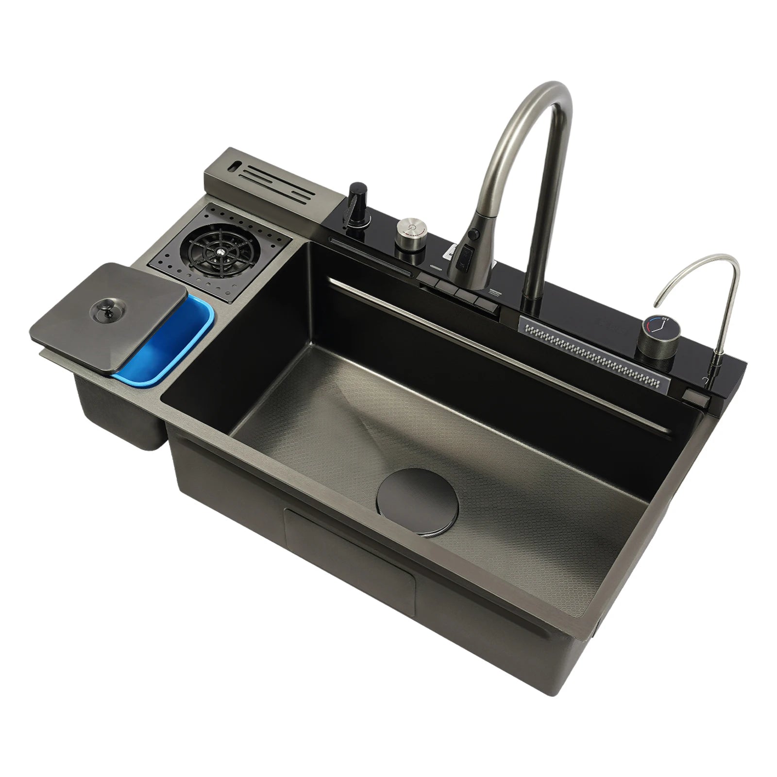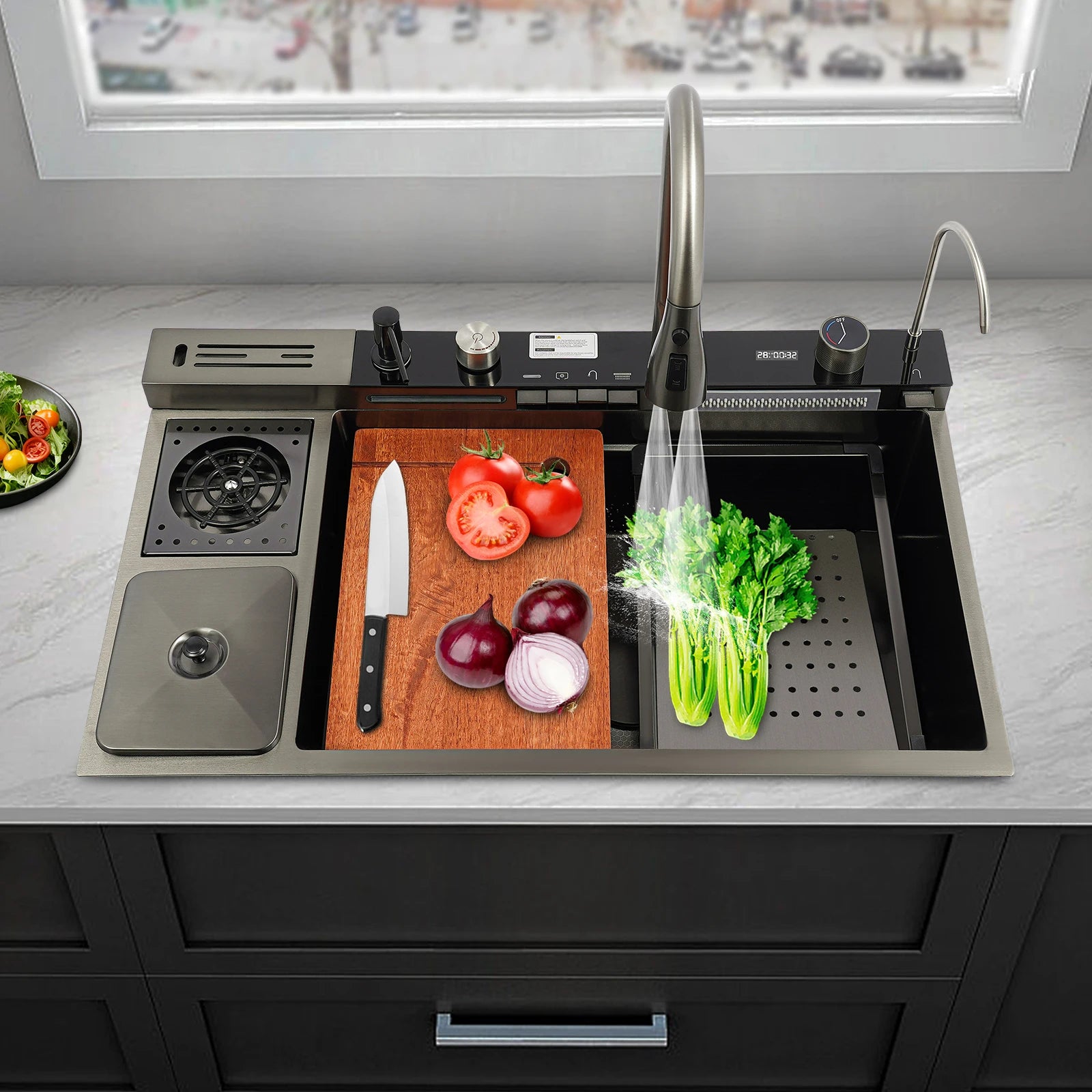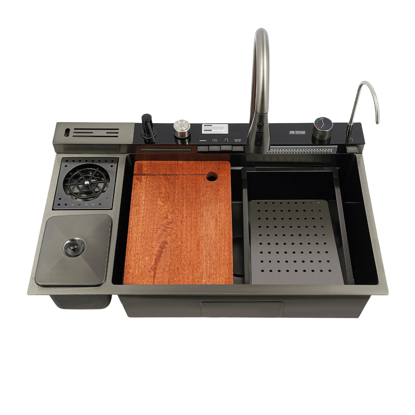 Edelstahl-Küchenspüle mit Abtropfkorb, ausziehbarer Wasserhahn, Schneidebrett, Tassenwascher, Digitalanzeige, 82 x 48 x 23 cm