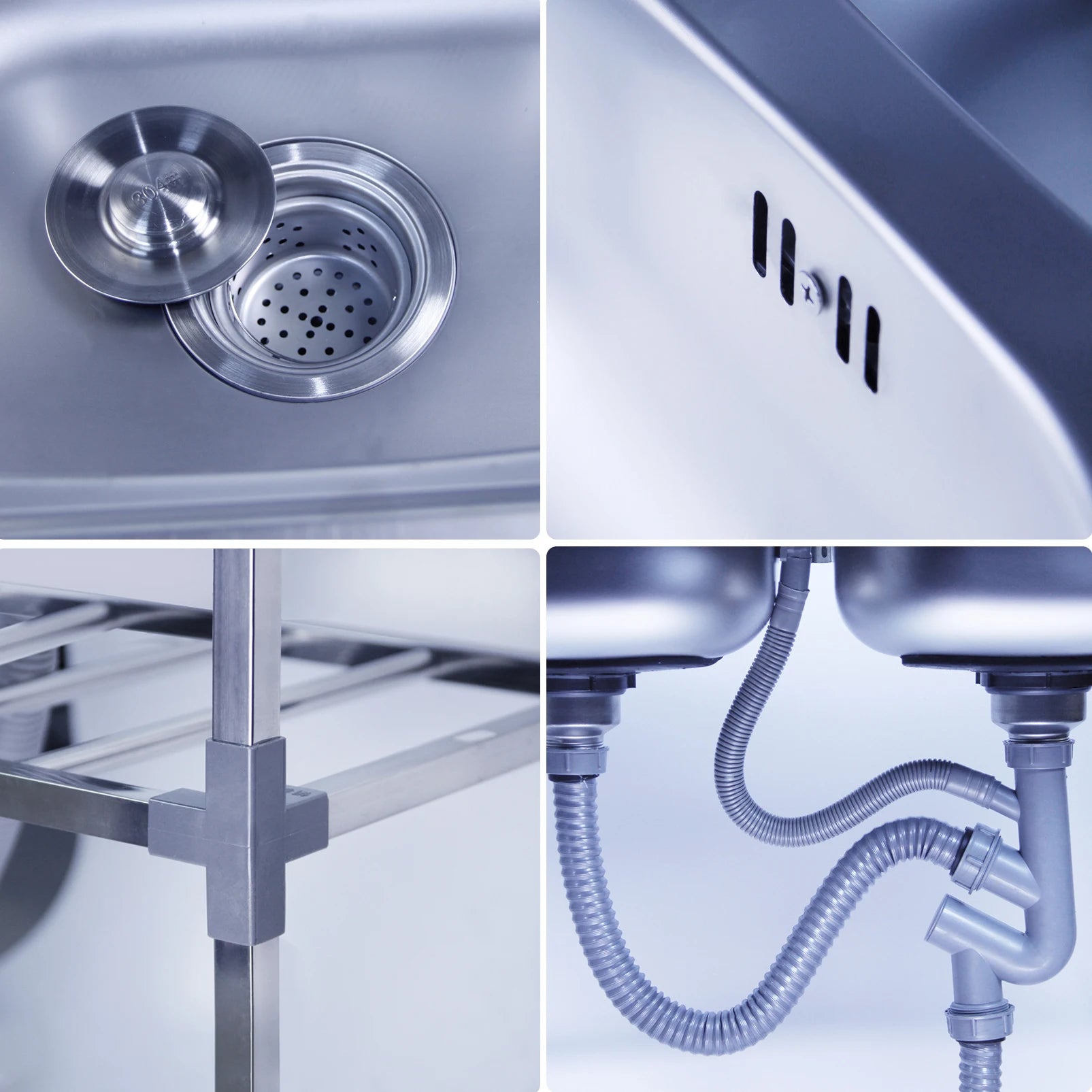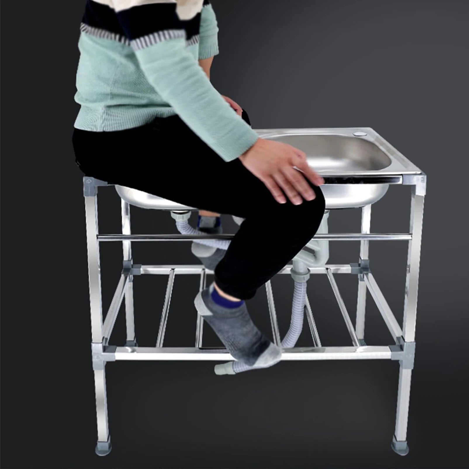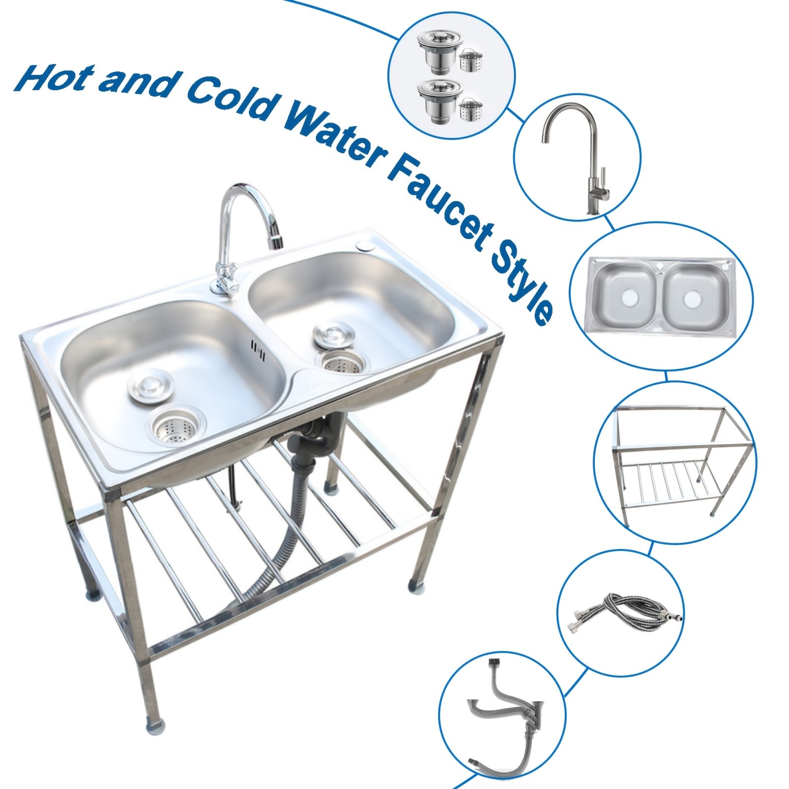 Edelstahlspüle, freistehendes Doppelschüssel-Küchenspülbecken mit Wasserhahn, Warm- und Kaltwasserrohr, Silber 75 * 40 * 83 cm