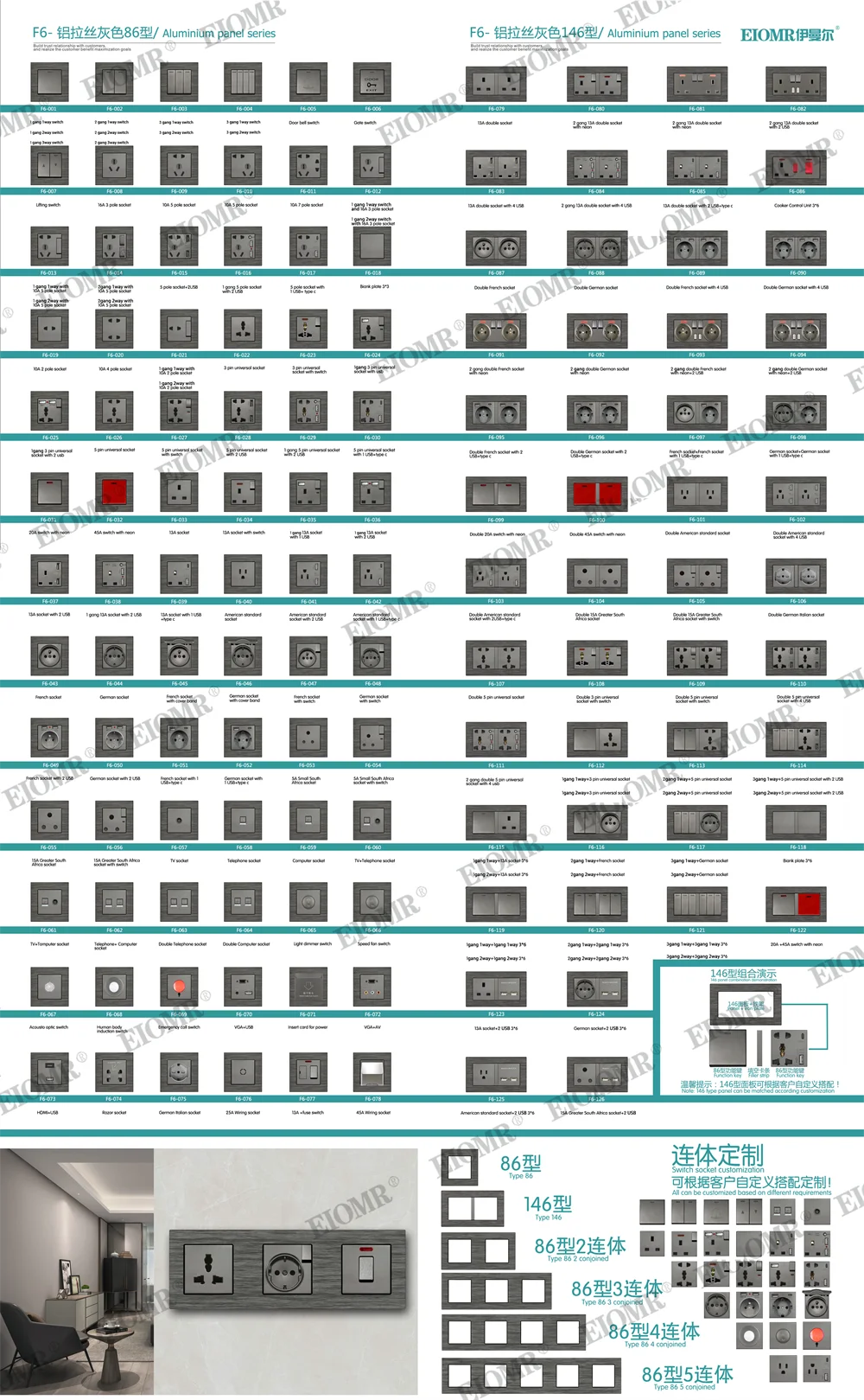 EIOMR Frankreich Standard-Steckdose, graue Aluminiumlegierung, Lichtschalter, RJ45, Fernseher, 220 V, 16 A, Wandsteckdosen für Haushaltsgeräte