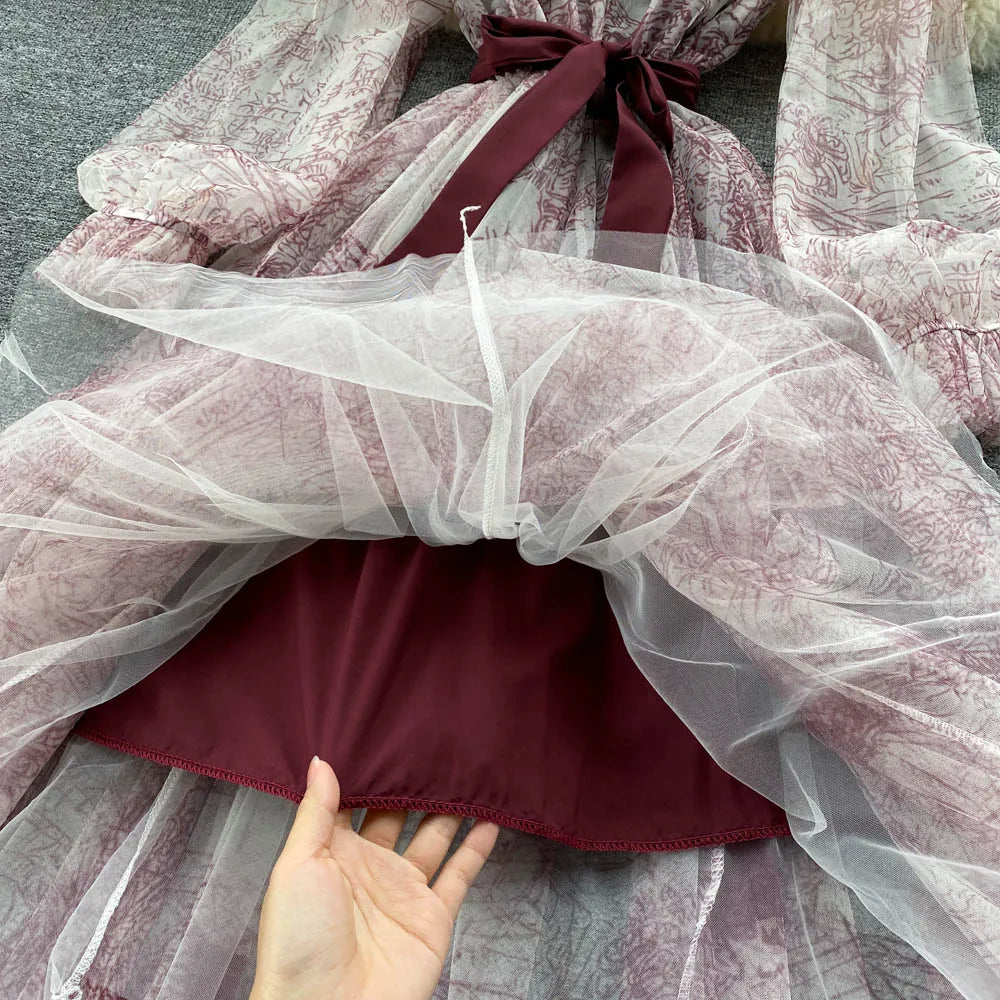 Elegante Frauen Mesh Kleid Vintage Laterne Ärmeln Gedruckt Party Kleider Frühling Sommer Patchwork A Line Bandage Strand Kleid