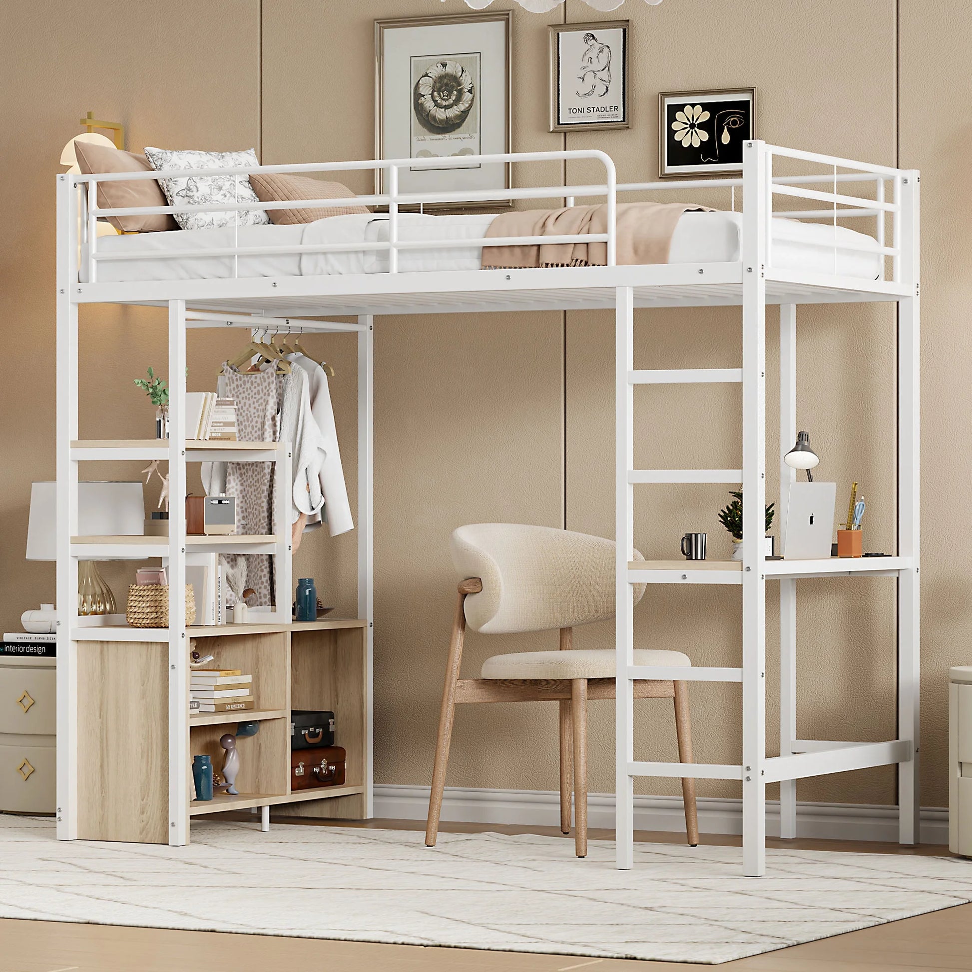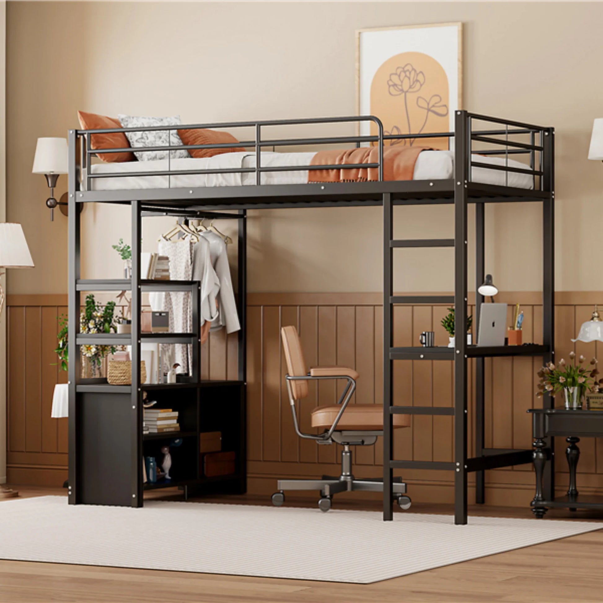 Etagenbett Hochbett 90x200cm mit Rausfallschutz, Kinderbett Bettgestell mitSchreibtisch und USB-Steckdose,