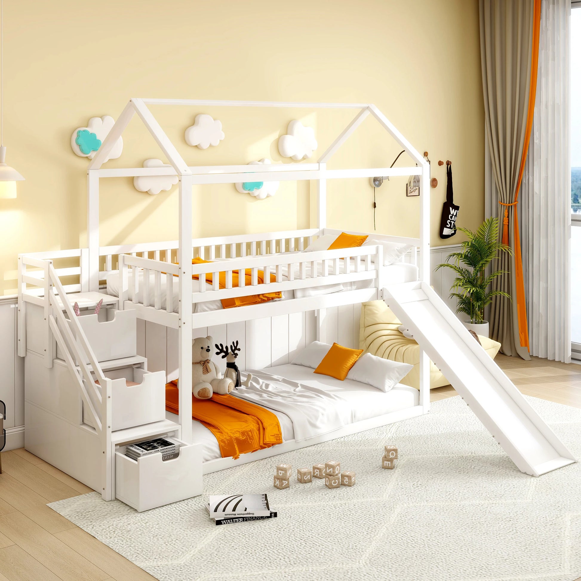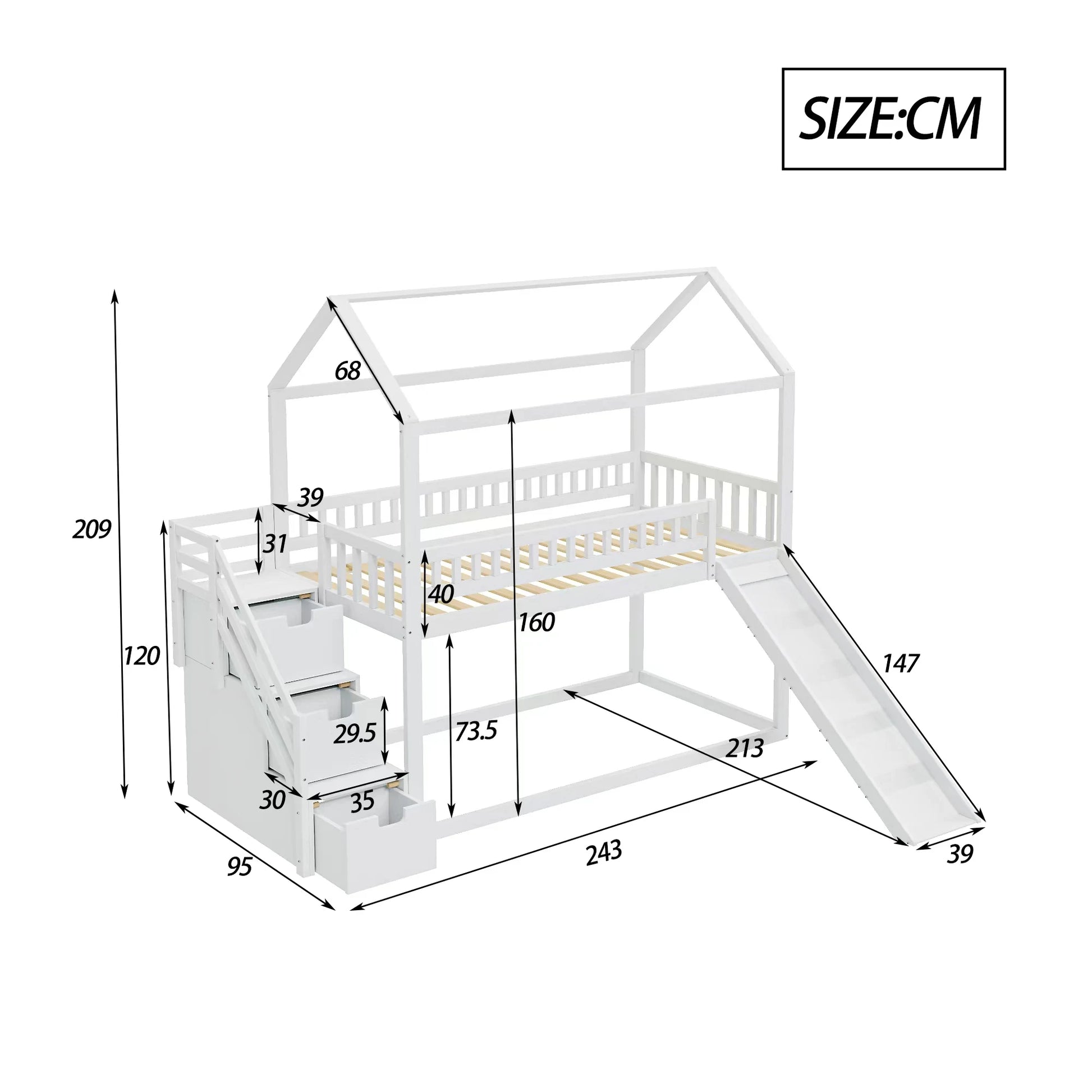 Etagenbett Stockbett 90x200cm mit Stauraumleiter, Hochbett mit Rausfallschutz, Kinderbett mit Lattenrost und Rutsche