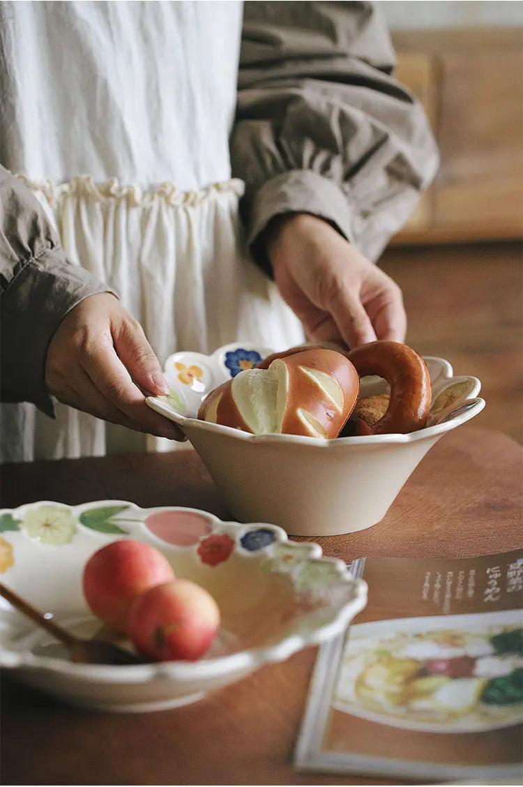 Floral Embossed Rim Soup Dessert Plate - Elegant Ceramic Appetizer Dish for Breakfast, Cafe Dining, Home Kitchen Tableware Set