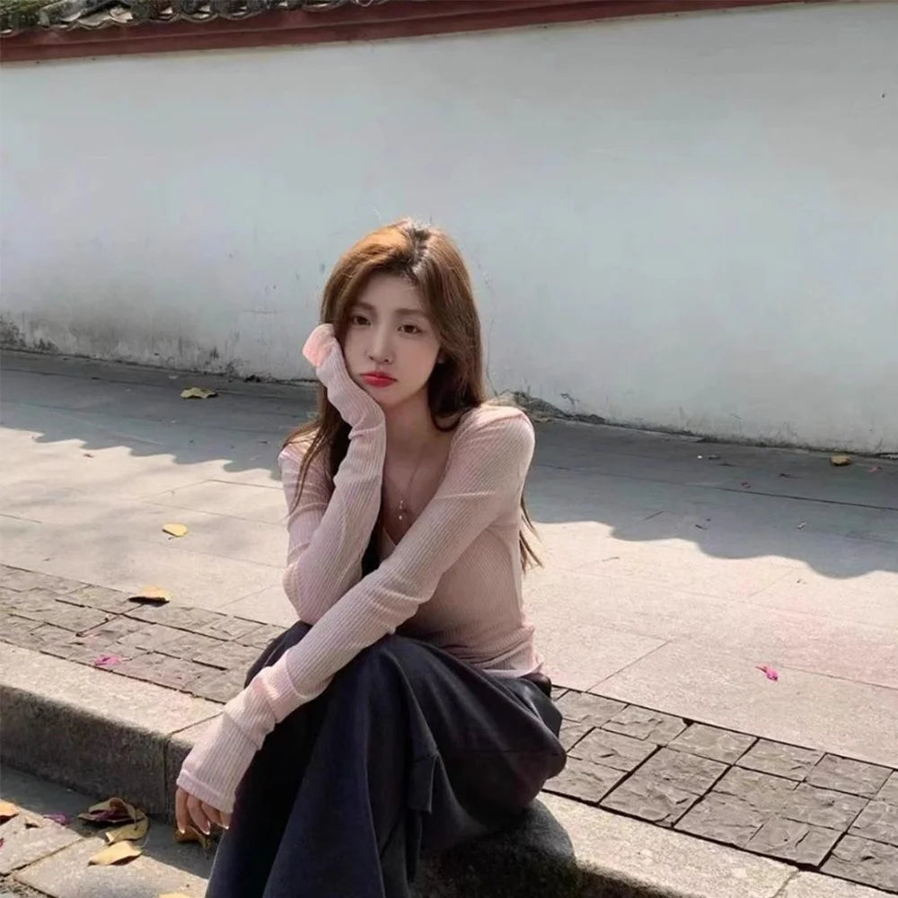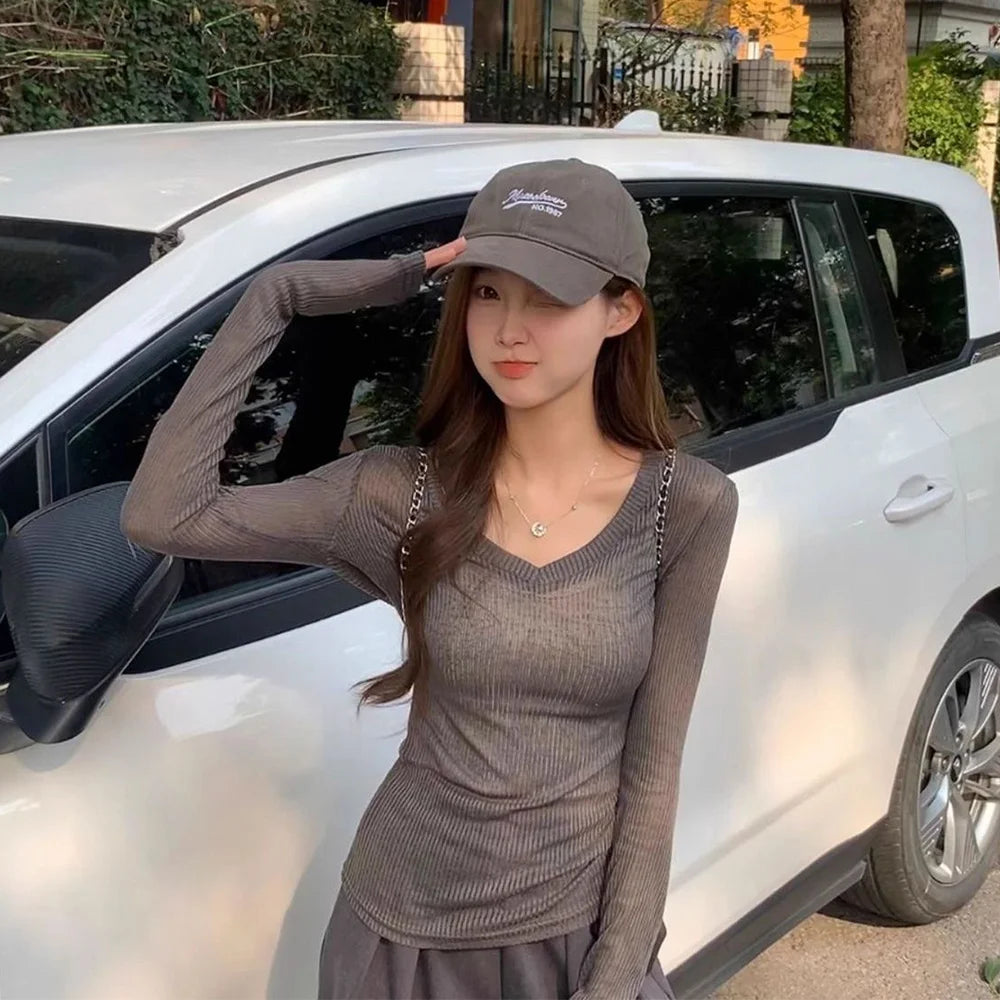 Frauen T-shirt Sexy V-ausschnitt Casual Langarm Slim Fit Shirts Dünne Transparente Gestrickte Top Weibliche Y2k Trendy Dünne Pullover