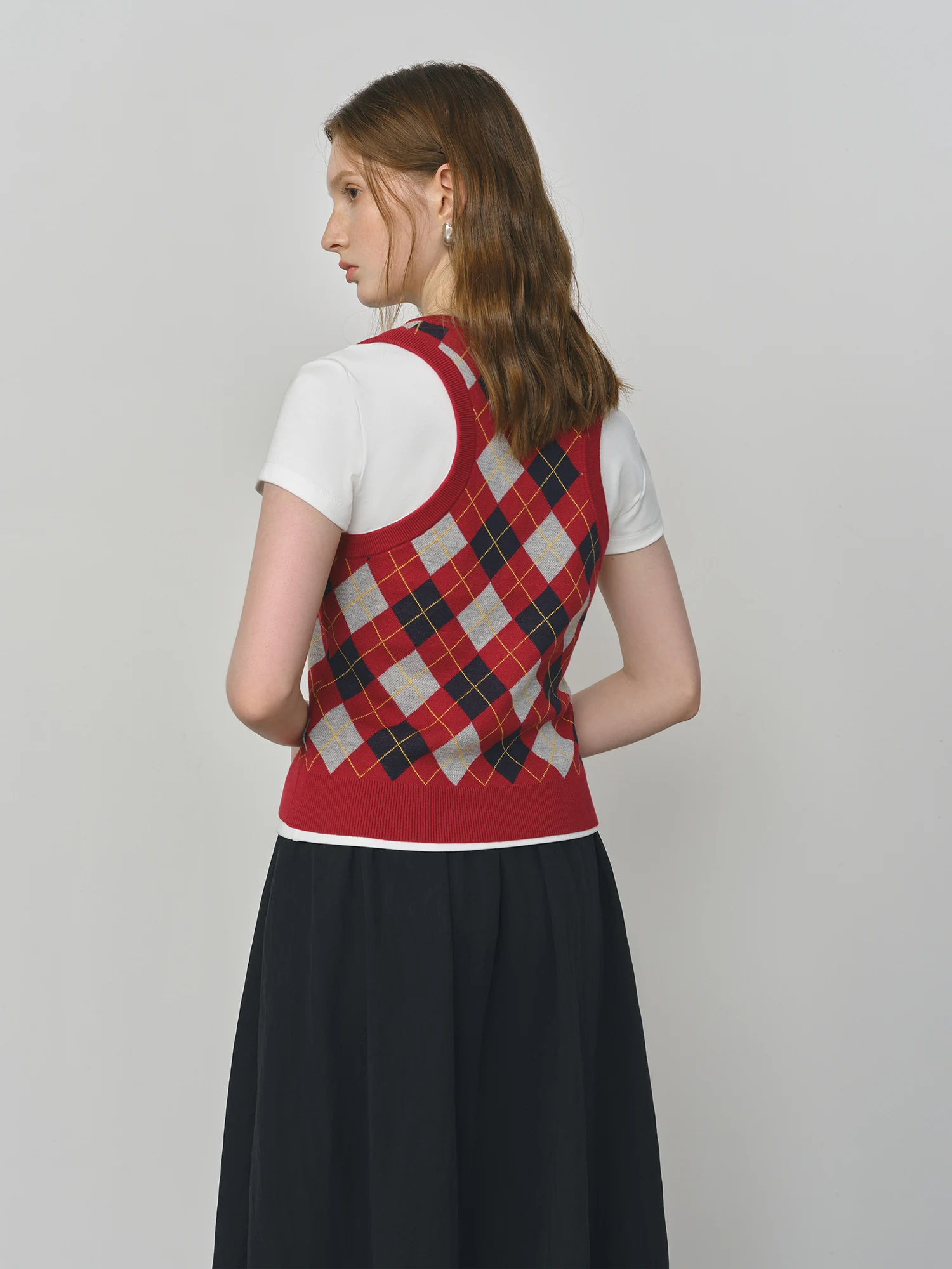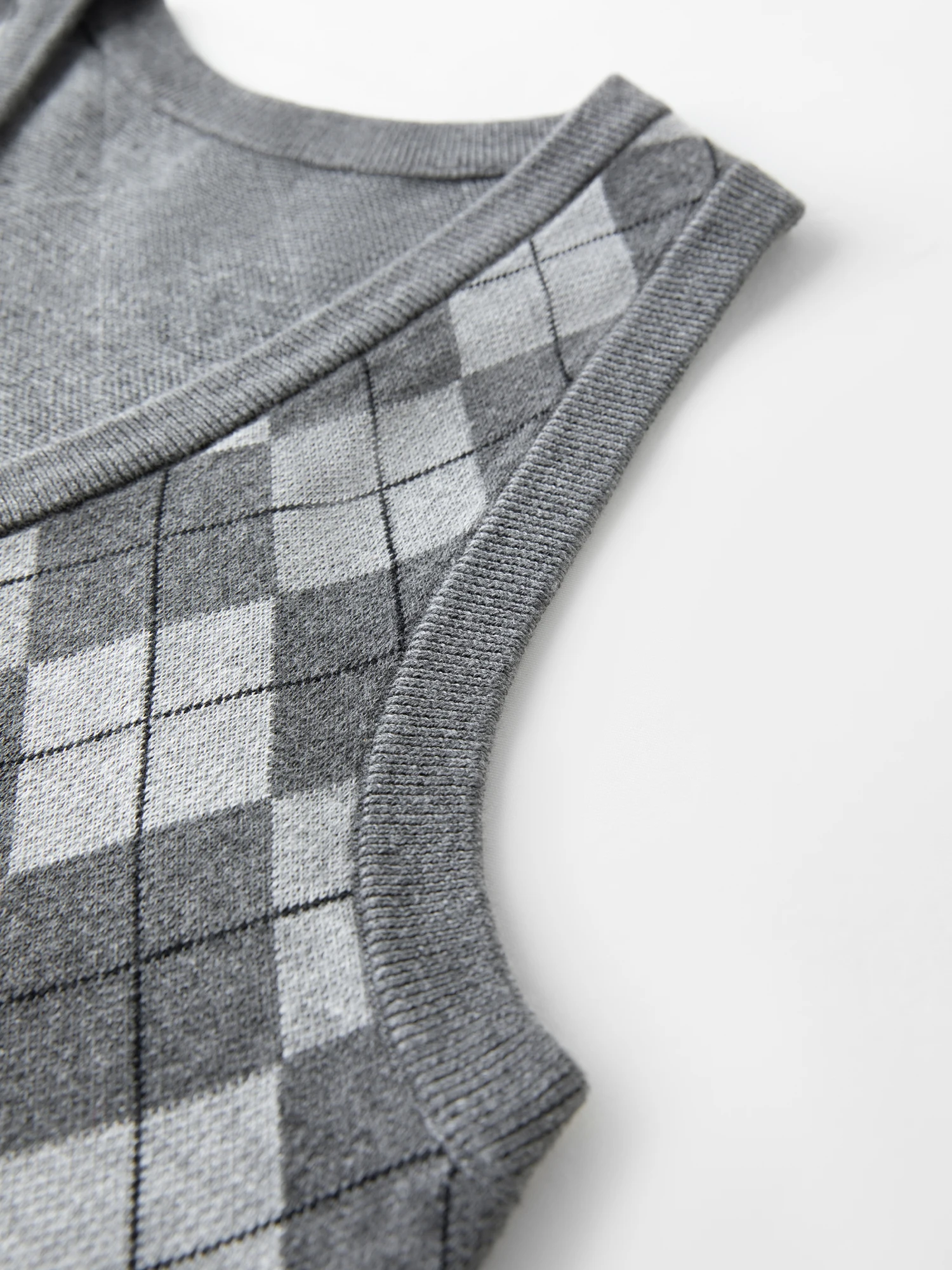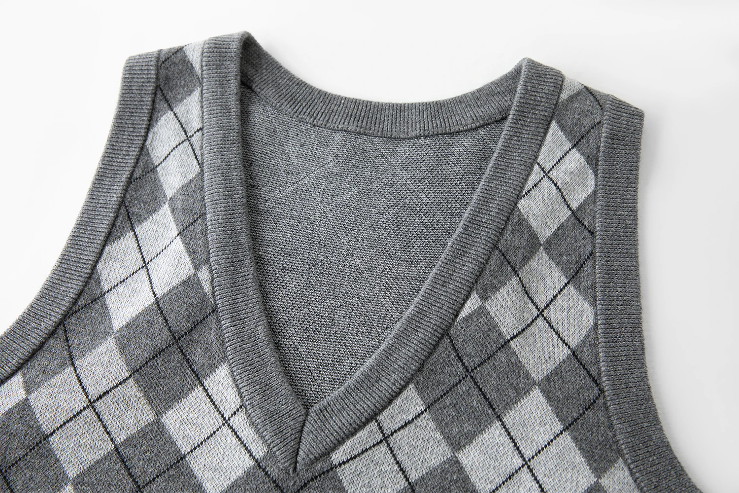 FSLE Plaid Rot Grau V-ausschnitt Gestrickte Weste Top für Frauen 2025, Herbst Neue Ankunft Retro College Stil Oberbekleidung Weste 25FS13248