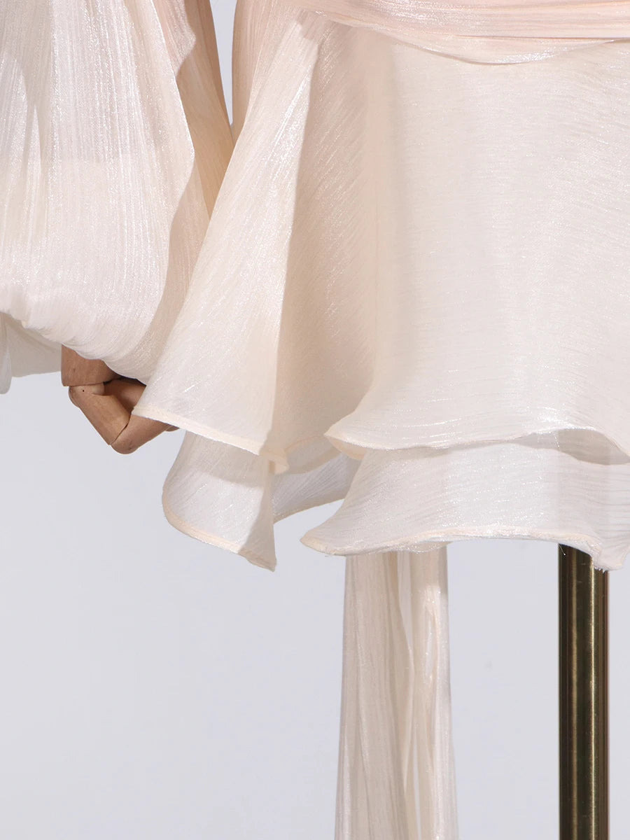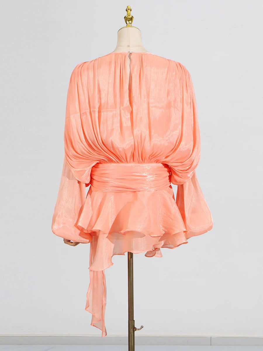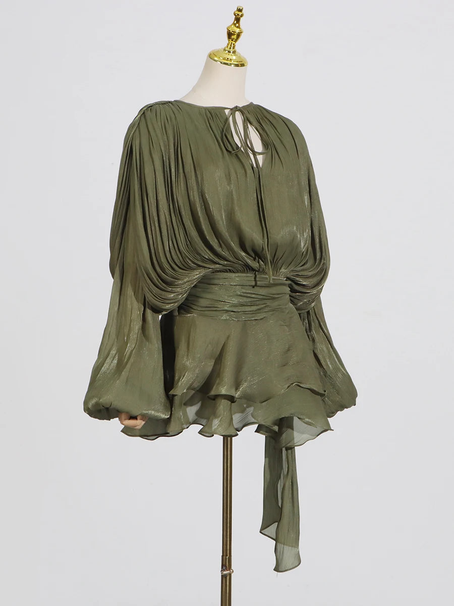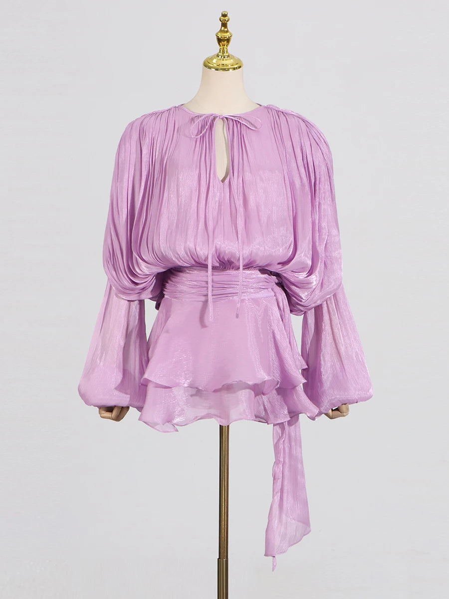 GALCAUR Solide Lose Splicd Lace Up Kleider Für Frauen V-ausschnitt Mit Langen Ärmeln Patchwork Rüschen Tunika Kleider Weibliche Mode Neue