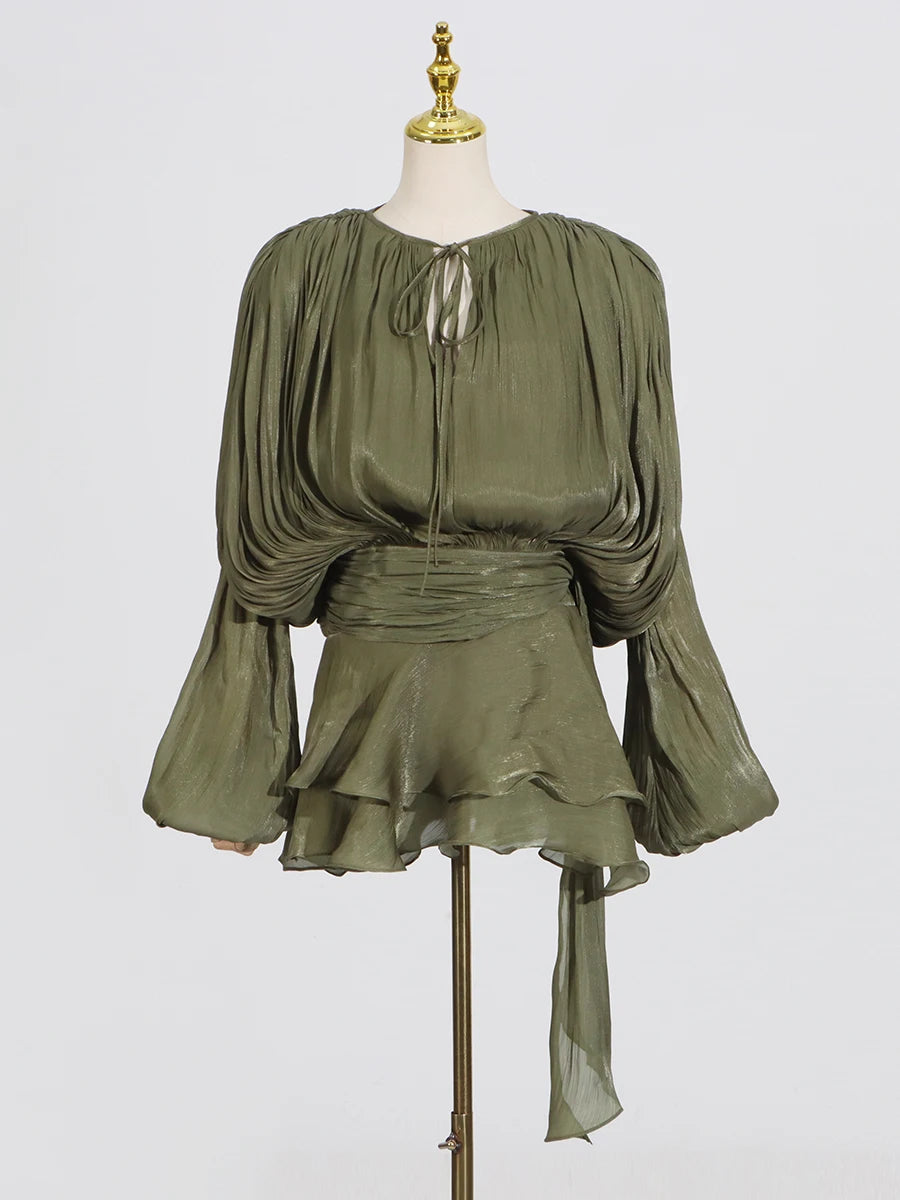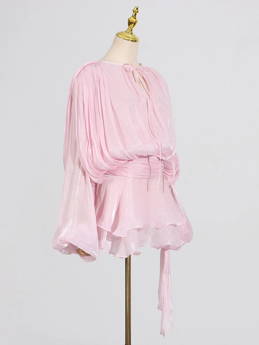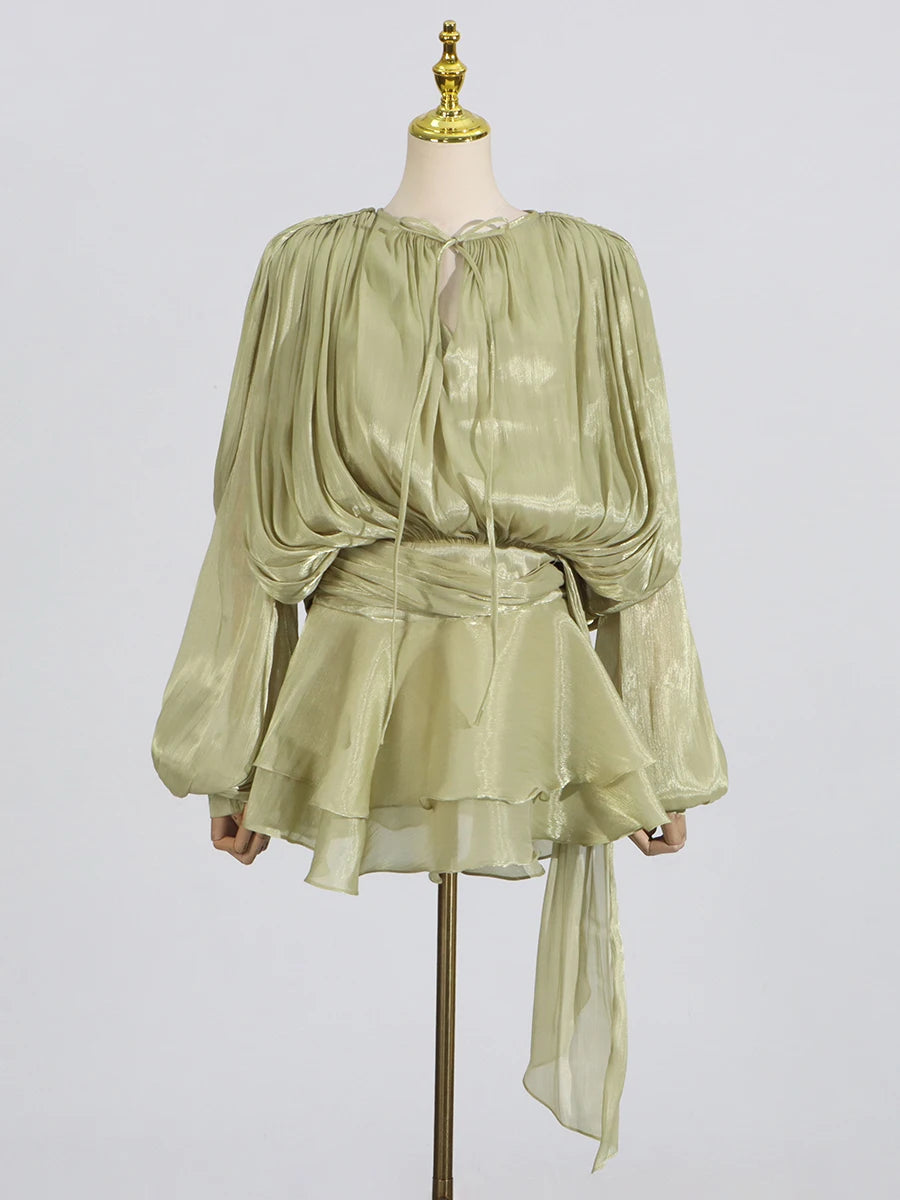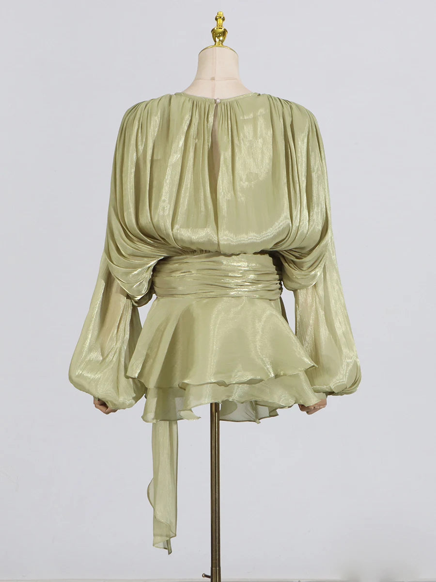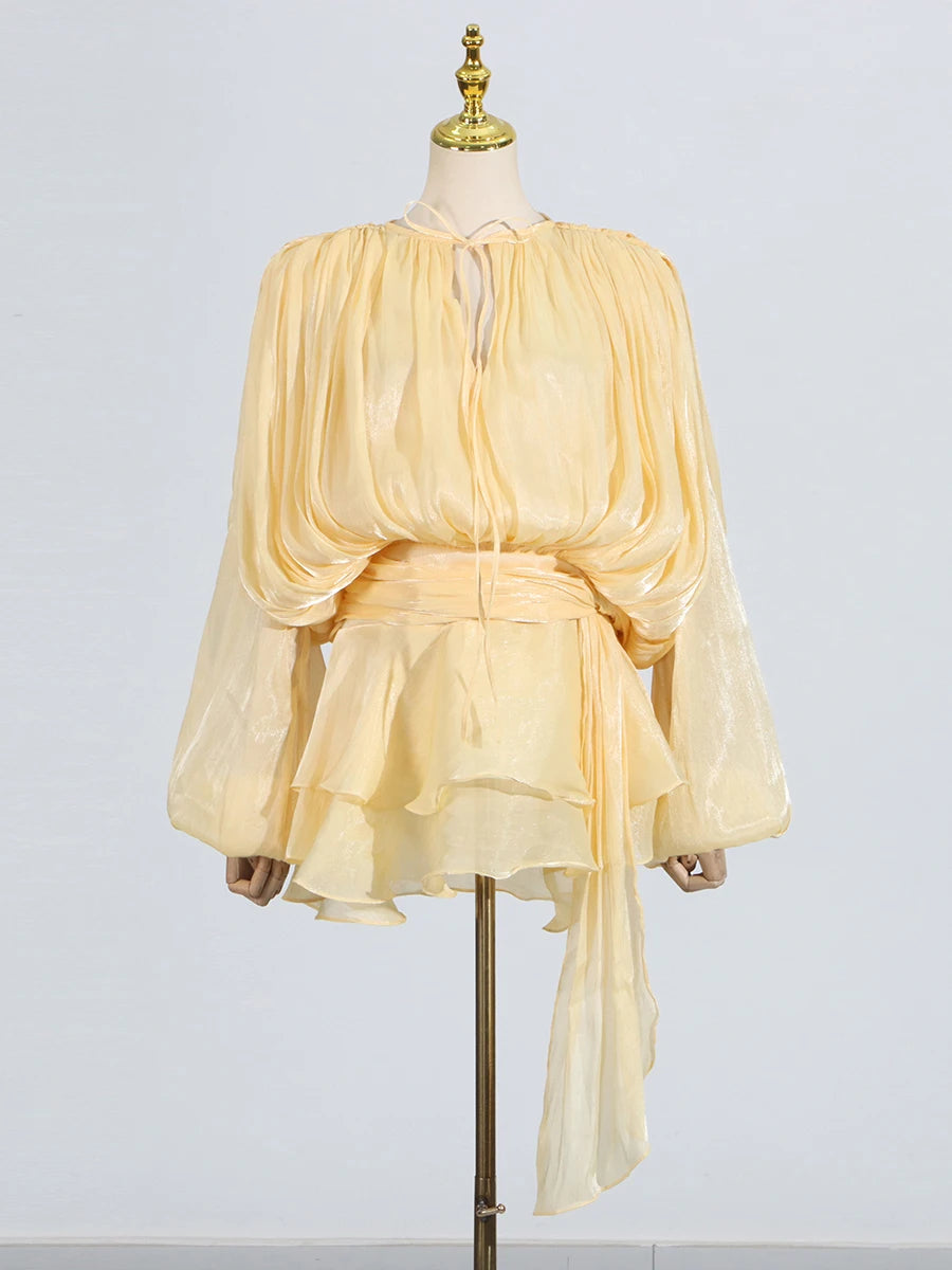 GALCAUR Solide Lose Splicd Lace Up Kleider Für Frauen V-ausschnitt Mit Langen Ärmeln Patchwork Rüschen Tunika Kleider Weibliche Mode Neue