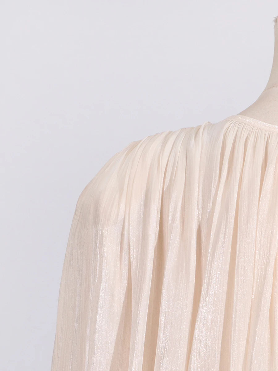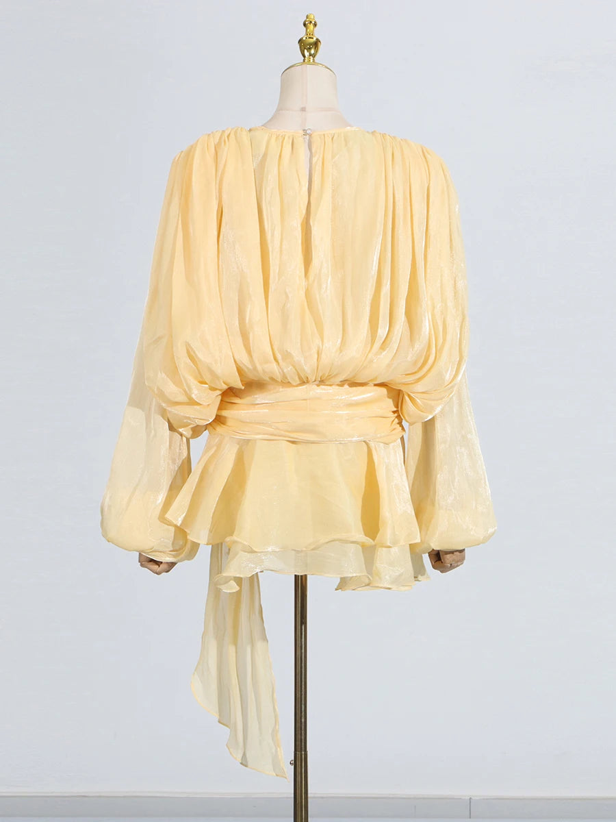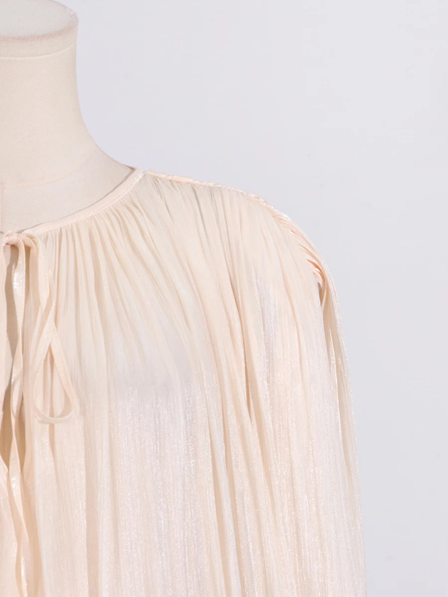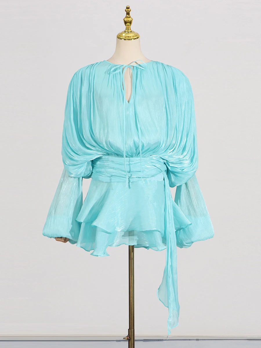 GALCAUR Solide Lose Splicd Lace Up Kleider Für Frauen V-ausschnitt Mit Langen Ärmeln Patchwork Rüschen Tunika Kleider Weibliche Mode Neue