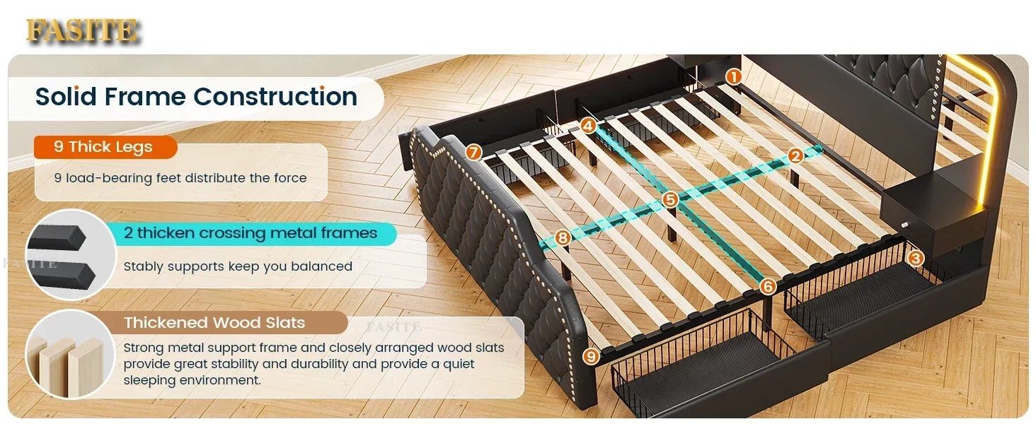 Gepolsterter Queensize-Bettrahmen aus PU-Leder mit tiefem, getuftetem Kopfteil und Kopfteilen für Schlafzimmer, schwarzer Plattform-Bettrahmen