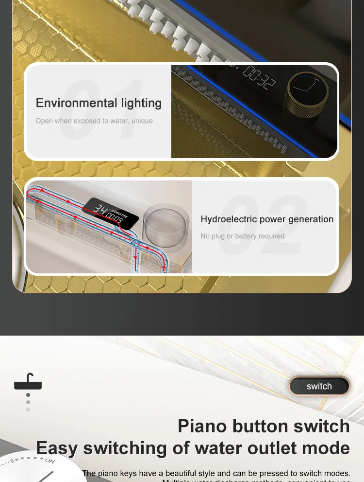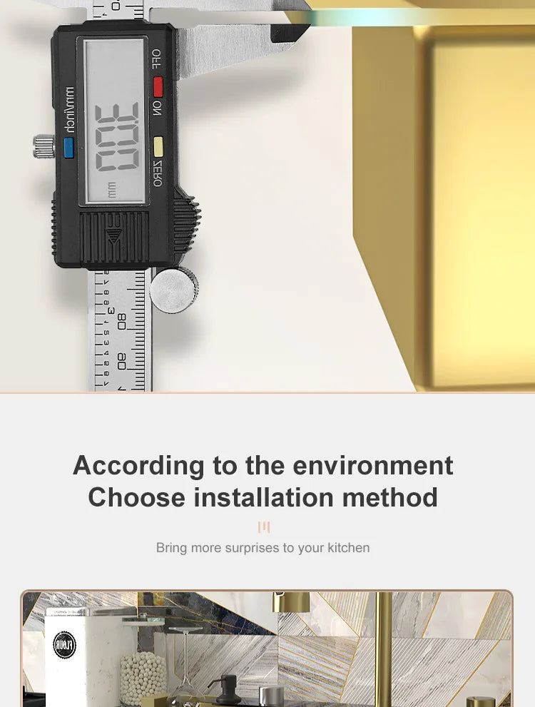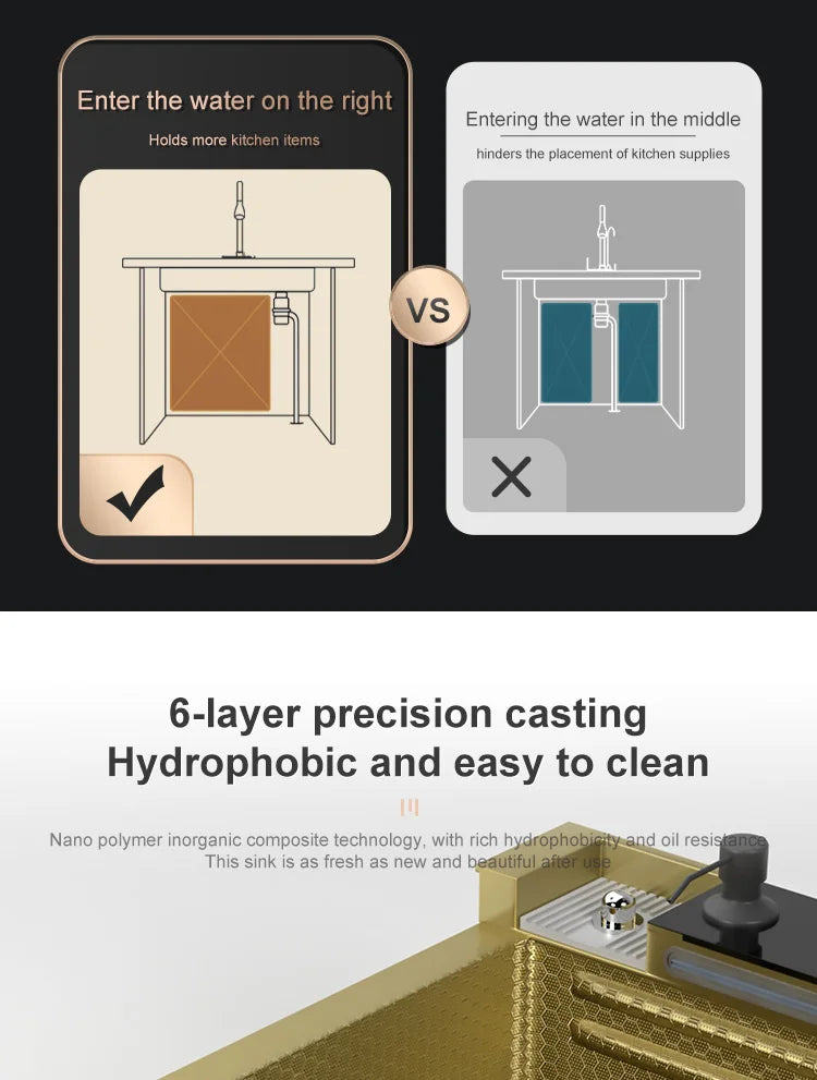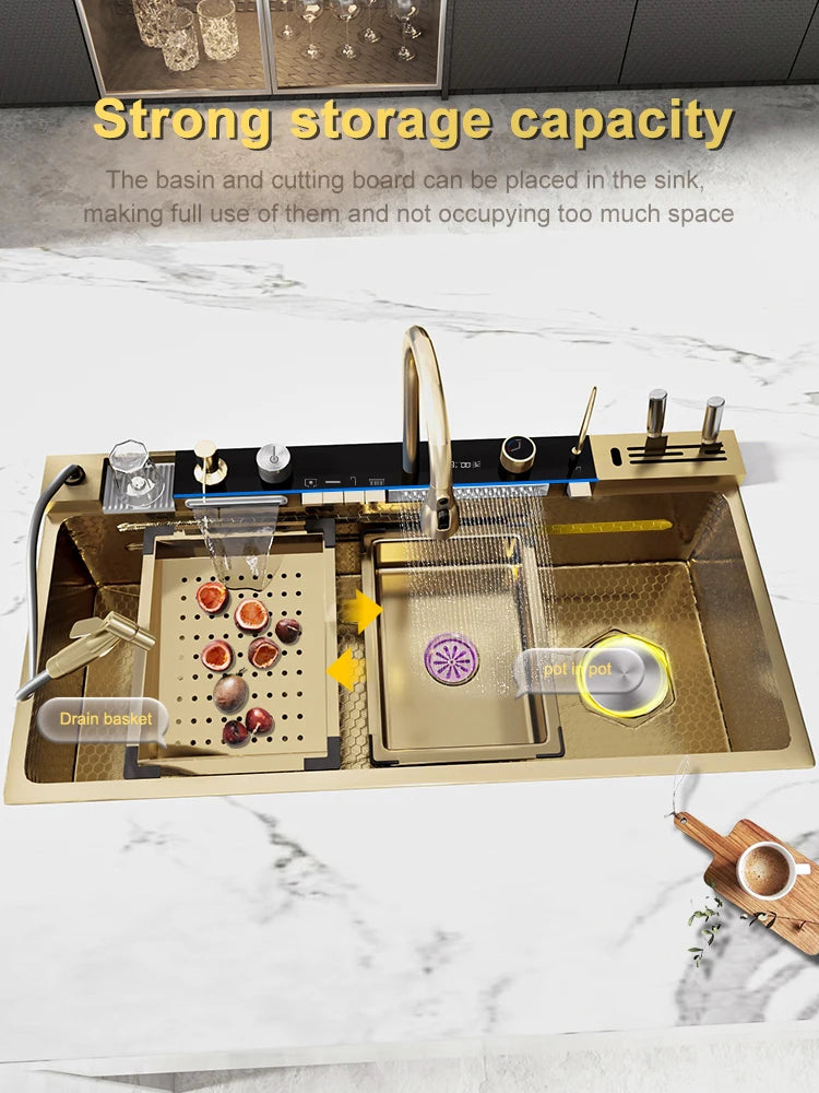 Golden Stainless Steel Waterfall Kitchen Sink Gold Embossed Extra Large Single Slot Digital Display Dishwashing Basin 100x50cm