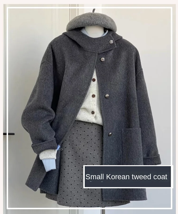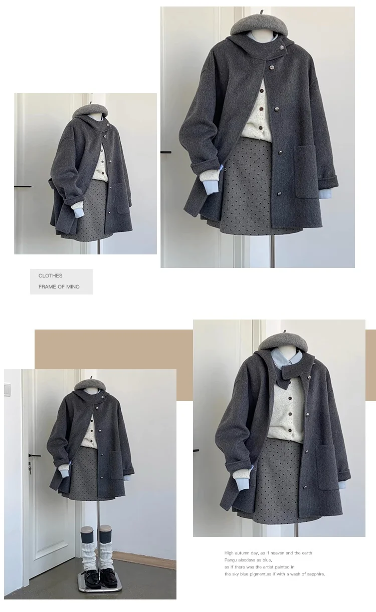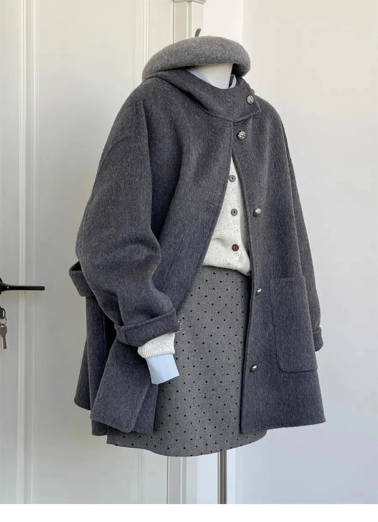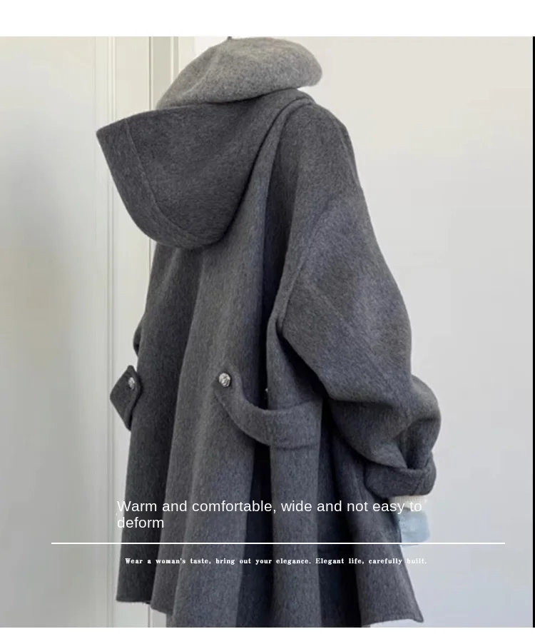 Grauer doppelseitiger Wollmantel mit Kapuze für Damen im Herbst und Winter 2025, neuer High-End-Mantel im Hepburn-Stil