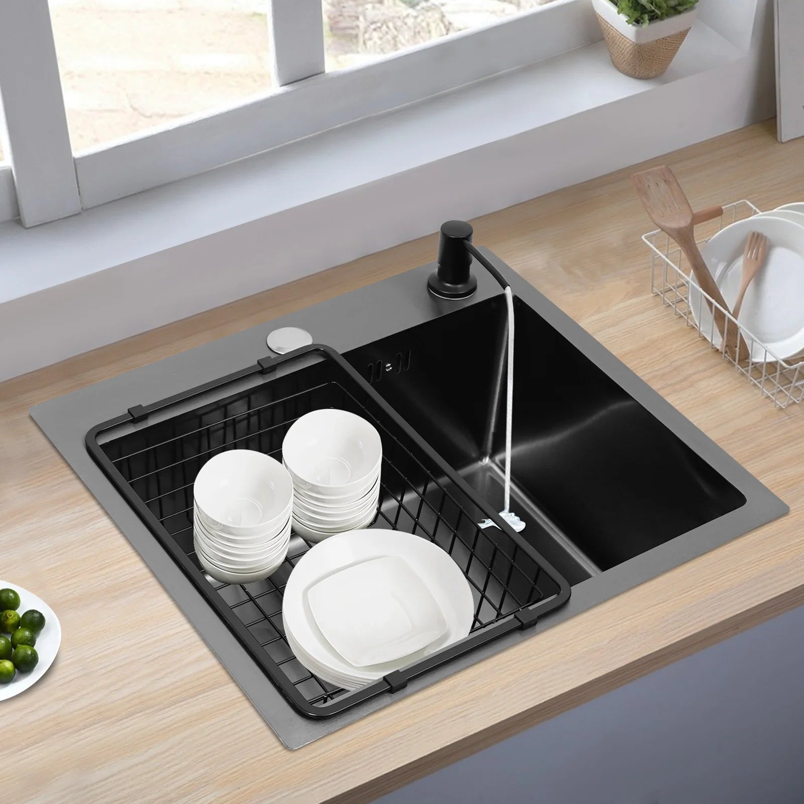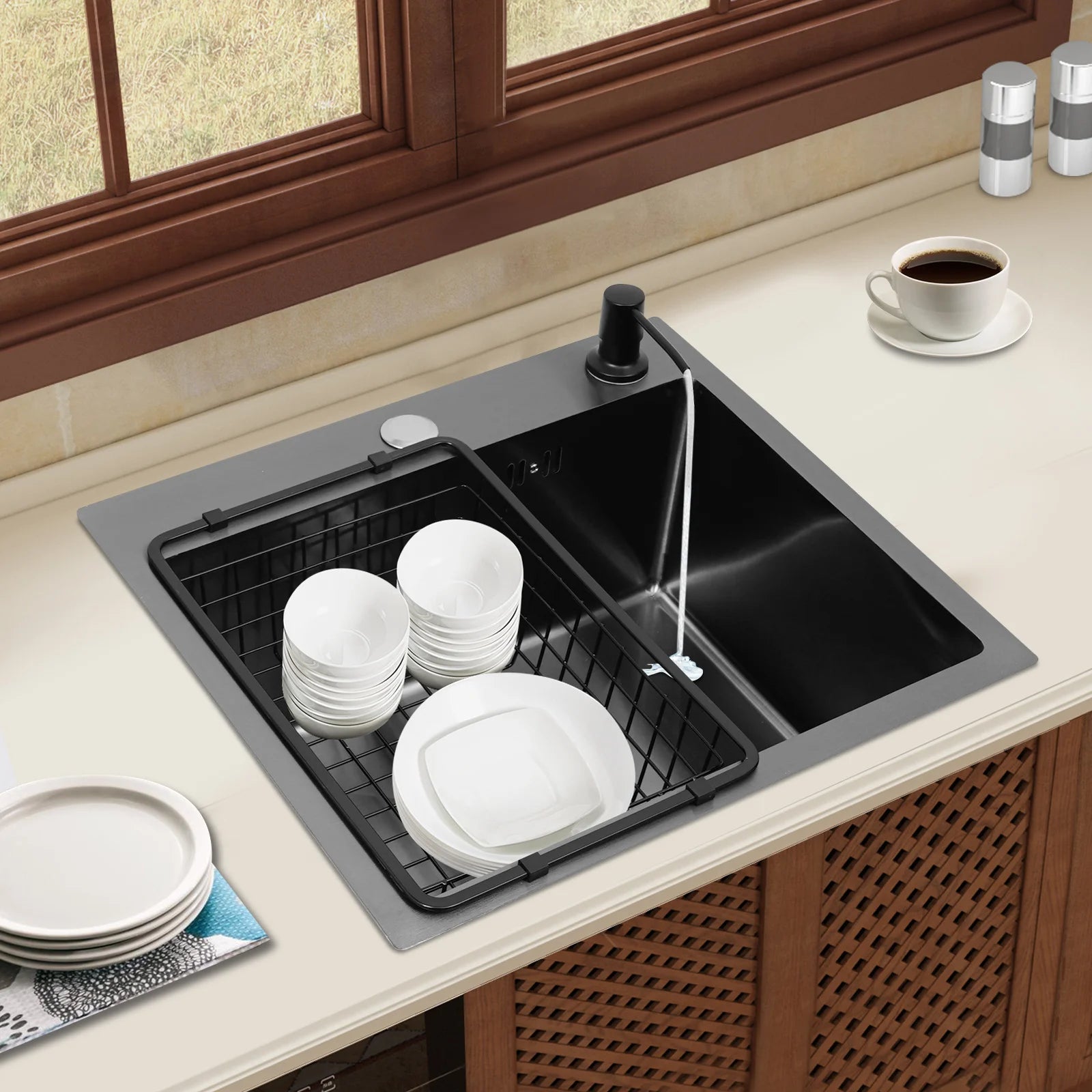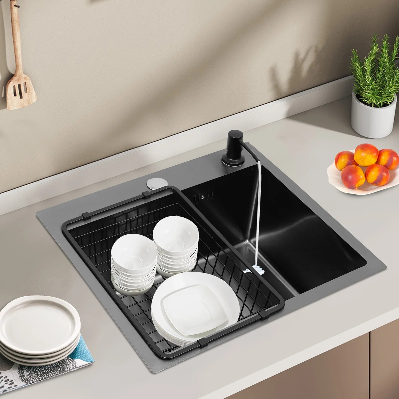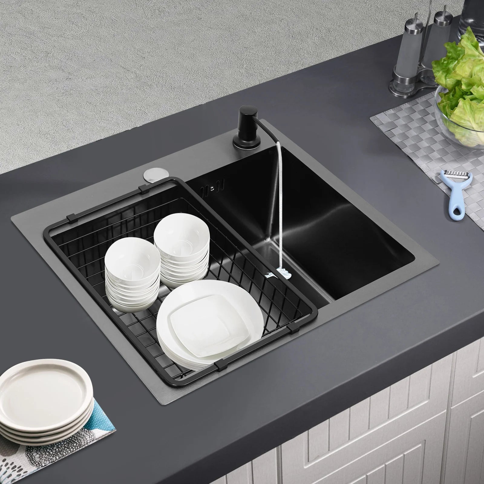 Hochwertiges Küchenspülbecken-Komplettset, 45 x 40 x 20 cm, langlebiges, großes Fassungsvermögen-Reinigungsspüle aus Edelstahl 201, schwarze Spüle mit einer einzigen Schüssel