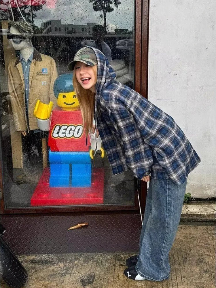 HOUZHOU Vintage Plaid Shirts Women Harajuku Long Sleeve American Style Drawstring Hooded Blouses Loose Casual Streetwear Spring