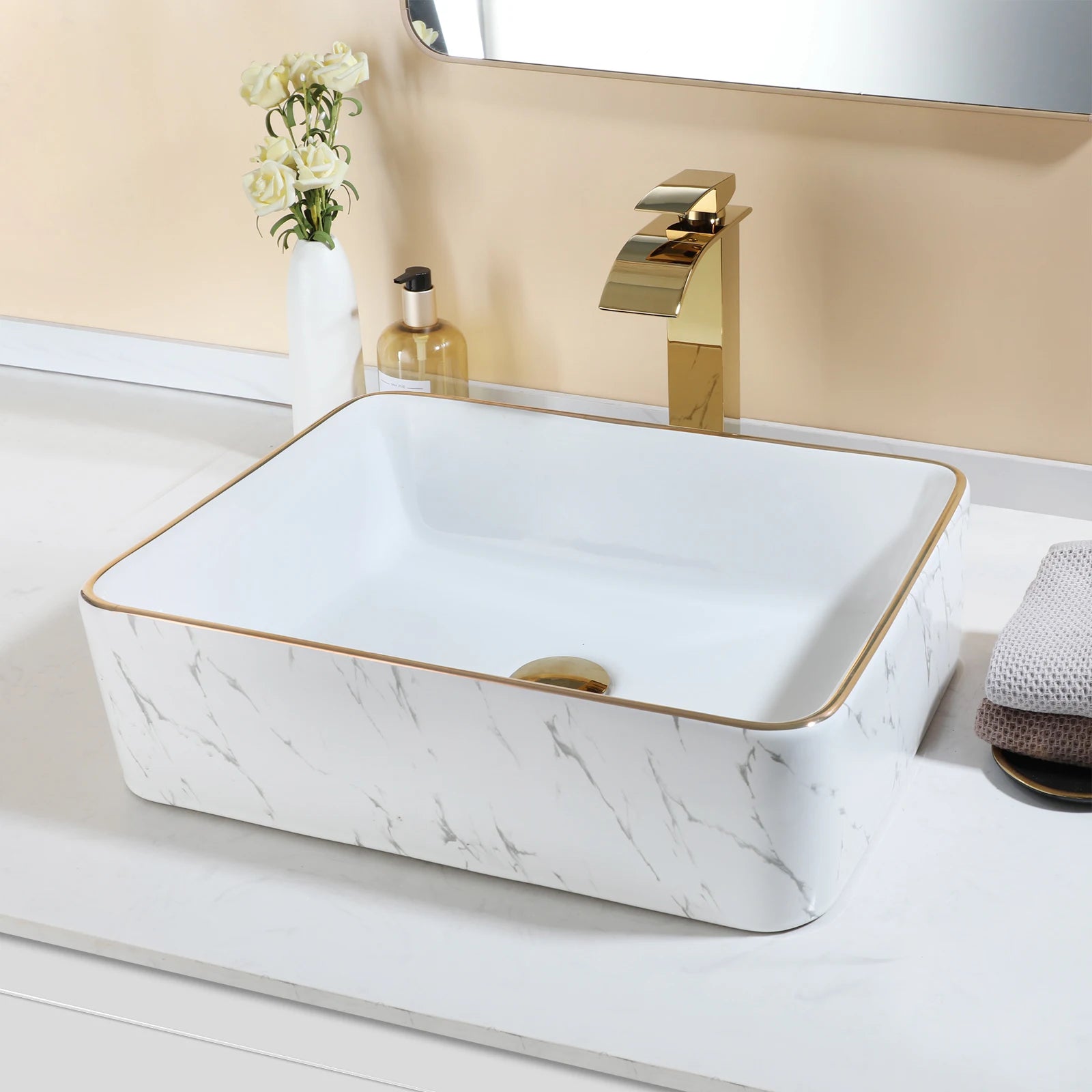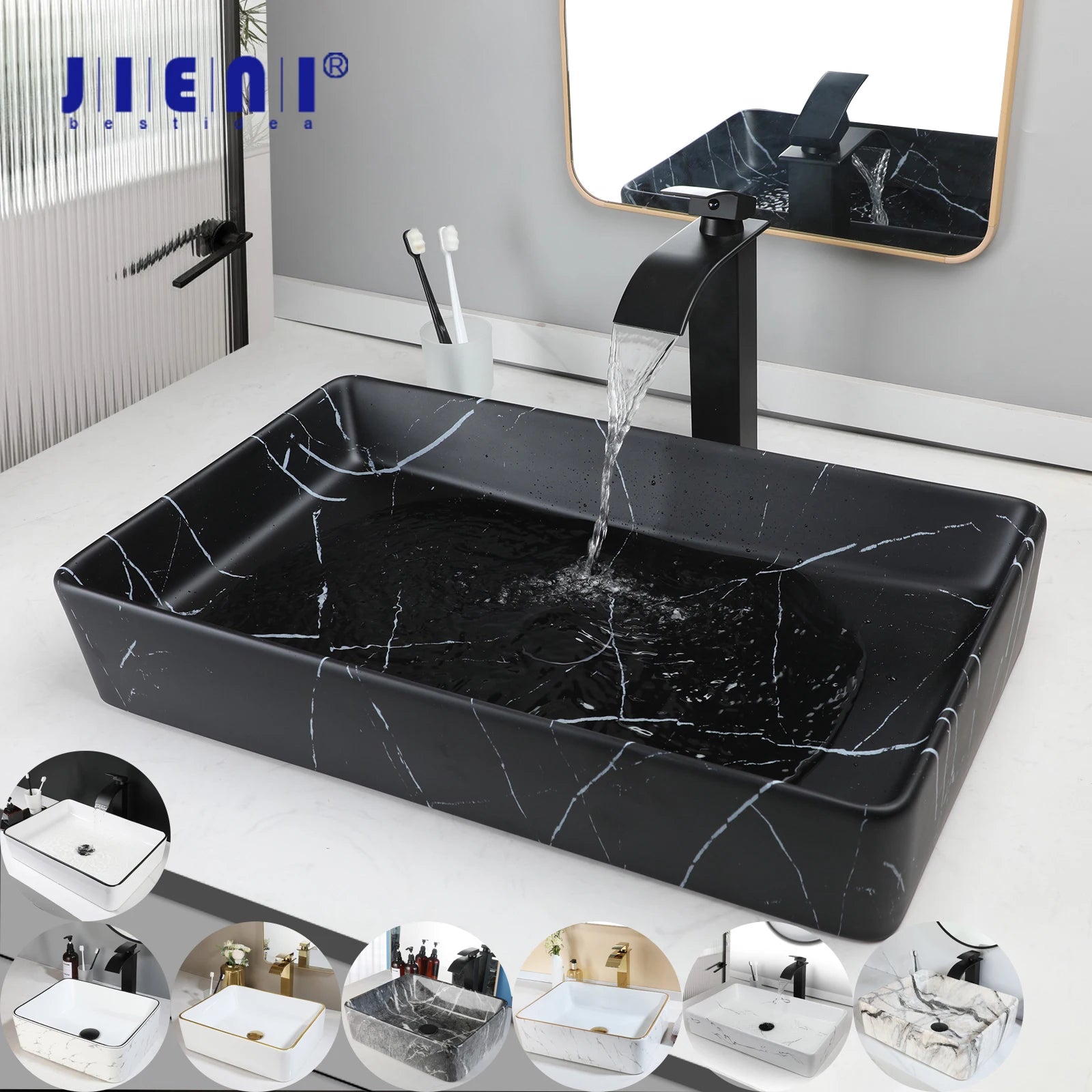 JIENI Keramik-Badezimmer-Waschbecken-Set, quadratisch, Porzellan, Arbeitsplatte, Waschbecken, Wasserhahn, Pop-Up-Abfluss, kombiniertes modernes Waschbecken-Set
